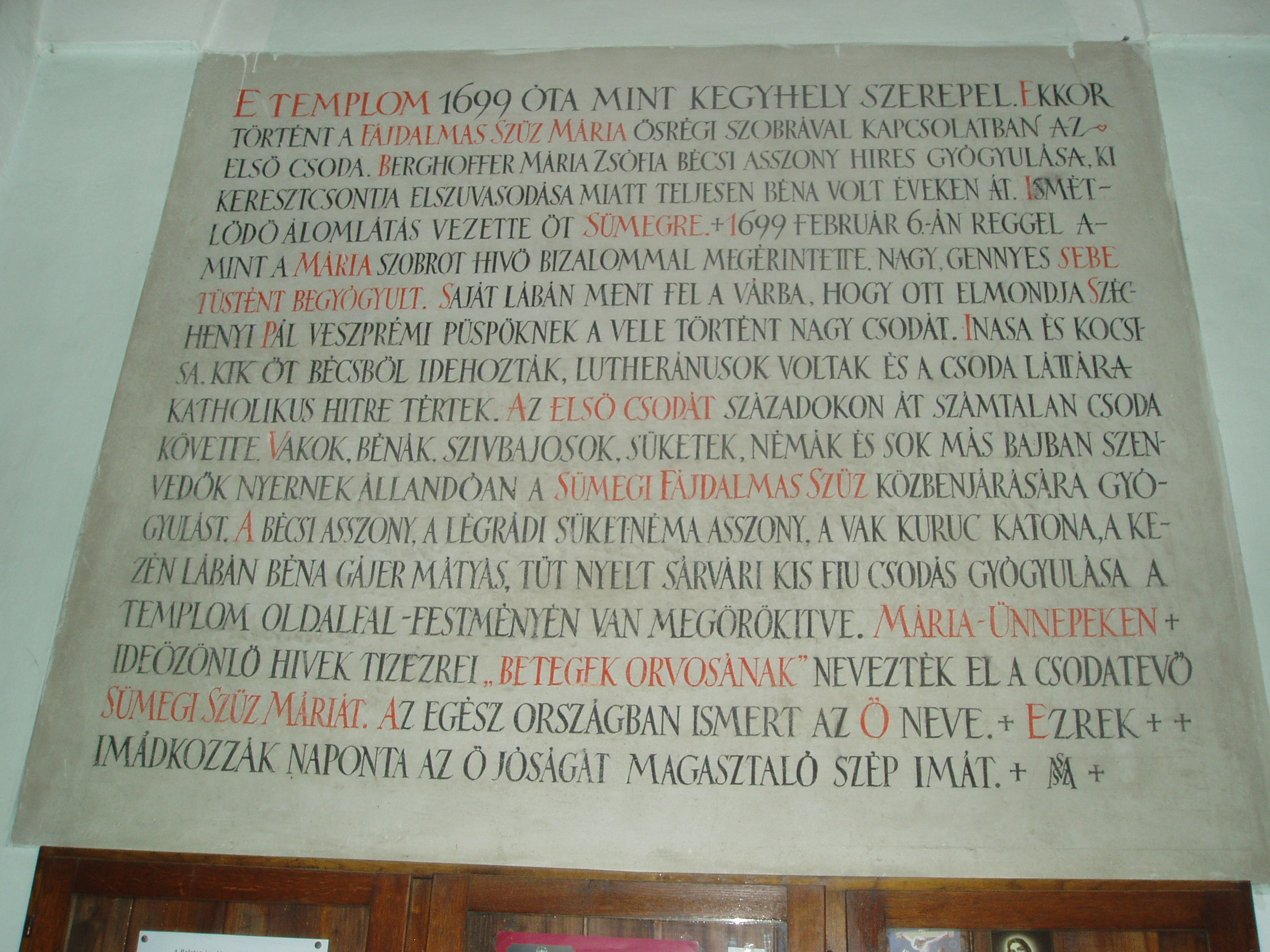 Nyilvános 999 | 1692 | Sümeg, Szent István tér 7. Ferences templom | A ferences kolostor és templom épülettömbje a vár után (lásd: Sümeg, Vár) Sümeg legrégibb műemléke. A ferences atyákat a XVII. közepén Széchenyi György püspök hozta Sümegre a török elől idemenekült lakosság kedvéért. 1649 körül először az egyhajós, akkor még torony nélküli templom épült meg. A hozzá tartozó vastag falú, erődítmény jellegű kolostor néhány évvel később lett készen. A templom tornya és két oldalkápolnája 1724-33 között épült. Kiemelkedő értéket képvisel a két oldalkápolna kovácsoltvas kapuzata. (Sajnos, a templomot kívülről nem tudtam lefényképezni, szinte teljesen eltakarják a lombok. Talán majd egyszer télen... K. K.) Itt működött a XVII. századi ellenreformáció egyik fontos dunántúli központja. A szerzetesek járták a végvárakat és falvakat, s fejtettek ki térítő, illetve szociális tevékenységet, a kolostorban pedig messze vidéken híres hitvitákat tartottak. A lakosság kedvelte a ferences atyákat, akik a szegénység vállalása mellett a tudomány művelői, egyes tagjaik pedig a haza védelmében vitéz kardforgatók voltak. A templomot 1699 óta kegytemplomként is számon tartják. Ebben az évben ugyanis itt gyógyult meg a bécsi Berghoffer Mária, s a gyógyulást a templom főoltárán elhelyezett, a XVI. század elején faragott Pieta-szobornak tulajdonították. E szobor, mely a XVIII. században lebontott Szent Katalin-templomból származik, tűzvész következtében többször is megsérült, s helyreállításra szorult. A fénykép 2007 júniusában készült. Felh. irod.: Koppány Tibor - Kozák Károly: Sümeg útikalauz. Veszprém, Idegenforgalmi Hivatal, 1965 Látnivalók Veszprém megyében. Miskolc, Well-PRess, 2004 Sümegi kalauz. Sümeg, Sümegi Fórum alapítvány, 1993 Hőgyész László: Sümeg évszázadai. Veszprém, 1989 |