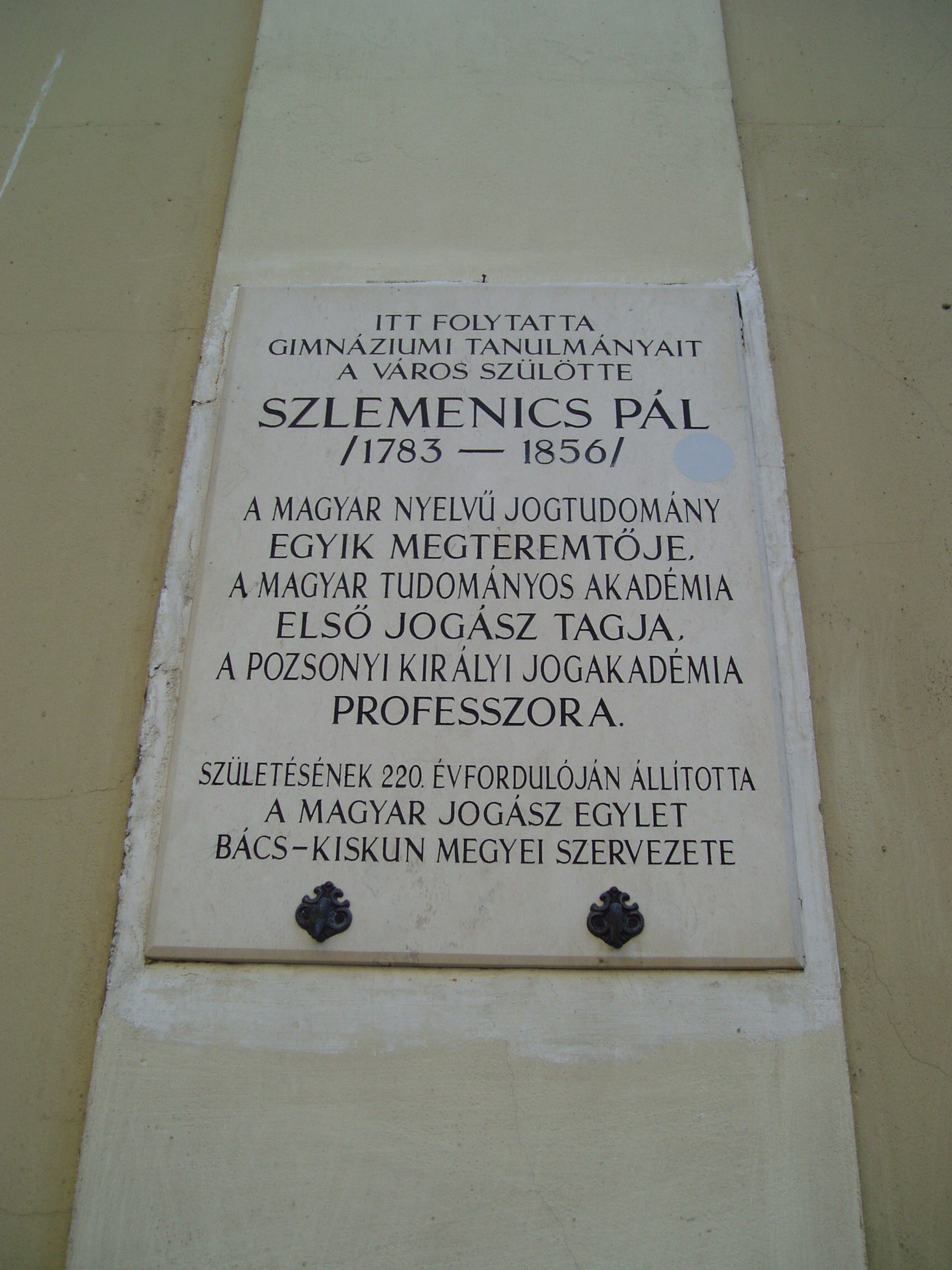Nyilvános 1077 | 1680 | Kecskemét, Jókai utca 1. Piarista rendház és kollégium | A műemléki védelemmel óvott piarista rendház a mellette álló templommal együtt a város legszebb barokk épületegyüttese. A piarista atyákat a város egyik földesura, gróf Koháry István telepítette le Kecskeméten a XVIII. század elején, s 1712-ben alapítványt is tett templomuk, rendházuk és iskolájuk felépítésére. Az épületegyüttes fokozatosan, több ütemben készült el. A templomot nagy valószínűséggel Mayerhoffer András tervezte. Az oktatást a templom bal oldalán álló, 1720 és 1725 között, Paithmüller József tervei alapján emelt rendház helyiségeiben kezdték el. A jobb oldali iskolai szárnyat 1825–1832 között emelték, majd folyamatosan bővítették az épületet. Tanítás 1933-ig folyt benne. Ide járt iskolába 1804 és 1807 között Katona József, 1813-1815 között Táncsics Mihály, 1833-34-ben Klapka György, később Sík Sándor. Itt tanult az 1780-as években Szerelemhegyi Liebenberger András, a magyar zenés játék megteremtője, karnagy, valamint testvére, Lunkányi (Liebenber) János, Széchenyi István nevelője, műveinek első bírálója. A képen Szlemenics Pál (1783-1856) emléktáblája látható. A magyar nyelvű jogtudomány egyik megteremtője, a Magyar Tudományos Akadémia első jogász tagja, a pozsonyi Királyi Jogakadémia kecskeméti születésű professzora is ide járt gimnáziumba. A fénykép 2006 augusztusában készült. Felh. irod.: Heltai Nándor: Kecskemét. Kecskeméti Lapok, 1998 |