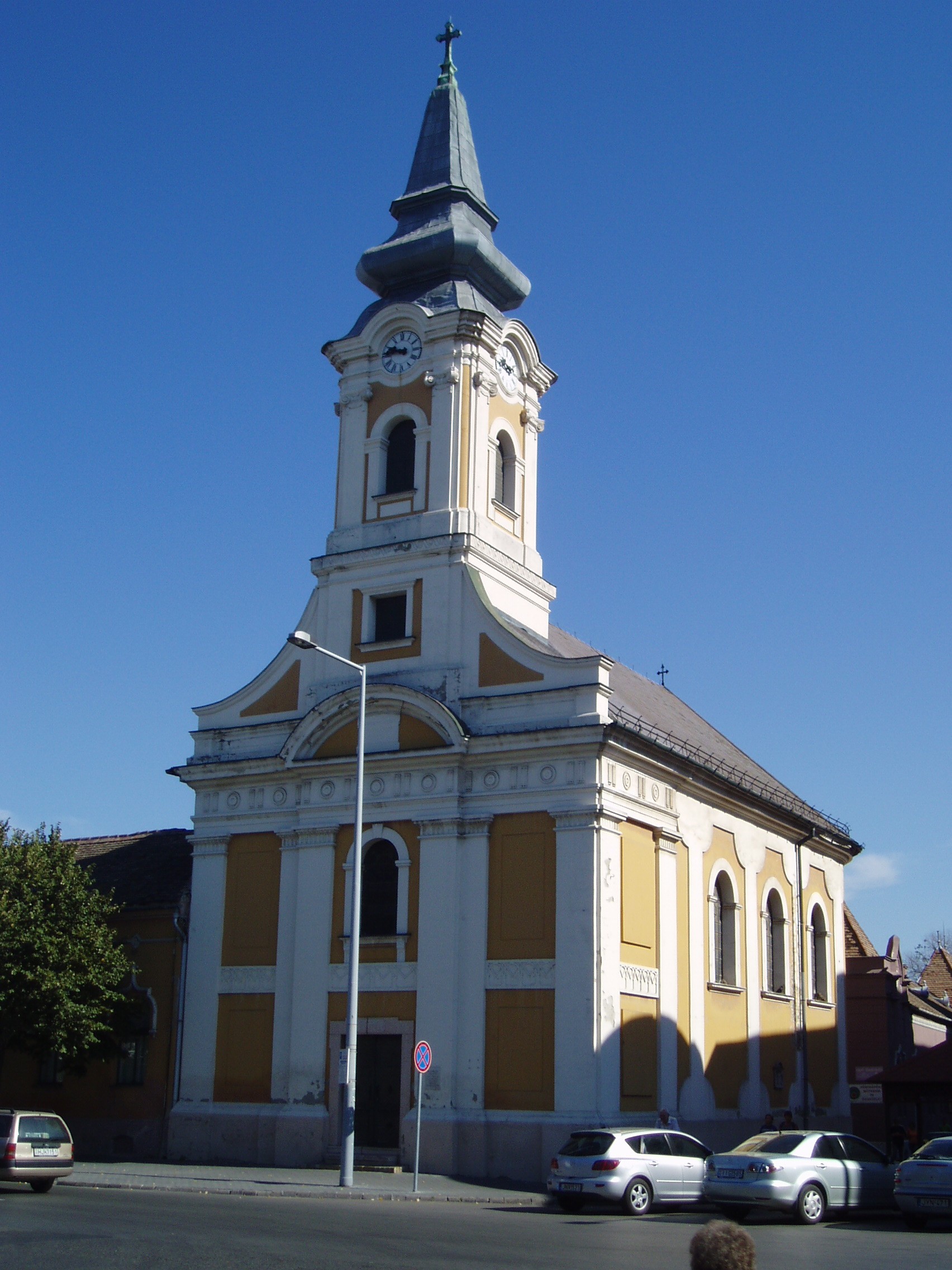 Nyilvános 1061 | 2025 | Kecskemét, Széchenyi tér: Ortodox templom | Az Öregtemplommal rézsút szemben álló kicsiny, barna és fehér vakolású templomot a városba letelepedett görög és szerb kereskedők építették. A görög családok a 17. és 18. század fordulóján Kozániából és Sziatisztából a török elől menekültek az magyar Alföld ezen részére. A templom helyén a török uralom alatt dzsámi működött, annak tégláiból épült a mai templom elődje, majd 1824-től 29-ig - Fischer Boldizsár tervei szerint - klasszicista stílusban a jelenlegi temlom. A fénykép 2006 augusztusában készült. Felh. irod.: Heltai Nándor: Kecskemét. Kecskeméti Lapok, 1998 www.templom.hu |