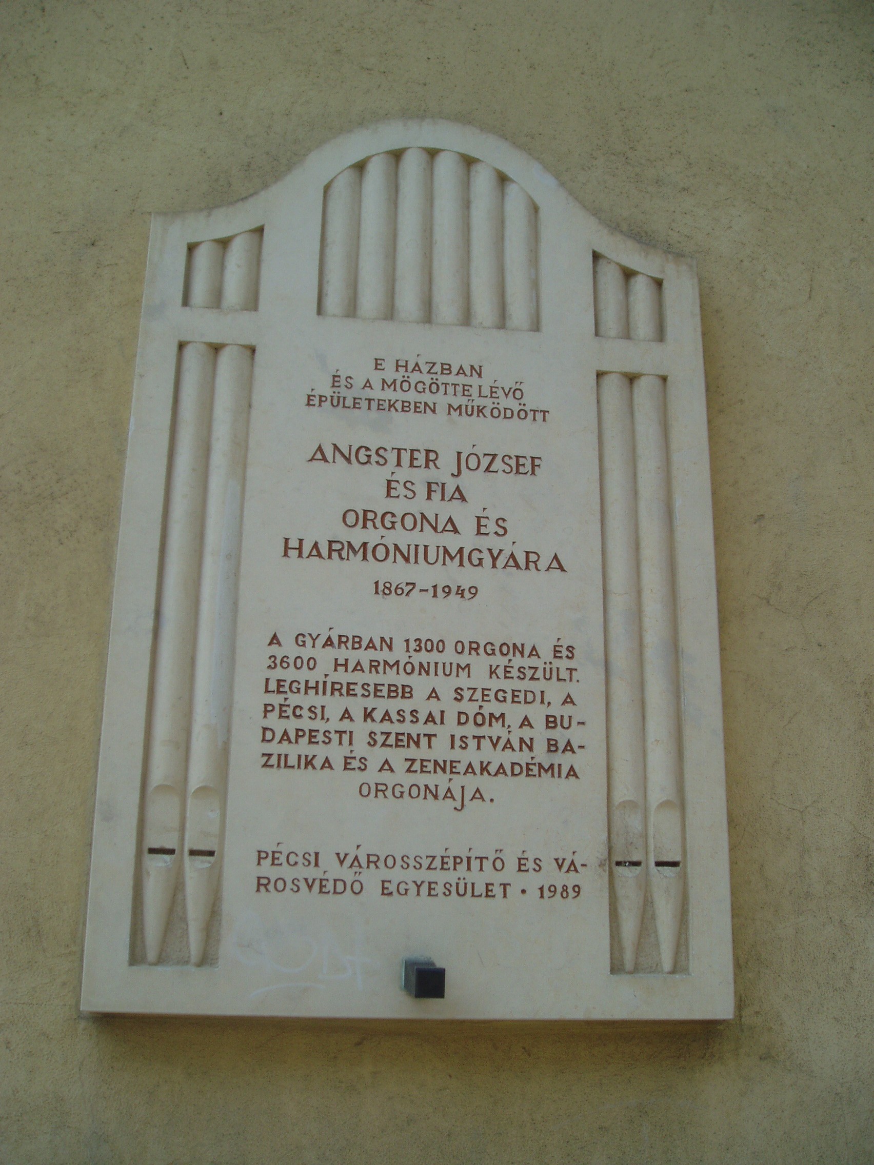 Nyilvános 999 | 1652 | Pécs, Mária utca 35. | Fénykorában itt, és a környező épületekben működött az Angster orgonagyár. Alapítója, Angster József (1834–1918) nem született bele a szakmába. Eszéki asztalos–tanoncként töltött évek után Bécsben tanulta a hangszerkészítő szakmát. Tudását Párizsban tökéletesítette a világhírű Cavaillé–Coll orgonagyárban, ahonnét az akkor elérhető legmagasabb képzettséggel érkezett haza. Saját gyárának megalapítása után az első kimagasló szakmai sikert a kalocsai székesegyház (lásd: Kalocsa, Szentháromság tér) számára megépített orgonája hozta meg számára. Az orgonaüzem többször költözött, mert a megrendelések szaporodása miatt egyre nagyobb helyre lett szüksége. A József utcába való költözés jelentette a végleges telephely kialakításának első lépését. A gyártelepet 1891-ben tovább bővítették a József utcával párhuzamos Mária utcában levő 35. számú épülettel; ezen a házon látható az 1989-ben felavatott emléktábla. A századfordulón a kitűnő Angster–orgonák már szinte benépesítették a Kárpát–medencét, sőt eljutottak az akkori határokon túlra is. A fejlődés kiemelkedő lépcsőfoka volt a pécsi Belvárosi plébániatemplom (lásd: Pécs, Széchenyi tér) orgonájának ünnepélyes felavatása 1886-ban. Közben Angster József fiai, Emil és Oszkár is bekapcsolódtak a munkába, és apjuk 1918-ban ebben a házban bekövetkezett halála után ők vezették a céget. olyan hangszerek születtek, mint a budapesti Zeneakadémia orgonája 1925-ben és a szegedi Fogadalmi templom hatalmas hangszere. 1940-ben a harmadik Angster–generáció vette át a vezetést: Angster József és Imre. Az ő háborús idejükben is megtartotta hírét az üzem, de 1949. december 28-án bekövetkezett az államosítás, a fokozatos megszüntetés, a vezetők meghurcolása és a berendezések kiselejtezése. Napjainkban az Angster–hagyomány a tudomány síkján a stuttgarti Fraunhofer tudományos intézetben Angster Judit és férje, Miklós András révén, a gyakorlatban pedig az 1992 óta működő Pécsi Orgonaépítő Manufaktúra (Pécs, Buzsáki utca 37.) munkájában folytatódik. A fénykép 2006 júliusában készült. Felh. irod.: Angster József: Az Angster-család és az Angster Orgonagyár történetéből. = Angstertől Zsolnayig. Ipartörténeti tanulmányok. Pécs, 1999 |