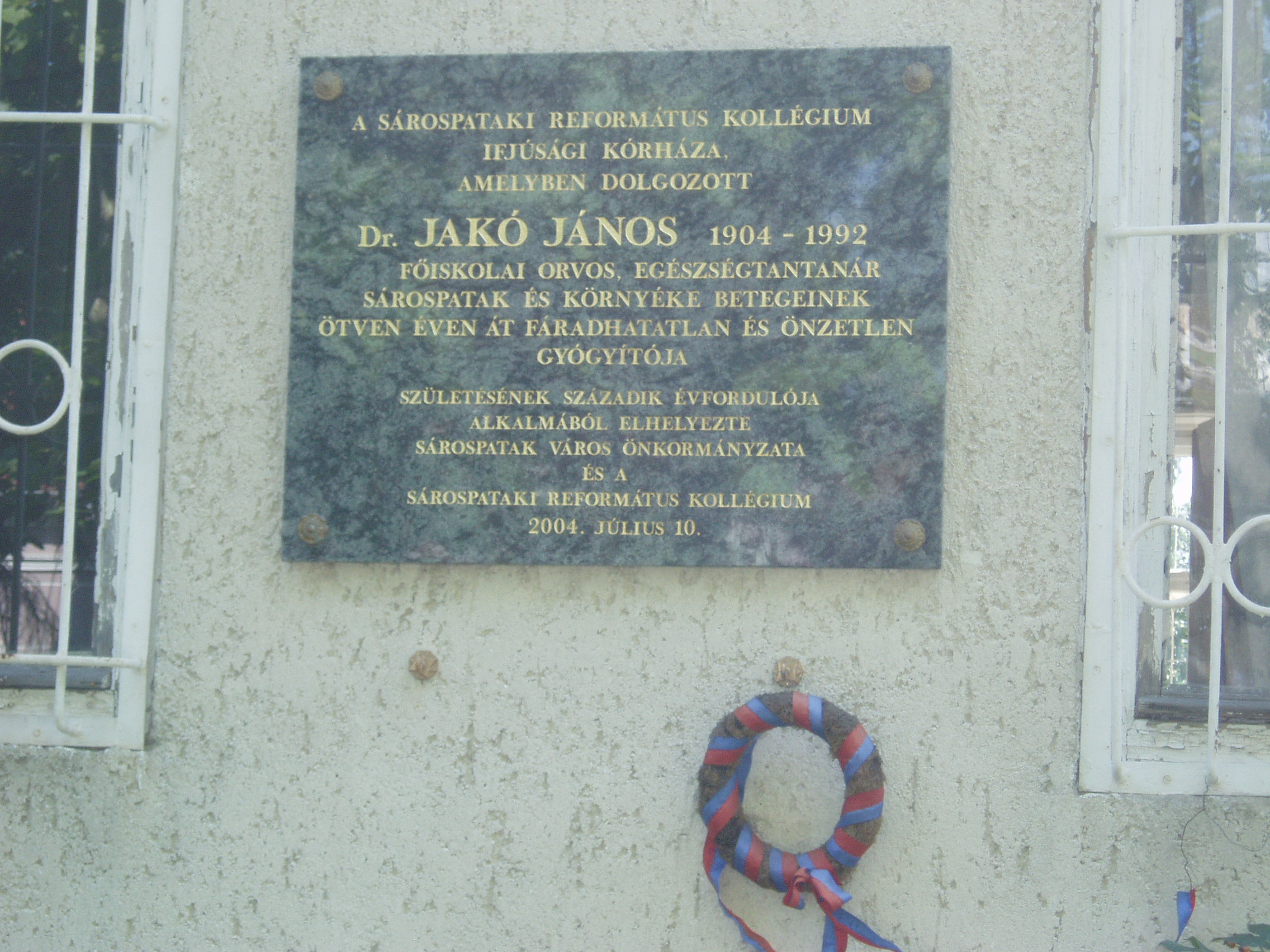 Nyilvános 976 | 1675 | Sárospatak, Kazinczy utca 25. | A ma kollégiumként működő épületben egykor a Református Kollégium ifjúsági kórháza működött. Itt dolgozott Dr. Jakó János (1904-1992) iskolaorvos, egészségtanár. A kis kórházat 1937-ben az ő intenciói alapján élpítették fel. 1952 után körzeti orvosként gyógyította fáradhatatlanul és önzetlenül a környék betegeit. Emléktábláját 2004-ben, születése 100. évfordulója alkalmából állították. A fénykép 2007 augusztusában készült. Felh. irod.: Száz éve született dr. Jakó János. = Sárospataki Református Lapok 2004. 3. |