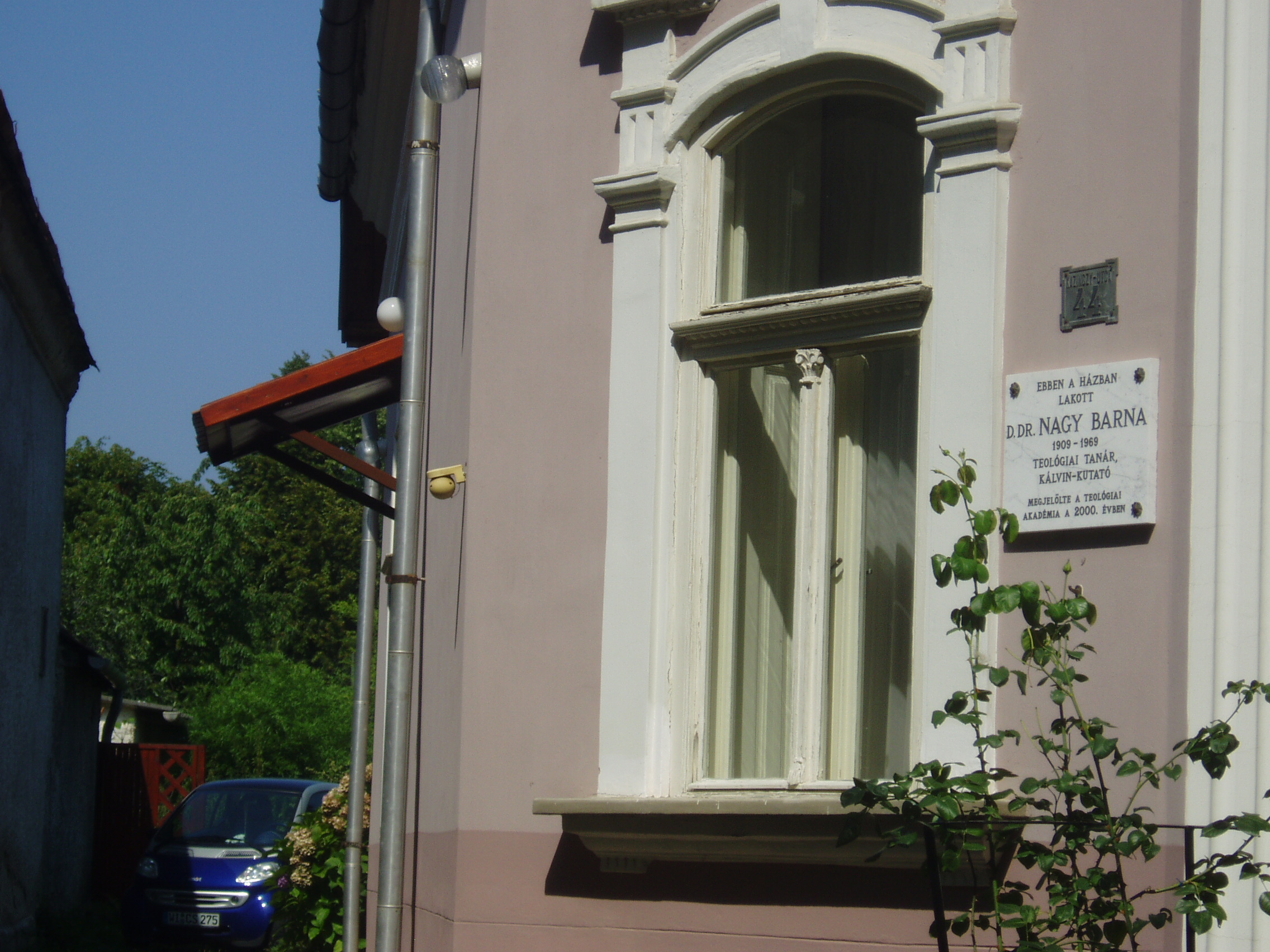 Nyilvános 980 | 1635 | Sárospatak, Kazinczy utca 44. | Ebben a házban lakott a sárospataki születésű Dr. D. Nagy Barna (1909-1969) teológiai tanár. református teológus, egyháztörténeti író, történész. Külföldi egyetemeken (Montpellier, Zürich, Bonn) végzett tanulmányai, majd néhány év segédlelkészi szolgálat után 1937-ben lett a sárospataki református teológiai főiskola tanára, melynek 1945 után igazgatója, majd rektora volt. A főiskola megszűntével a budapesti Református Teológiai Akadémia rendszeres teológiai tanszékének élére került. Dogmatörténettel, a magyar és közép-európai korai reformáció kérdéseivel foglalkozott. Mai francia nyelvre ültette át és sajtó alá rendezte Kálvin kiadatlan prédikációit; tanulmányokat közölt a Heidelbergi Kátéról, a II. Helvét hitvallásról, Bullingerről, Méliusz Juhász Péterről. Számos előadást tartott a reformáció 450. évfordulóján Bázelben, Genfben, Wittenbergben, majd Zürichben, ahol díszdoktorrá avatták. Régi magyar irodalomtörténettel is foglalkozott. A fénykép 2007 augusztusában készült. Felh. irod.: Magyar életrajzi lexikon |