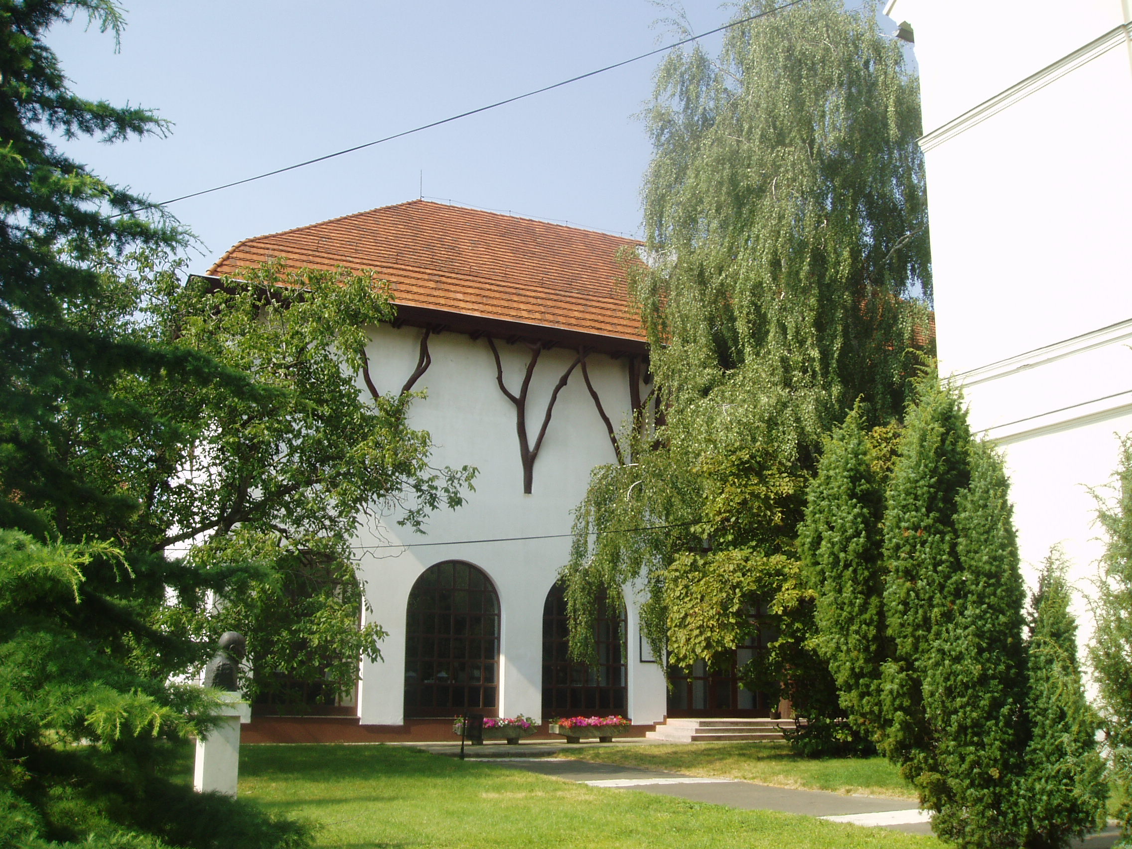 Nyilvános 957 | 1470 | Sárospatak, Rákóczi utca 1. Református Kollégium Repositoriuma | A Kollégium udvarán jobbra emelkedik a Makovecz Imre által tervezett, 1986-ban emelt Repositorium. Az épület a könyvtári, levéltári, adattári raktárak mellett helyet ad jeles személyiségek - többségükben egykori pataki diákok - hagyatékának, könyvgyűjteményének. Itt van Béres Ferenc zenei könyvtára (1988); Cs. Szabó László londoni könyvtára (1985); Halmi Róbert modern angol nyelvű könyvtára (1987); Király István irodalomtörténeti gyűjteménye (2006); Szathmáry Lajos amerikai magyar emigrációs hagyatéka (1987); Vitéz Ferenc amerikai magyar református püspök könyvtára (2002). A fénykép 2007 augusztusában készült. Felh. irod.: Látnivalók Borsod-Abaúj-Zemplén megyében. Miskolc, Well-PRess, 1995 |