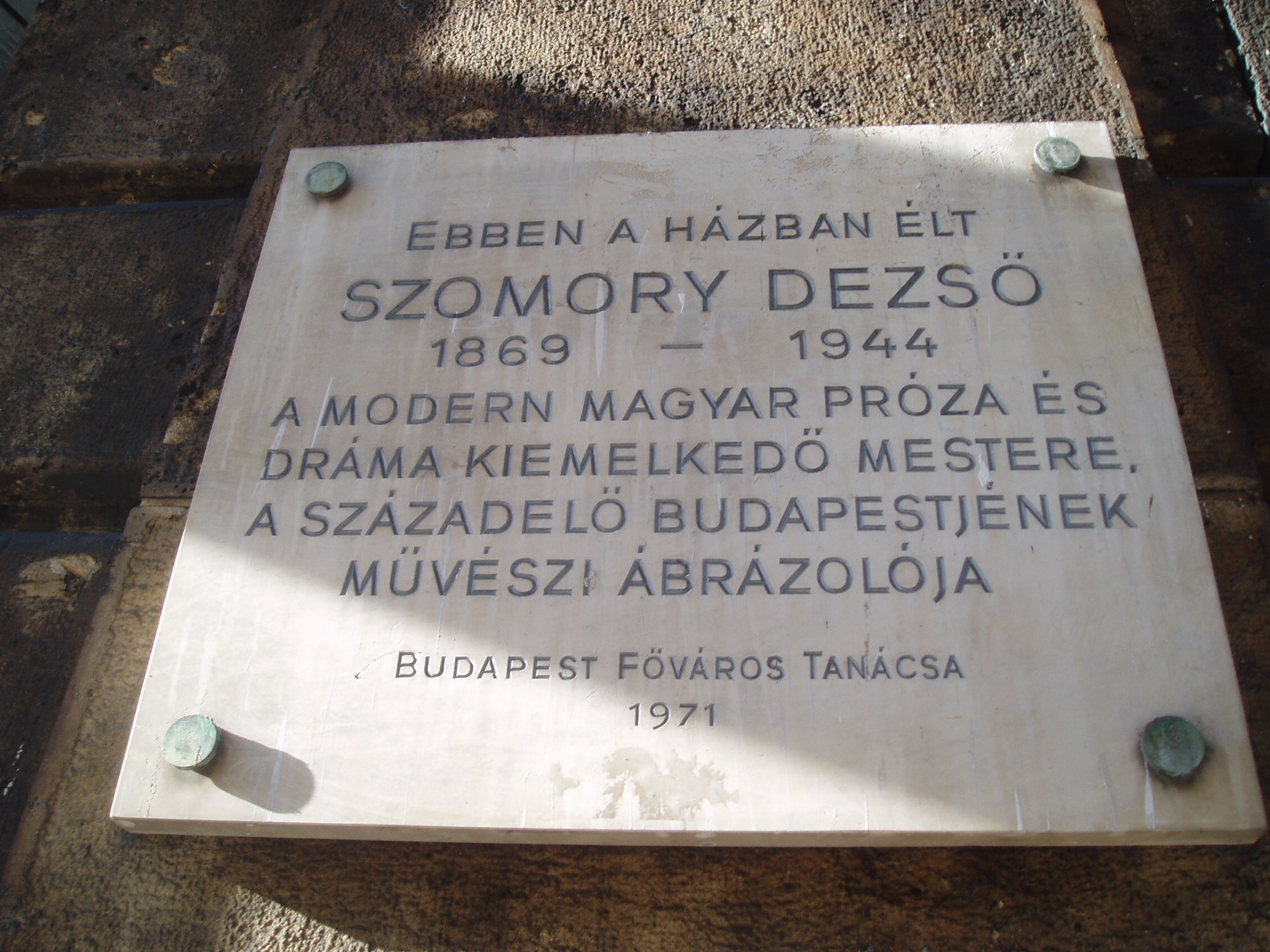 Nyilvános 1101 | 1693 | Budapest, V. Sütő utca 2. | Az e ház padlásterében kialakított hatalmas, egyterű lakásban élt Szomory Dezső 1906-tól 1930-ig. Sok jeles művét írta itt, többek között Hermelin című, önéletrajzi ihletésű színművét, amelynek a helyszínekről szóló szerzői utasításai egyértelműen saját lakását írják le: "És az ablakon át, ha felhúzzák a függönyt, a város háztető- és kéményrengetege látszik, egy-egy templomtorony arany csúcsával a végtelen égboltozat alatt. Mert ez itt egy padlásból épült lakás, amit a dimenziók sejtetnek is. És egészen közelről hallani a templomi harangszót..." Ez a nevezetes lakhely ihlette Kellér Andor Szomory Dezsőről írott regényének címét: Író a toronyban. A lakás részletes leírását e műben is olvashatjuk. Az író emléktábláját 1971-ben avatták fel. A fénykép 2007 májusában készült. Felh. irod.: Réz Pál: Szomory Dezső alkotásai és vallomásai tükrében. Bp. Szépirodalmi Kiadó, 1971 |