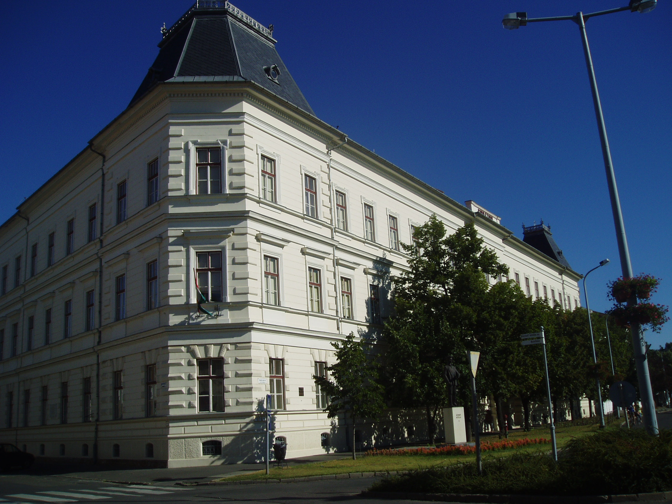 Nyilvános 1003 | 1483 | Makó, Csanád vezér tér 6. József Attila Gimnázium | A város központjából északra nyílik a sugárútszerű Csanád vezér tér. Nyugati oldalán áll a József Attila Gimnázium 1895-ben, eklektikus stílusban, Gerle Lajos tervei alapján emelt épülete. Itt tanított négy évig Juhász Gyula, itt tanult József Attila, majd Erdei Ferenc. A tizenöt és fél éves József Attila 1920 októberében érkezett Makóra. Verseire Juhász Gyula figyelt fel, akinek pártfogása révén a nyugat is közölt néhányat belőlük. Makói diák volt, amikor tizenhét éves korában Szegeden megjelent első verseskötete, a "Szépség koldusa", Juhász Gyula prófétikus előszavával: "A legnagyobb készséggel és örömmel vállalkoztam arra, hogy József Attila első verses könyvéhez előszót írjak. Ez a nagyon fiatal és nagyon tehetséges költő a legteljesebb mértékben megérdemli, hogy a figyelem feléje forduljon, hogy igaz szeretettel és reménységgel fogadja a magyar olvasóközönség és hogy a kritika se menjen el mellette közömbösen vagy ellenségesen és ne elégedjék meg vele szemben a nyomtatásban megjelenőknek rendesen kijáró vállveregetéssel. József Attila Isten kegyelméből való költő." Az épület előtt áll 2005-ben, születése centenáriumán újjáavatott szobra, a járdába ágyazottan pedig első verseskötetének bronzba öntött címlapja idézi emlékét. Egykor a gimnázium közvetlen közelében állott a Hollósy Kornélia Színház épülete. A színház lépcsőjén készült 1924. szeptember 18-án az a híres csoportkép, amelyen Juhász Gyula, Móra Ferenc és mások társaságában ott van József Attila is. Aznap a színházban három szegedi író, Juhász Gyula, Móra Ferenc és Réti Ödön egy-egy egyfelvonásosát mutatták be. A fénykép 2007 júliusában készült. Felh. irod.: Barangolások Csongrád megyében. Miskolc, Well-PRess, 1997 Nem én kiáltok. József Attila Szegeden. = www.sk-szeged.hu/kiallitas/jozsefattila |