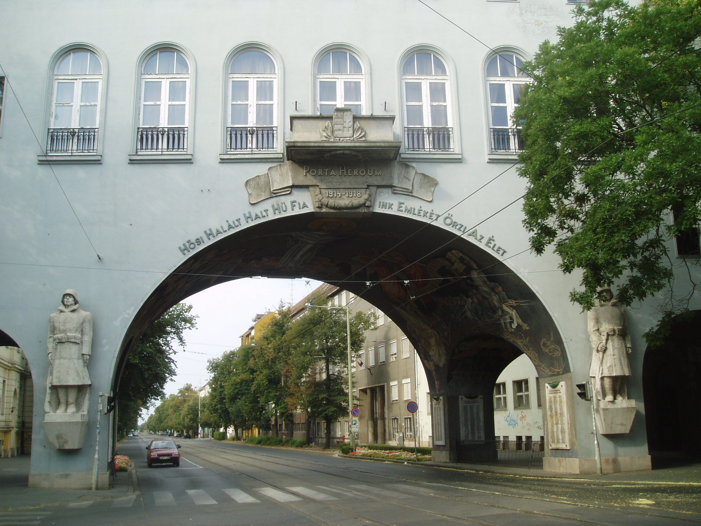 Nyilvános 1020 | 3311 | Szeged, Aradi vértanúk tere: Hősök kapuja | Az Aradi vértanúk tere déli oldalát a nagyszabású Hősök kapuja (Porta heroum) határolja. Az 1936-ban Pogány Móric tervei szerint épült kapu épült kapu honvédszobrai - az élő és a halott katona - Lőte Éva 1937-ben készült alkotásai, s az I. világháború áldozataira emlékeztetnek. A boltív freskóit Aba-Novák Vilmos készítette. A festményeket 1949-ben levakolták, csak a Millenniumra sikerült feltárni és helyreállítani őket. A művész a képsorozaton három témát jelenített meg: a háborús emlékezést, a hősi halottak dicsőítését és Horthy Miklós elindulását Szegedről. Középen, fejjel a tér felé Aba-Novák az ítélkező Krisztus mintegy 8 méteres alakját ábrázolta, lábainál a harsonás, ítélkező angyalok csoportjával. A kapu alatt kezdődik a nagyállomásra vezető Boldogasszony sugárút. A fénykép 2007 júliusában készült. Felh. irod.: www.vendegvaro.hu |