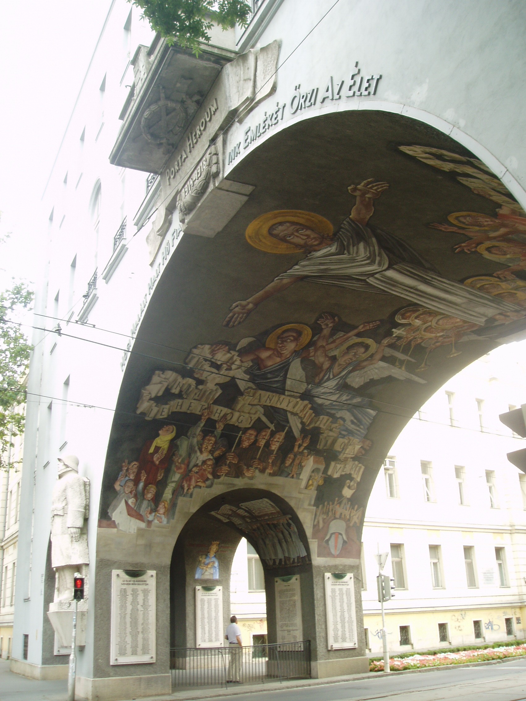 Nyilvános 965 | 1466 | Szeged, Aradi vértanúk tere: Hősök kapuja | Az Aradi vértanúk tere déli oldalát a nagyszabású Hősök kapuja (Porta heroum) határolja. Az 1936-ban Pogány Móric tervei szerint épült kapu épült kapu honvédszobrai - az élő és a halott katona - Lőte Éva 1937-ben készült alkotásai, s az I. világháború áldozataira emlékeztetnek. A boltív freskóit Aba-Novák Vilmos készítette. A festményeket 1949-ben levakolták, csak a Millenniumra sikerült feltárni és helyreállítani őket. A művész a képsorozaton három témát jelenített meg: a háborús emlékezést, a hősi halottak dicsőítését és Horthy Miklós elindulását Szegedről. Középen, fejjel a tér felé Aba-Novák az ítélkező Krisztus mintegy 8 méteres alakját ábrázolta, lábainál a harsonás, ítélkező angyalok csoportjával. A kapu alatt kezdődik a nagyállomásra vezető Boldogasszony sugárút. A fénykép 2007 júliusában készült. Felh. irod.: www.vendegvaro.hu |