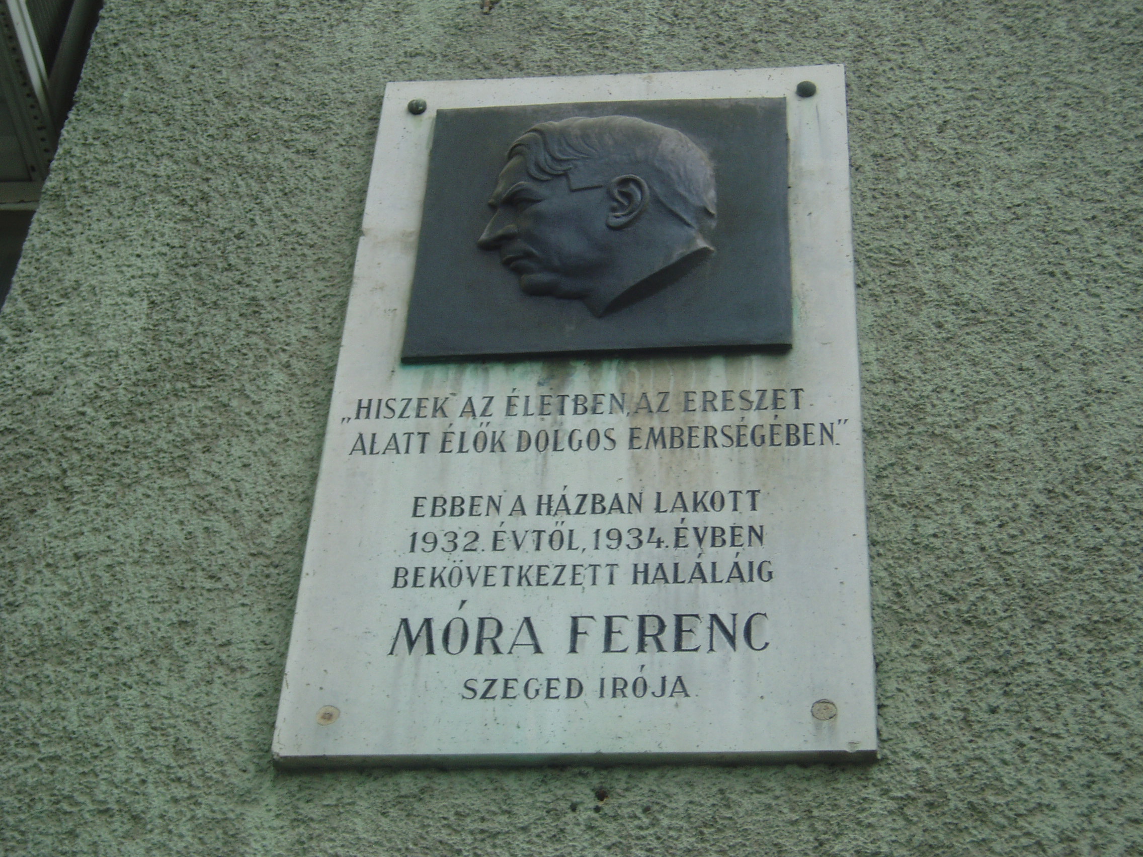Nyilvános 987 | 1489 | Szeged, Boldogasszony sugárút 15. | Az alaposan átalakított városi házban volt Móra Ferenc utolsó lakása. 1932-ben költözött ide a Kölcsey utca 10. szám alatti lakásából. Új otthonát csak rövid ideig élvezhette, rátört a súlyos betegség, a hasnyáálmirigyrák. Halála előtt két hónappal itt kereste fel őt az erdélyi írók küldöttsége: Tamási Áron, Bánffy Miklós, Kemény János, Kós Károly és Ligeti Ernő. 1934. január 20-án a szegedi ipartestület küldöttségét fogadta lakásában. A foltozó szűcs fia ekkor vallotta magát "nemzeti szolgálómesternek". 1934. február 8-án hunyt el, sírja a Belvárosi temetőben (lásd: Szeged, Fonógyári út) van. Az épületen lévő emléktábláját Tápay Antal készítette. A fénykép 2007 júliusában készült. Felh. irod.: Péter László: Szeged. Bp. Panoráma, 1981 |