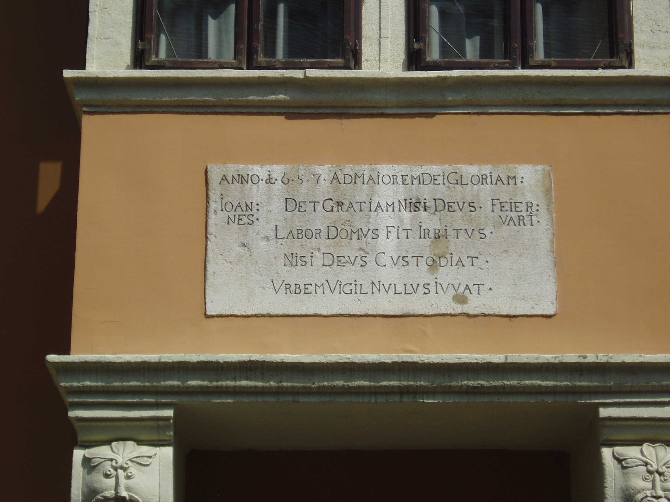 Nyilvános 1038 | 1563 | Győr, Apáca utca 9. Fejérvári-ház | Győr egyik legpatinásabb épületét 1657-ben emelték, amint a homlokzatán elhelyezett latin nyelvű emléktáblán is olvasható, majd 1770 körül átalakították. A későreneszánsz-korabarokk ház kapujának zárókövén a Fejérvári család címere, egy csőrében patkót tartó vadliba látható. Első emeleti zárt erkélye maszkban végződő csigavonalas konzolokon nyugszik. A felvétel 2008 május végén készült. Felh. irod.: Cziglényi László: Győr. Bp. Panoráma, 1981 |