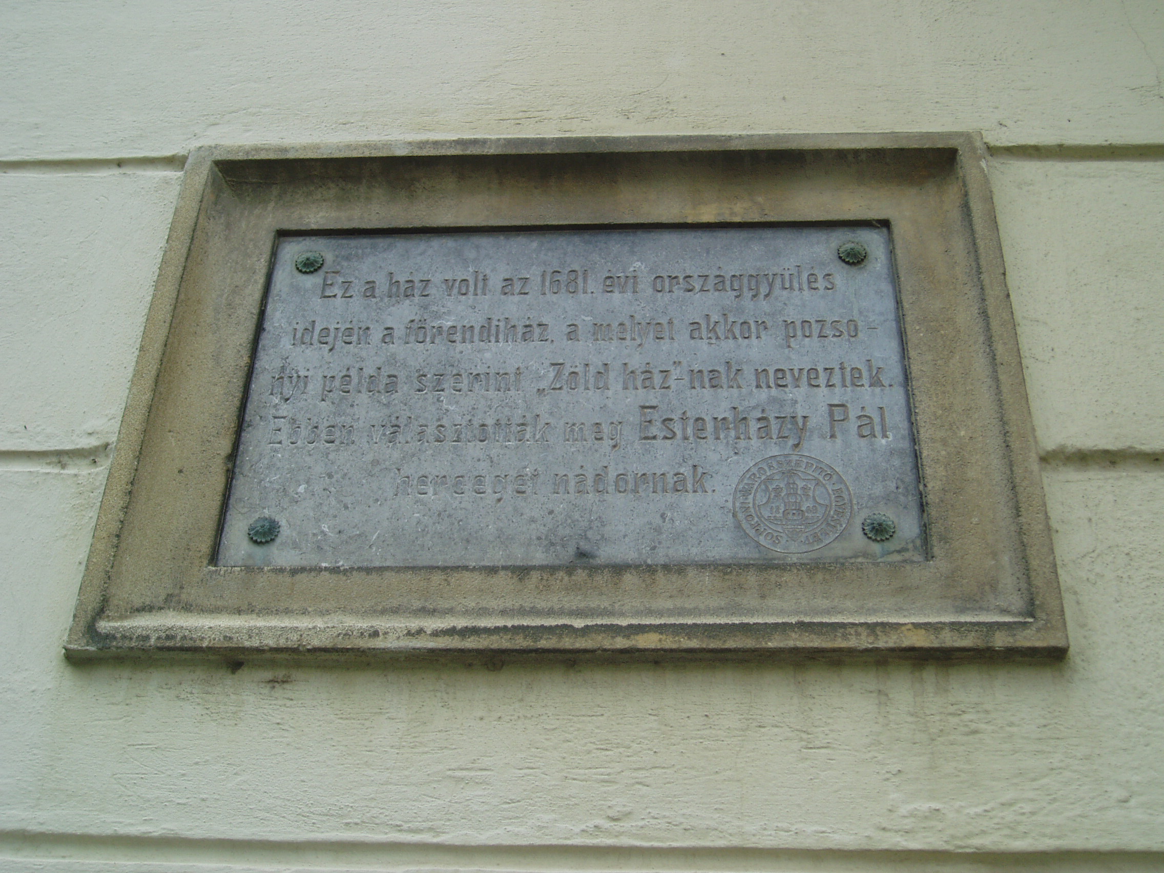 Nyilvános 930 | 1273 | Sopron, Hátsókapu 2. | Az ún. Caesar–ház hatalmas reneszánsz sarokerkélyével a városkép jellegzetes eleme. Helyén valamikor több kisebb, valószínűleg a XV. században épült lakóház állt. Az 1676-ban Sopron belvárosát sújtó nagy tűzvész után ezek megmaradt részei, valamint a belső városfal maradványainak felhasználásával épült fel e pompás kis városi palota. Dongaboltozatos kapualjában megmaradtak a középkori ülőfülkék. Udvari szárnyának emeletén toszkán oszlopos, köríves árkádsor van. Az udvarból a falszorosban kialakított kertbe juthatunk, ahol látható a római és a ráépült középkori városfal, amelyet ablakokkal áttörve az épület hátsó homlokzataként használtak fel. Két emeleti termében megmaradt az 1700 körül készült, kora barokk ornamentális stukkómennyezet. Az 1681-es országgyűlés idején ebben az épületben ülésezett a főrendiház, ekkor választották Magyarország nádorává Esterházy Pál herceget, aki Harmonia caelestis című kantátasorozatával beírta nevét a magyar zenetörténetbe is. Az eseményt a Soproni Városszépítő Egyesület körpecsétjével ellátott emléktábla örökíti meg az épület homlokzatán. A fénykép 2008 júniusában készült. Felh. irod.: Czellár Katalin: Sopron. 3. jav. kiad. Bp. Panoráma, 2000 |