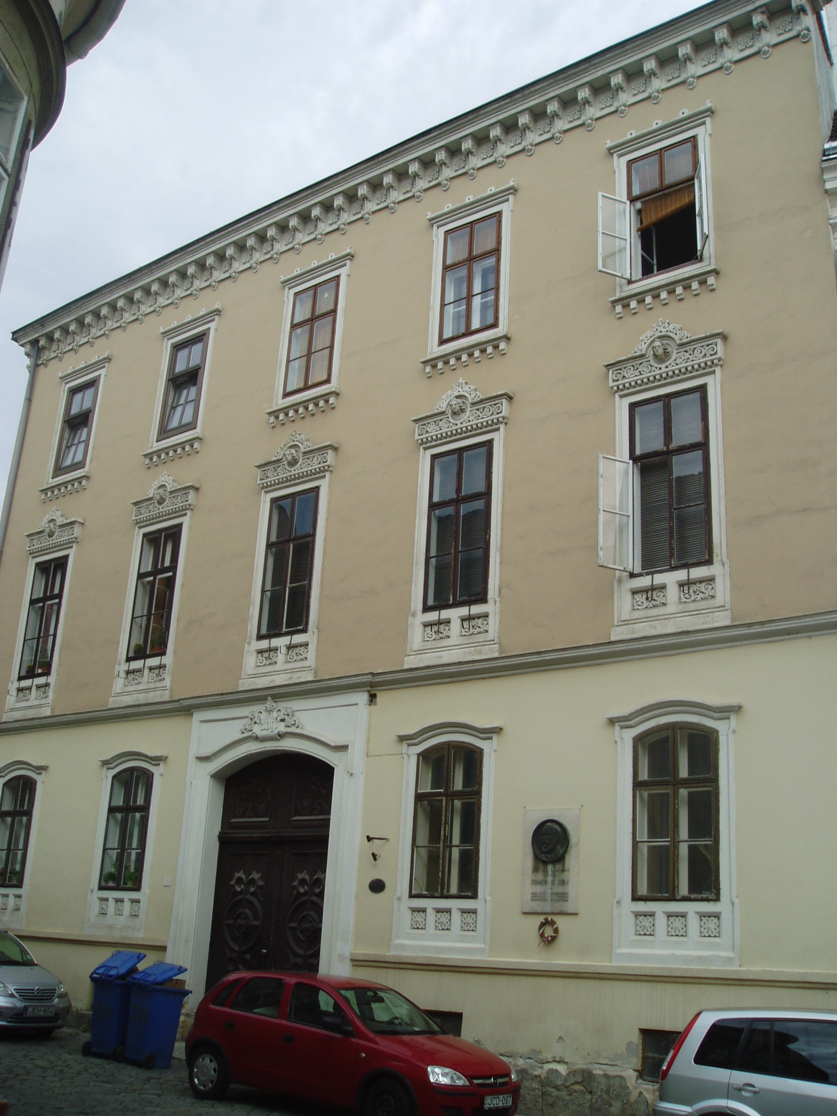 Nyilvános 943 | 1359 | Sopron, Szent György utca 24. | Az 1860 körül emelt romantikus stílusú épületben lakott Frankenburg Adolf író, szerkesztő és Carina Anna operaénekesnő. Miután belső munkatársa volt Kossuth Pesti Hírlapjának, Frankenburg indította útjára a magyar irodalomtörténetben jelentős szerepet játszó Életképek című folyóiratot. Működése nem volt ínyére a kormányzatnak, ezért 1847-ben kancelláriai titkárnak Bécsbe helyezték. Mintegy két évtizedig élt ott. Sok zaklatásnak volt kitéve, ugyanis gyanúba fogták, hogy szerepet játszott a bécsi felkelés kirobbantásában. 1866-ban nyugdíjazását kérte s hazatért Magyarországra. Második felesége volt Carina Anna, aki 1863 és 1867 között állandó tagja volt a Nemzeti Színház operatársulatának. Ezután Bécsbe szerződött, s a pár a közeli Sopronban telepedett le. Csak hosszú együttélés után, 1881-ben tudtak házasságot kötni, amely rövid életű lett: Frankenburg 1884-ben, Carina Anna 1885-ben elhunyt. Sopronban Frankenburg megalapította az Irodalmi és Művészeti Kört, mely később felvette nevét. Az épületen csak Frankenburg nevét örökíti meg emléktábla, Neszthy Egonné Haich Erzsébet munkája (1934), s évszáma is hiányos. A kép 2008 júniusában készült. Felh. irod.: Berecz Dezső: Frankenburg Adolf harmadik felesége. = Soproni Szemle 1941 Berecz Dezső: Megemlékezés Frankenburg Adolf halálának századik évfordulóján. = Soproni Szemle 1984. 3. |