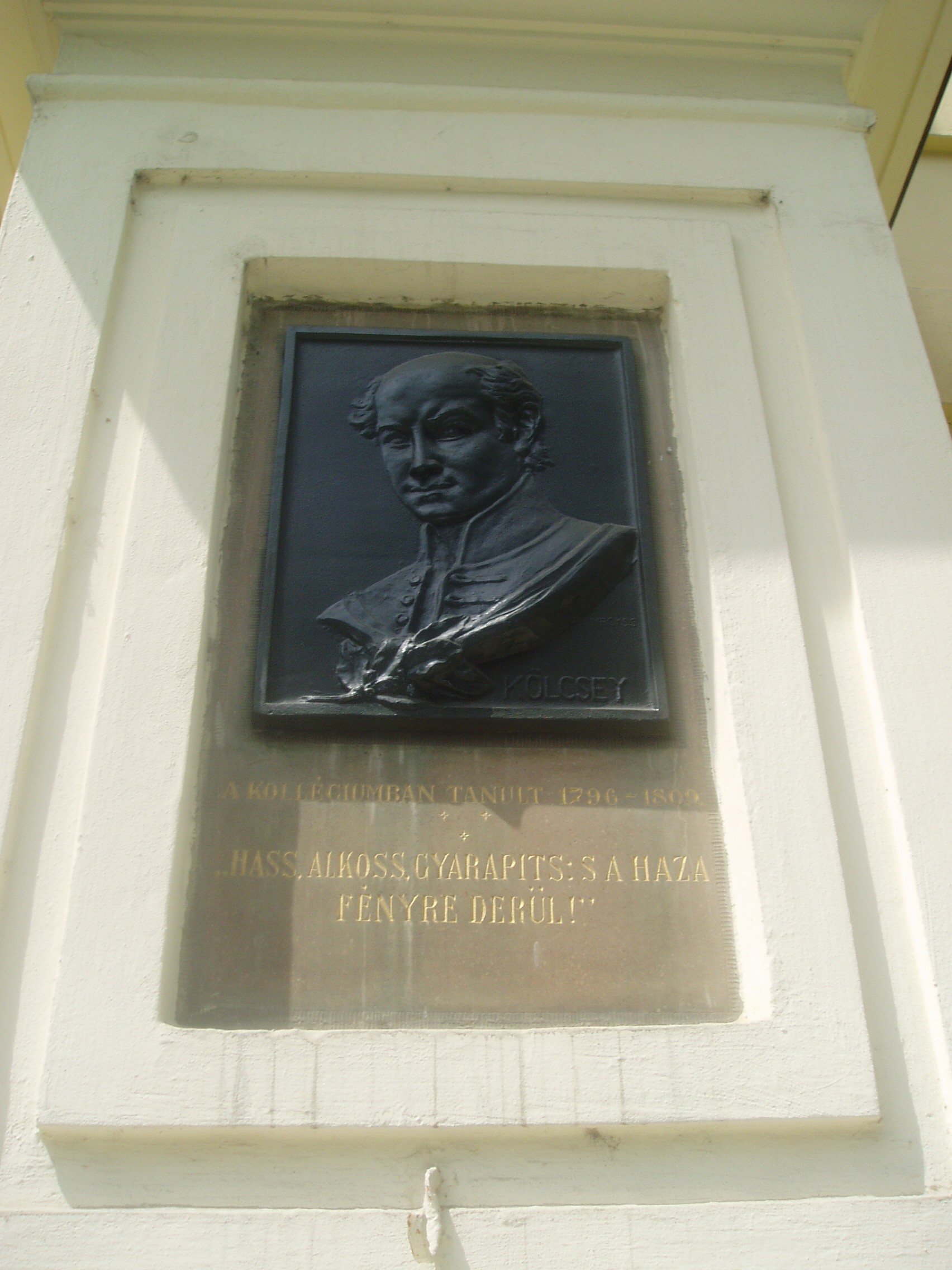 Nyilvános 1030 | 1570 | Debrecen, Kálvin tér 16. Református Kollégium: Kölcsey Ferenc domborműve | A Kollégium mai épülete a magyar klasszicista építészet nagyszerű példája. A főbejárat homlokzatát Nagy Sándor János bronz domborművei díszítik. Kettős oszlopot hordozó széles táblán Kálvin és Zwingli egymással szembeforduló alakja látható. A mellette lévő oszlopon Arany János bronz domborművét találhatjuk, míg a Füvészkert utca felől Csokonai Vitéz Mihály emlékét örökítették meg. Ugyancsak a főbejáraton látható Kölcsey Ferenc portréja, Nagy Sándor János egyik legszebb alkotása. A sort Fazekas Mihály és Móricz Zsigmond portréja egészíti ki. Medgyessy Ferenc bronz domborműve a kollégium hősi halottainak, tanároknak és diákoknak állít emléket. A képen Kölcsey Ferenc domborműve látható, aki tizenhárom éven keresztül volt a Kollégium diákja, a jogot is itt végezte. A fénykép 2006 júniusában készült. Felh. irod.: Kovács Gergelyné: Debrecen. Bp. Panoráma, 1981 Papp Antal: Debrecen. Bp. Panoráma, 1976 Győri L. János: "Egész Magyarországnak és Erdélynek világosító lámpása": a debreceni Református Kollégium története. Debrecen, 2006 |