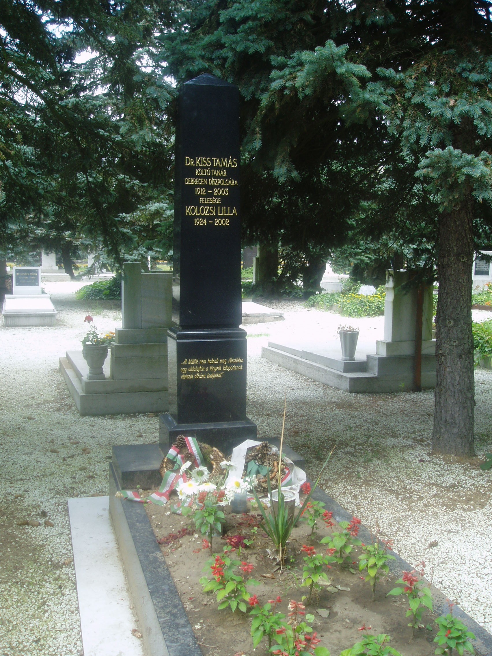 Nyilvános 1427 | 3444 | Debrecen, Bocskai út: Köztemető: Kiss Tamás költő sírja | Kiss Tamás (1912-2003) élete négy helyszínhez kötődik. Kisújszálláson született, s élt 18 éves koráig. Debrecenben végezte teológiai tanulmányait, majd segédlelkész bihari falvakban (rövid ideig Kisújszálláson), vallástanár Nagyváradon. Végül ismét Debrecen következett, ahol több mint félévszázadig tevékenykedett, s a város irodalmi és kulturális életének meghatározó alakjává vált. 1947-től a Dóczi Tanítónőképzőben tanított. 1953-tól a Kossuth Gyakorló Gimnázium vezető tanára. A debreceni kollégiumhoz való szoros kötődéséről tanúskodnak "Árkádiában éltünk" címen megjelent esszéi, Csokonai-regénye és a Kollégium múltját népszerűsítő könyvecskéje, "A bagolyvár és lakói". 1983-ban a volt diákok a frissen megalakult debreceni Kollégium Baráti Köre elnökének választották. Mint egy nekrológja fogalmazott: "Ahogy létezik századunkban pannon táj- és élményköltészet, Kiss Tamás azon kevesek egyike volt, akik az alföldi létforma, Debrecen ősi szellemisége meditatív ihletétől fölgazdagodva, intellektuális színezetű életműben barangolták be e különös minőségű kultúrhistória belső lírai tájait." A fénykép 2006 júniusában készült. Felh. irod.: http://kincsestar.radio.hu/panoptikum www.drk.hu/refivil/Dijak.htm www.vagy.hu/cikk.php?id=628 |