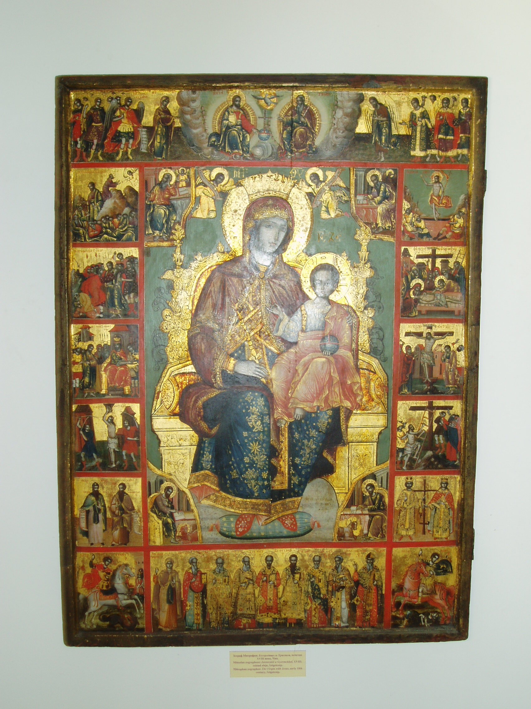 Nyilvános 1100 | 2424 | Szentendre, Pátriárka utca 5. Szerb Egyházművészeti Gyűjtemény | A Beográda-templom - a görögkeleti (ortodox) püspöki székesegyház - kertjében áll a püspöki palota és a szerb egyházművészeti múzeum épülete. Magyarország művészeti emlékeinek egyedülálló színfoltja a XVI.-XIX. századi szerb egyházművészeti emlékeket, ikonokat, ötvösmunkákat és más iparművészeti alkotásokat bemutató Szerb Egyházművészeti Gyűjtemény. A múzeum törzsanyaga a Budai Szerb Ortodox Püspökség kincstárából és a hazai szerb templomokból Szentendrére került kiemelkedő jelentőségű műtárgyakból alakult ki. A közelmúltban felújított épületbe került a Budai Szerb Püspökség könyvtára és levéltára is, mely szerb ősnyomtatványokat és egy török nyelvű kiváltságlevelet is tartalmaz. A képen a görög Mitrofan és társa: Isten anyja a gyermekkel és a szenvedéstörténet eseményeivel című, a XVIII. század elejéről származó ikonja látható, amely eredetileg a szigetcsépi templomé volt. A fénykép 2005 szeptemberében készült. Felh. irod.: www.szentendre.hu |
