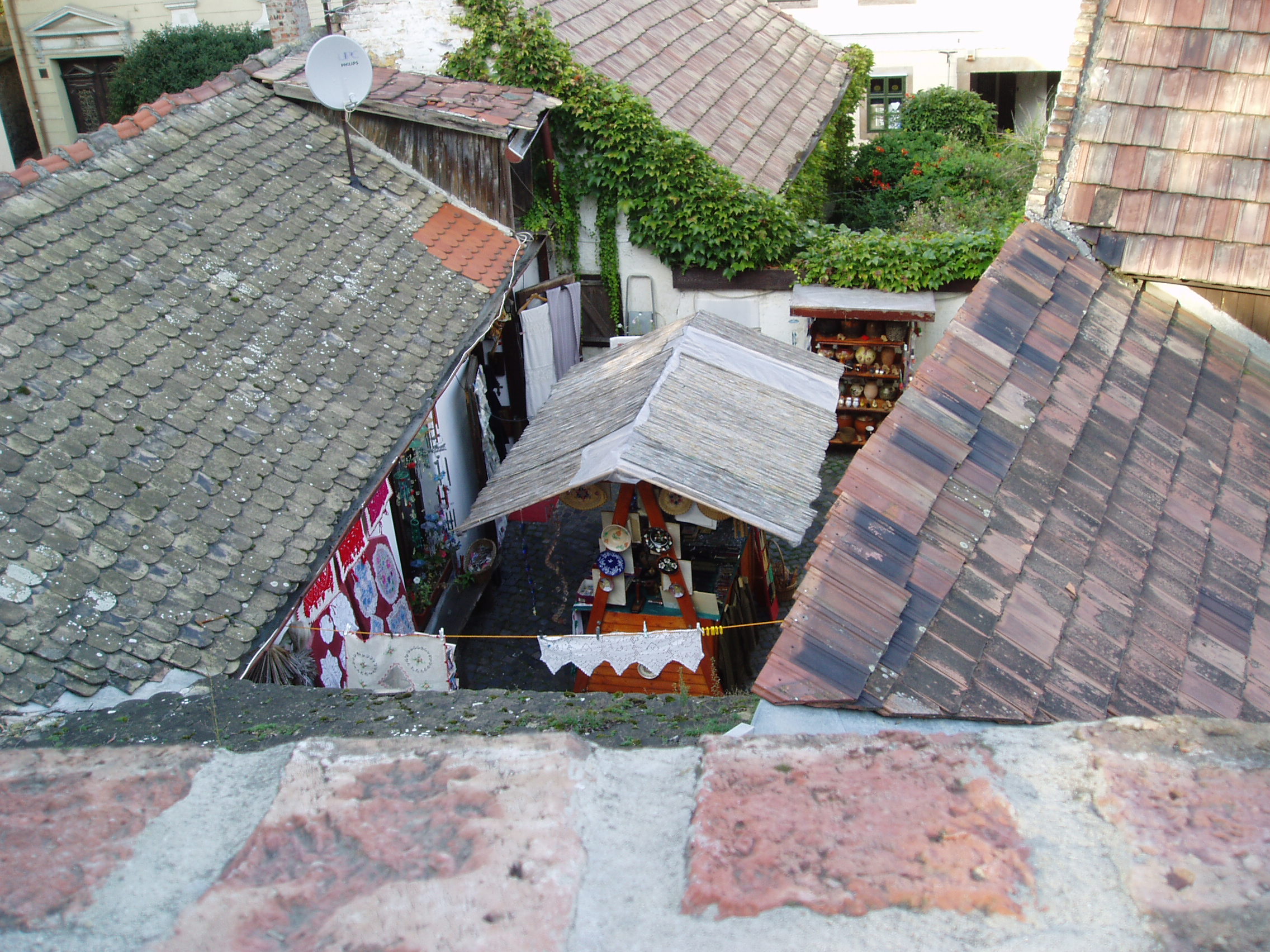 Nyilvános 1048 | 1752 | Szentendre, Várdomb | Szentendre egyik legszebb része a Várdomb, a település középkori központja. Tömör mellvéddel körülvett sétányáról megragadó látvány nyílik az oly sokszor megfestett szentendrei háztetőkre, a kis belső udvarokra, a belvárosra, a Dunára és a túloldali szigetre. A fénykép 2005 szeptemberében készült. Felh. irod.: Szentendre. Szerk. Sándyné Wolf Katalin. Bp. Panoráma, 1985 www.vendegvaro.hu www.szentendre.hu |