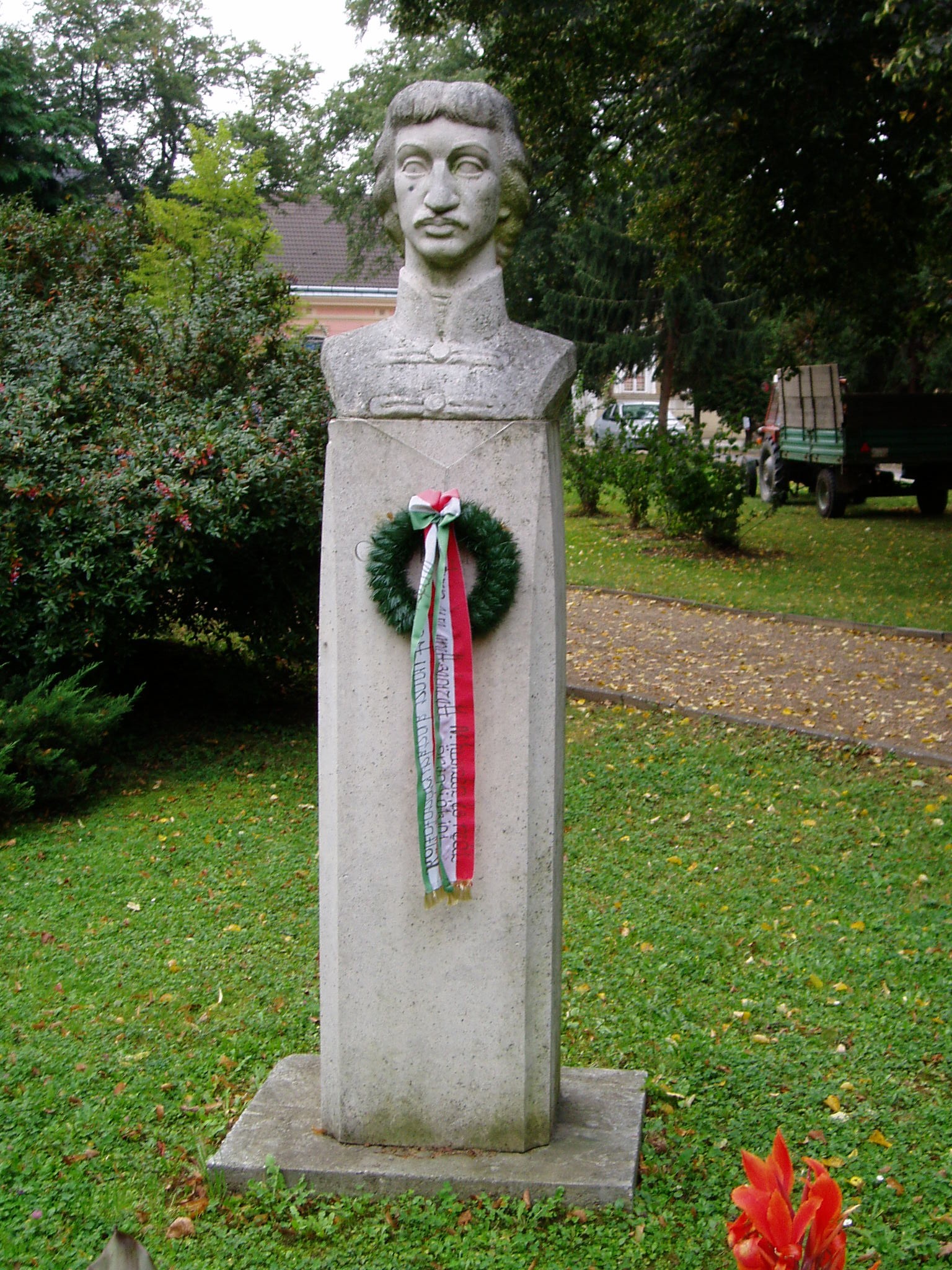 Nyilvános 1138 | 2420 | Csurgó, Széchenyi tér: Csokonai mellszobra | Csokonai Vitéz Mihály 1799/1800-ban helyettesítő tanárként tanított a nem sokkal korábban alapított csurgói gimnáziumban (lásd: Csurgó, Csokonai u. 24.). Modern mellszobra Kamocsay István alkotása. A fénykép 2004 októberében készült. Felh. irod.: Csurgói kalauz. Szerk. Terényi Zoltán. 1974 |