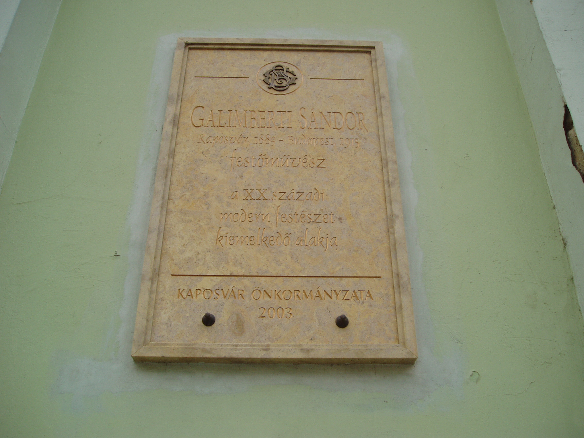 Nyilvános 1095 | 2005 | Kaposvár, Fő utca 2. | A régi gimnázium, majd pénzügyi palota épületén 2003-ban helyezték el a kaposvári születésű Galimberti Sándor festőművész emléktábláját. Galimberti Sándor (1883-1925) a magyar festőművészet első vonalbeli alakjaként a századelő megújító művészeti képviselőihez tartozik. Édesapja Galimberti Alajos (Luigi Galimberti) az 1880-as évek elején települt át Trieszből Kaposvárra. Ő maga is festő volt, aki szívesen örökítette meg a kisvárosi lakók életét rajzaiban, illetve Kaposvár egykori képéről két festménye maradt fenn. Galimberti Sándor pályája nagyobb ívet rajzolt be. Ő a modern európai festészeti eredményeket adaptálta művészetében és a művészettörténet ennek eredményeként a kubofuturista és expresszionista felfogás első hazai képviselőjének tartja. Galimberti nagybányai, müncheni, majd párizsi iskolái után saját stílusát tekintve Rippl-Rónai festészetének szellemében indult és a kaposvári mestert e progresszív, új művészeti irányzatokkal kapcsolja össze. Sajnos műveinek többsége a világháborúban megsemmisült, csak néhány darab maradt fenn, amelyből a művészettörténészek rekonstruálni tudták pályáját. Hagyatékának nagyobb részét a Rippl-Rónai Múzeum birtokolja. A fénykép 2006 márciusában készült. Felh. irod.: www.kaposvar.hu/eloterjesztesek/eloterjesztesek20030227/kotet3/18.doc |