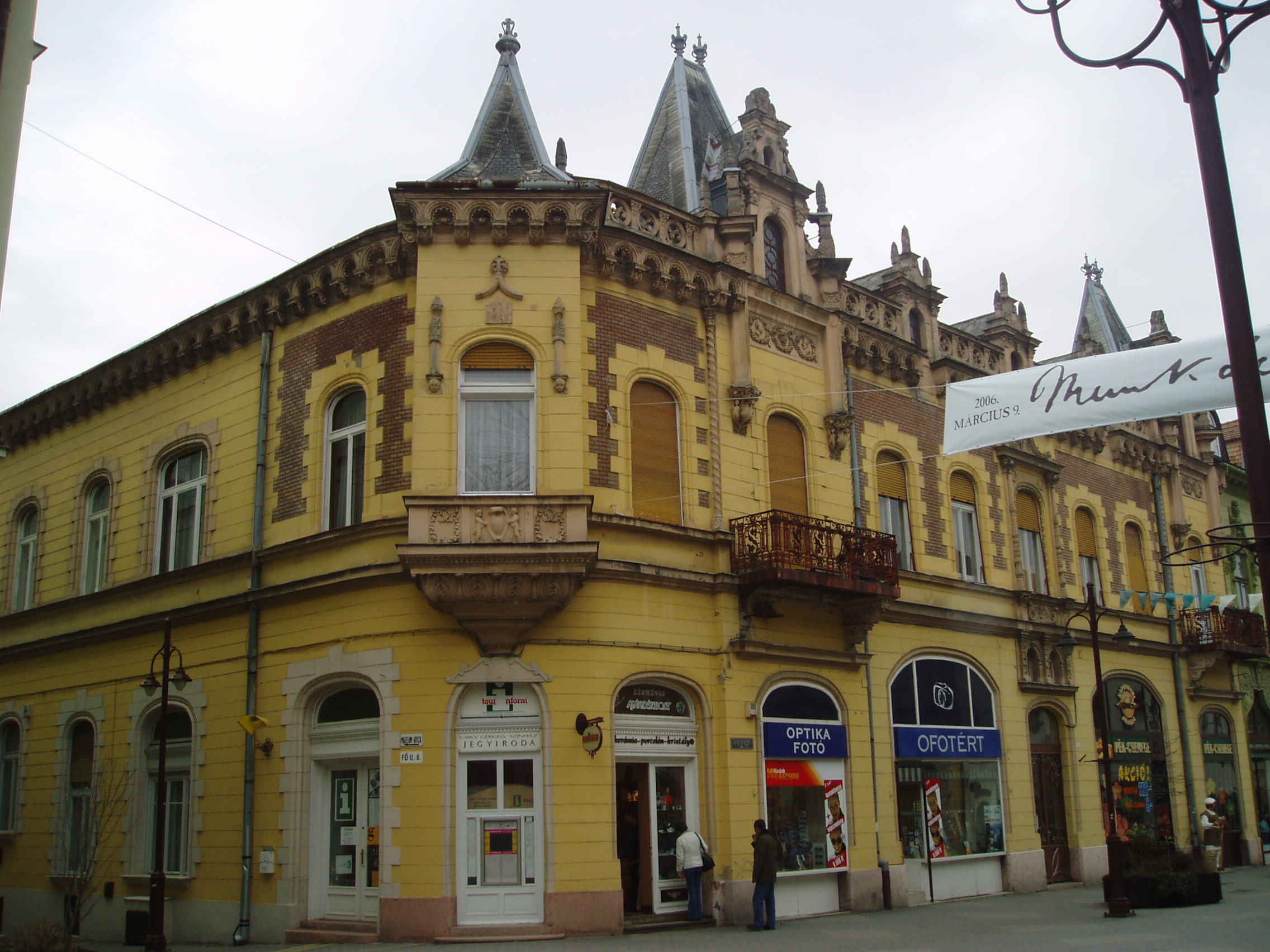 Nyilvános 986 | 1637 | Kaposvár, Fő utca 8. | Kaposvár belvárosának épületeit nagyrészt a XIX. század második felében és a XX. század első két évtizedében emelték. A döntően eklektikus és kisebb számban szecessziós stílusú épületek nem képviselnek kiemelkedő építészeti értéket, de együttesen sajátos hangulatú utcaképet alkotnak. A Fő utca 8. számú egykori Kemény-palota, a sétálóutca ékessége neoreneszánsz stílusban Kovács Frigyes tervei szerint épült 1904-ben. A fénykép 2006 márciusában készült. Felh. irod.: Kaposvár és környéke. Kaposvár, Infomark, 2002 Látnivalók Somogy megyében. Miskolc, Well-PRess, 2000 /Vendégváró/ |