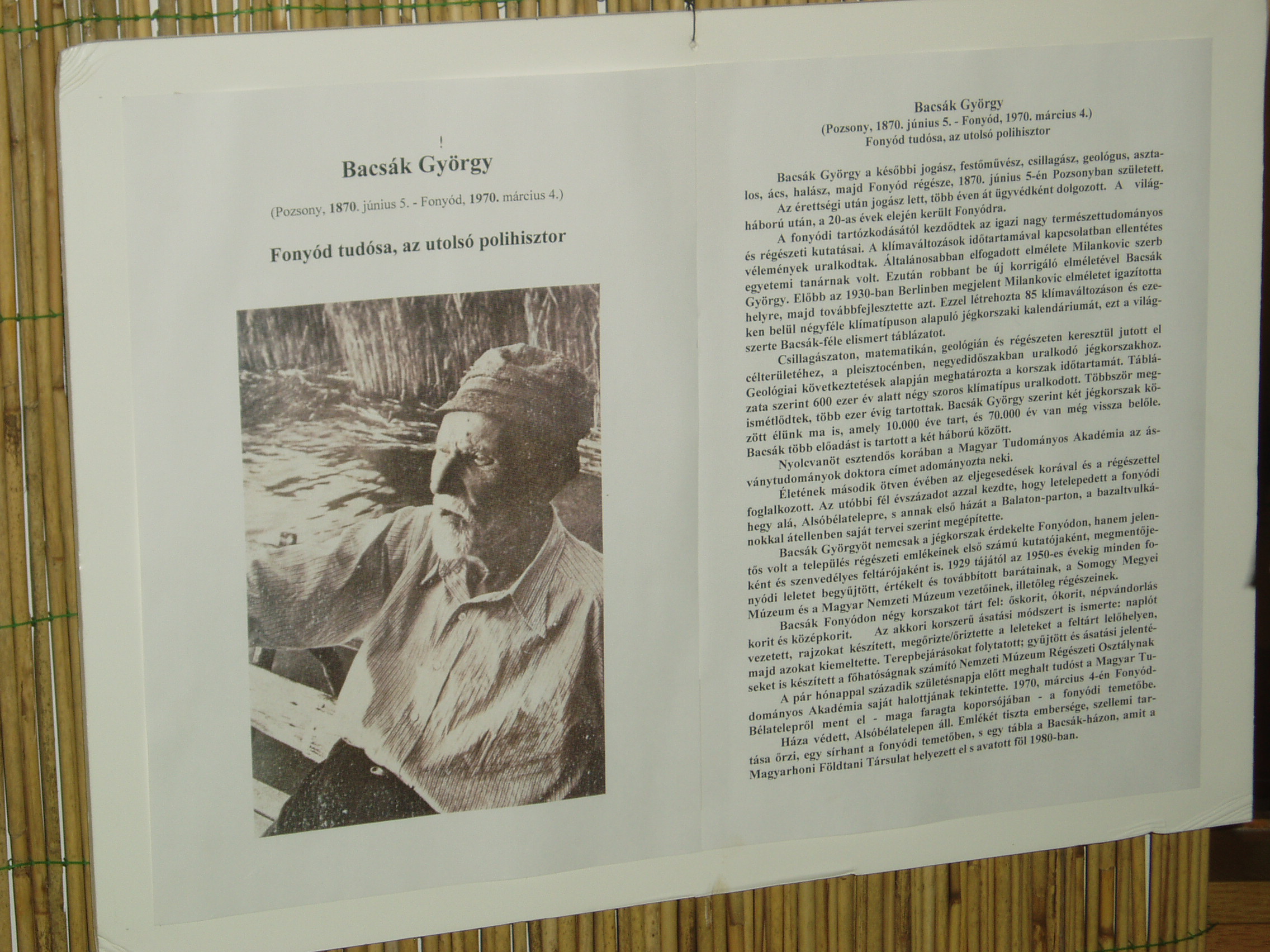 Nyilvános 991 | 1729 | Fonyód, Bartók Béla utca 3. Természetvédelmi és Helytörténeti Múzeum - Bacsák György | A fonyódi Várhegyen kialakult Bélatelephez tartozó, a Balaton egyik legszebb panorámájú helyén álló villát az orvosi doktorátussal rendelkező, többek között Kelet-kutatóként is számon tartott lászlófalvi Velics Antal (1875-1915) építtette az 1900-as évek elején. Az épület az 1980-as évek végéig moziként üzemelt. Felújítása után, 2004-ben nyílt meg termeiben a fonyódi Természetvédelmi és Helytörténeti Múzeum. Benne a Fonyód történetét és néprajzát bemutató állandó kiállítás mellett időszaki kiállításokat is rendeznek. Az állandó kiállítás megemlékezik Bacsák Györgyről (1870-1970), Fonyód tudósáról is. Az utolsó polihisztor - jogász, festőművész, csillagász, geológus, asztalos, ács, halász, majd Fonyód régésze - 1870. június 5-én Pozsonyban született. Érettségi után a budapesti Pázmány Péter Tudományos Egyetem jogi karán szerzett jogászdoktori oklevelet, de elvégezte a festőakadémiát is kezdve Budapesten, majd befejezve Münchenben. Több éven át ügyvédként dolgozott és az elesettek, a kis és szegény emberek ügyeivel foglalkozott majd jogtanácsosként működött. Az első világháború után, az 1920-as évek elején került át a Csallóközből előbb a Fejér megyei Hörcsökre, majd Fonyódra. Házát (Báthory utca 5.) a fonyódi hegy alatt saját kezűleg építette. Ekkortól kezdődtek igazi nagy természettudományos és régészeti kutatásai. Létrehozta 85 klímaváltozáson és ezeken belül négyféle klímatípuson alapuló jégkorszaki kalendáriumát, ezt a világszerte elismert táblázatot. Mint a fonyódi könyvtár honlapján közzétett megemlékezésben olvasható, matuzsálemi korában is derűs lelkületű, magányában is a természet ölében élő bölcs ember maradt. Amilyen szálfaegyenes volt alakja, olyan egyenes volt a jelleme is. Egész lényéből áradt a derű, nyílt és közvetlen emberként ismerték. Mindenki által tisztelt, szókimondó ember volt. Szelleme, lelke, munkakedve, munkabírás friss, töretlen maradt egészen haláláig. A száz éves korában elhunyt legendás tudós maga faragta koporsójában nyugszik a fonyódi temetőben. Villája védett épület, rajta emléktáblájával. A fénykép 2007 júliusában készült. Felh. irod.: http://muzeum.fonyod.hu/ http://konyvtar.fonyod.hu/bacsak.htm |