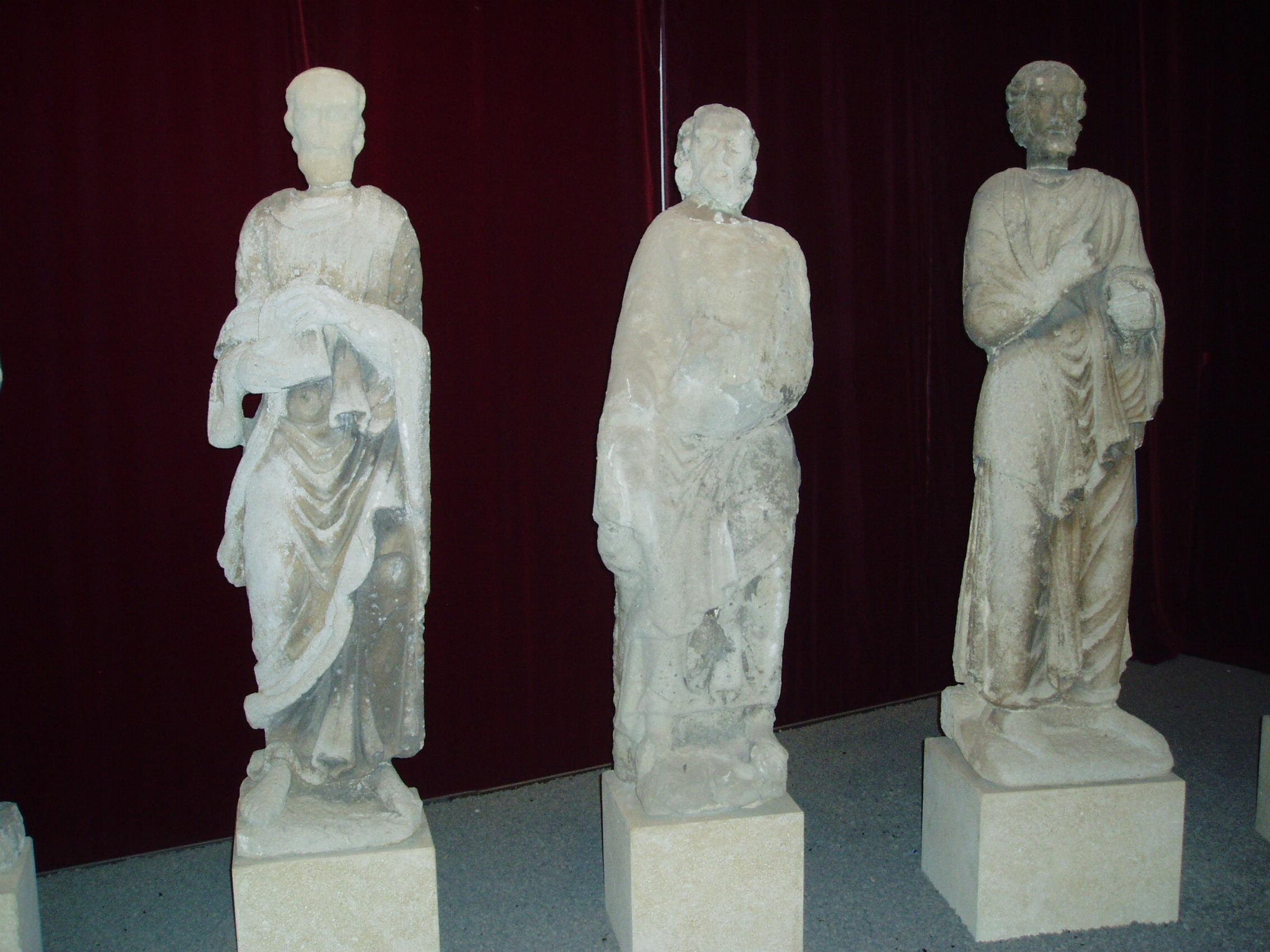 Nyilvános 1002 | 1691 | Szombathely, Kisfaludy utca 9. Savaria Múzeum | Az érdeklődő a Savaria Múzeum nagytermében tekintheti meg a jáki templom (lásd: Ják, Templom) eredeti homlokzati szobrait, amelyek Krisztust és a tizenkét apostolt ábrázolják. Az életnagyságú szobrok a magyarországi későromán szobrászat kiemelkedő alkotásai. Eredetileg a templom kapuépítményének homlokzatát díszítették, lépcsőzetesen elhelyezve, oszlopokkal elválasztott, karéjos záródású fülkékben állva. Jákon jelenleg pontos másolataik láthatók. Kicserélésük oka a nagyértékű szobroknak az időjárás viszontagságaitól való megvédése volt. A jáki apátsági templom, az egykori jáki bencés apátság monumentális bazilikája a magyarországi román stílusú építészet kiemelkedő, szinte szimbolikus alkotása. A hazai középkori nemzetségi monostorok egyedülálló épségben fennmaradt képviselője, mely művészi gazdagságával, a táj képébe illeszkedő mesteri elhelyezésével hívja fel magára a figyelmet. A fénykép 2006 májusában készült. |