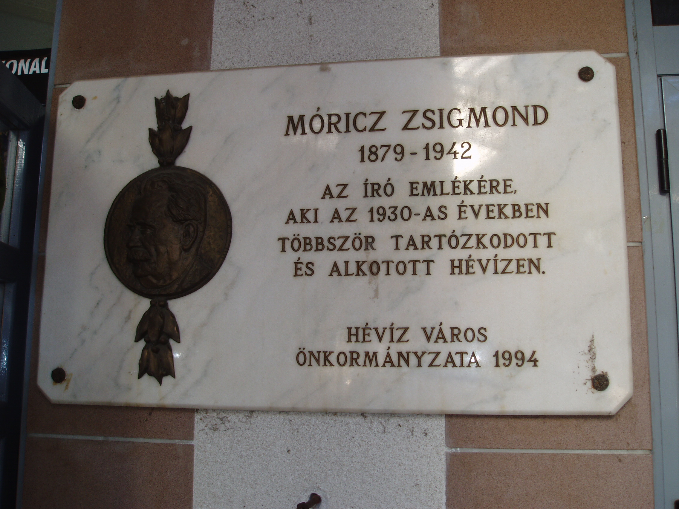 Nyilvános 1232 | 2584 | Hévíz, Schulhof sétány: Hévízi Panteon | A hévízi tó Európa legnagyobb melegvízű tava. Vize a radioaktív termálvizek közé tartozik, s különleges gyógytényező a tó fenekét több méter vastagságban borító iszap is. Gyógyhellyé Hévíz a XVIII. században vált. A XIX. század elején már messze földről látogatták. 1857-ben a Festetics-család birtokába került a település, ezután kezdődött fokozatos kiépülése. A magyar művészvilág tagjai sűrűn látogatták Hévízfürdőt gyógyulás és pihenés céljából. Nekik állít emléket a Szanatórium épületegyüttesének bejáratánál kialakított panteonfal. Itt helyezték el Móricz Zsigmond emléktábláját is, aki az 1930-as években többször tartózkodott és alkotott Hévízen. A felvétel 2006 októberében készült. Felh. irod.: Lárnivalók Zala megyében. Miskolc, Well PRess, 1999 |