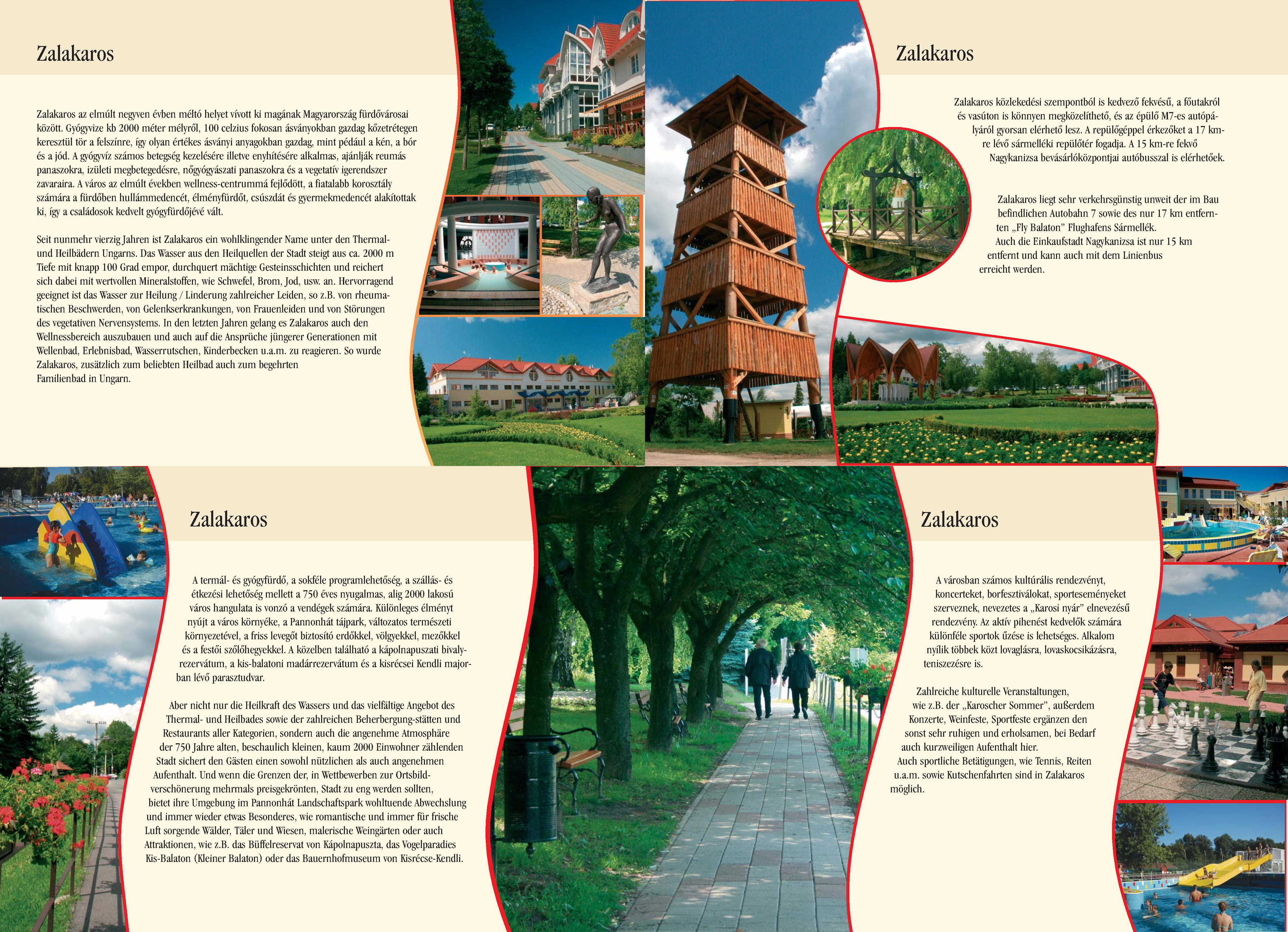 Nyilvános 1852 | 5482 | Zalakaros | Seit nunmehr vierzig Jahren ist Zalakaros ein wohlklingender Name unter den Thermal- und Heilbädern Ungarns. Das Wasser aus den Heilquellen der Stadt steigt aus ca. 2000 m Tiefe mit knapp 100 Grad empor, durchquert mächtige Gesteinsschichten und reichert sich dabei mit wertvollen Mineralstoffen, wie Schwefel, Brom, Jod, usw. an. Hervorragend geeignet ist das Wasser zur Heilung / Linderung zahlreicher Leiden, so z.B. von rheumatischen Beschwerden, von Gelenkserkrankungen, von Frauenleiden und von Störungen des vegetativen Nervensystems. In den letzten Jahren gelang es Zalakaros auch den Wellnessbereich auszubauen und auch auf die Ansprüche jüngerer Generationen mit Wellenbad, Erlebnisbad, Wasserrutschen, Kinderbecken u.a.m. zu reagieren. So wurde Zalakaros, zusätzlich zum beliebten Heilbad auch zum begehrten Familienbad in Ungarn. Aber nicht nur die Heilkraft des Wassers und das vielfältige Angebot des Thermal- und Heilbades sowie der zahlreichen Beherbergung-stätten und Restaurants aller Kategorien, sondern auch die angenehme Atmosphäre der 750 Jahre alten, beschaulich kleinen, kaum 2000 Einwohner zählenden Stadt sichert den Gästen einen sowohl nützlichen als auch angenehmen Aufenthalt. Und wenn die Grenzen der, in Wettbewerben zur Ortsbild-verschönerung mehrmals preisgekrönten, Stadt zu eng werden sollten, bietet ihre Umgebung im Pannonhát Landschaftspark wohltuende Abwechslung und immer wieder etwas Besonderes, wie romantische und immer für frische Luft sorgende Wälder, Täler und Wiesen, malerische Weingärten oder auch Attraktionen, wie z.B. das Büffelreservat von Kápolnapuszta, das Vogelparadies Kis-Balaton (Kleiner Balaton) oder das Bauernhofmuseum von Kisrécse-Kendli. Zahlreiche kulturelle Veranstaltungen, wie z.B. der ,,Karoscher Sommer", außerdem Konzerte, Weinfeste, Sportfeste ergänzen den sonst sehr ruhigen und erholsamen, bei Bedarf auch kurzweiligen Aufenthalt hier. Auch sportliche Betätigungen, wie Tennis, Reiten u.a.m. sowie Kutschenfahrten sind in Zalakaros möglich. Zalakaros liegt sehr verkehrsgünstig unweit der im Bau befindlichen Autobahn 7 sowie des nur 17 km entfernten ,,Fly Balaton" Flughafens Sármellék. Auch die Einkaufstadt Nagykanizsa ist nur 15 km entfernt und kann auch mit dem Linienbus erreicht werden. Dieses Text stammt von: Pannonhát tájpark prospektus 2006. Web: http://www.pannonhat.hu/ (auch in Deutsch) |