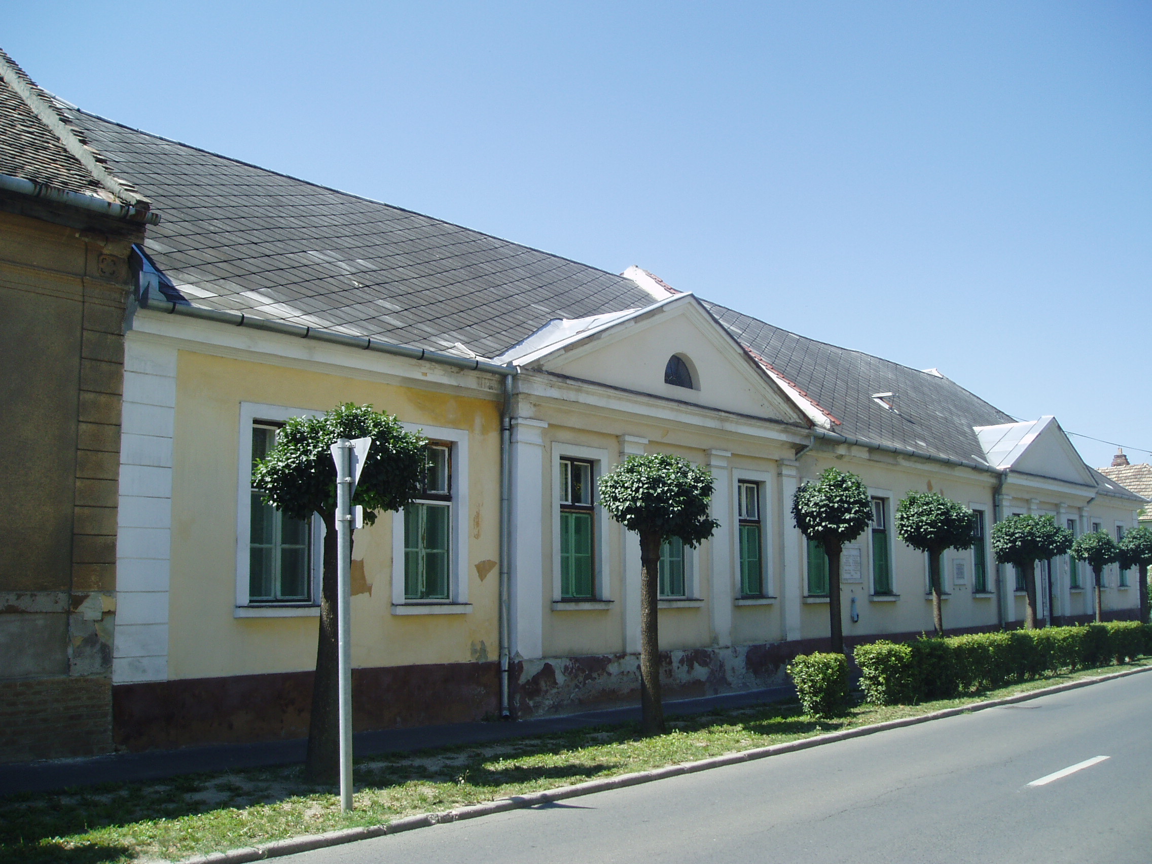 Nyilvános 1287 | 2842 | Gyula, Apor Vilmos tér 1. | Az egykori Németgyula központja az Apor Vilmos mártír püspökről, az egykori gyulai plébánosról elnevezett tér. Meghatározó eleme a közepén álló Szent József-templom, illetve néhány körülötte álló XVIII-XIX. századi épület. Ezek egyike, az egykori németgyulai városháza látható a képen. Régebbi szárnya 1820 körül épült klasszicista stílusban, s 1857-ig ebben működött a városháza. A bal oldali klasszicizáló szárnyat 1874-ben toldották hozzá. Gyula és Németgyula egyesítése óta iskola működik benne. A bejárat mellett emléktábla jelzi, hogy itt, a tanítói lakban született dr. Scherer Ferenc (1889-1987), Gyula városának monográfusa, mely mindmáig az egyik legjobb magyarországi városmonográfia. A másik, kétnyelvű emléktáblát a gyulai németek betelepítésének 270. évfordulója alkalmából helyezték el 1994-ben. A fénykép 2007 júliusában készült. Felh. irod.: Czeglédi Imre: Gyula útikalauz. 2. bőv. kiad. Gyula, 1995 |