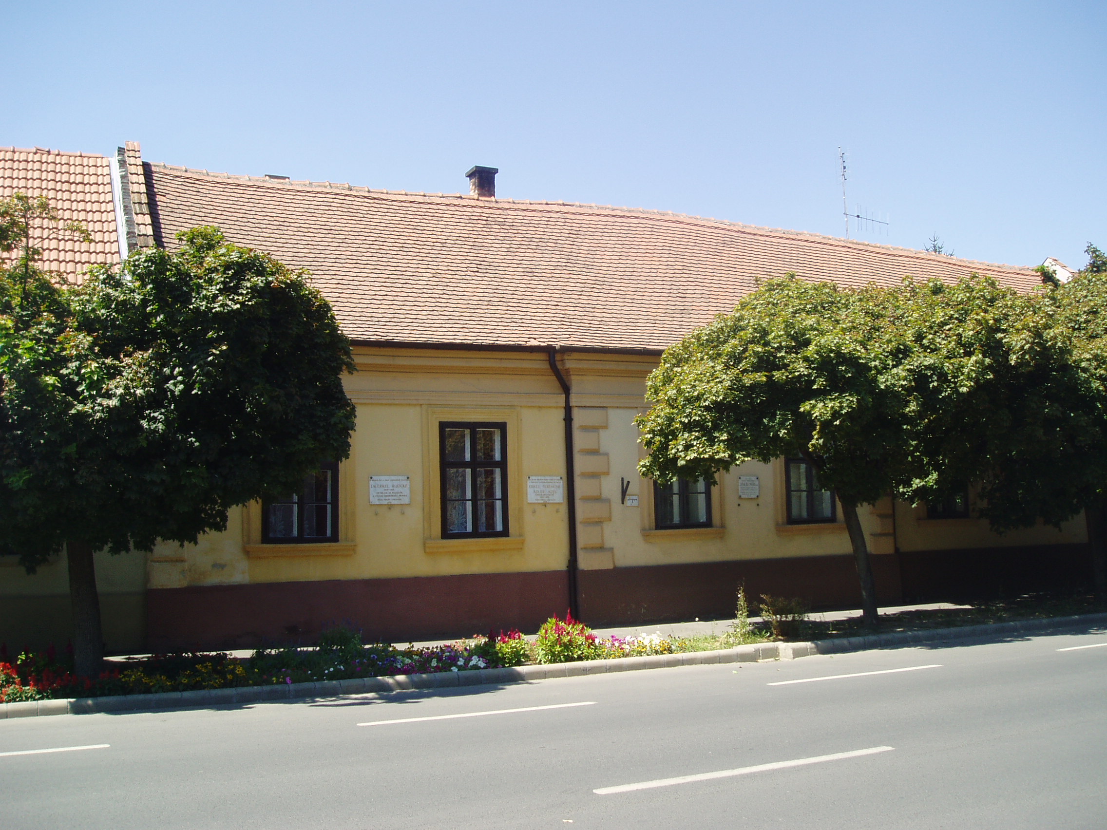 Nyilvános 944 | 1493 | Gyula, Kossuth utca 30. | Az Almásy-kastélyhoz vezető kőhíddal egyvonalban, az utca túlsó oldalán álló földszintes lakóház egykor Erkel Rezső (Rudolf) vármegyei főorvos, Erkel Ferenc öccse lakása volt, ahol a zeneköltő is gyakran megfordult (János testvérük a szomszédban, a mai 28. szám alatt lakott). Jókai Mór két ízben is megfordult a házban. Először Laborfalvy Rózával 1848. augusztus 29-én kötött házasságuk után voltak a ház vendégei (Erkel Rezső korábban a Nemzeti Színház orvosa volt, onnét ismerték egymást). 1849 júliusában, a szabadságharc vége felé Jókai, Pestről elmenekülve az Erkel család vendégszeretetére bízta feleségét, akivel együtt volt a kor kiváló operaénekesnője, Schodelné Klein Róza is, akik a ház két udvari szobájában húzták meg magukat. Ide tért vissza Jókai feleségéért a világosi fegyverletétel után. Erről szól "Egy napom Gyulán" című szívszorító írása: "Ez volt életem legszomorúbb napja. 1849. augusztus 13-án nyitottam be a gyulai Erkel ház ajtaján ezzel a szóval: nincsen hazánk”. Jókai innét utazott álöltözetben, hamis papírokkal Tardonára. 1860-tól haláláig ebben a házban élt Erkel Ferencné Ádler Adél, miután különvált férjétől. Gyulán hunyt el, sírja a Szentháromság-temetőben van. Az épületen Erkel Rudolf, Ádler Adél és Jókai Mór emlékét márványtáblákon örökítették meg. A fénykép 2007 júliusában készült. Felh. irod.: Czeglédi Imre: Gyula útikalauz. 2. jav., bőv. kiad. Gyula, 1995 |