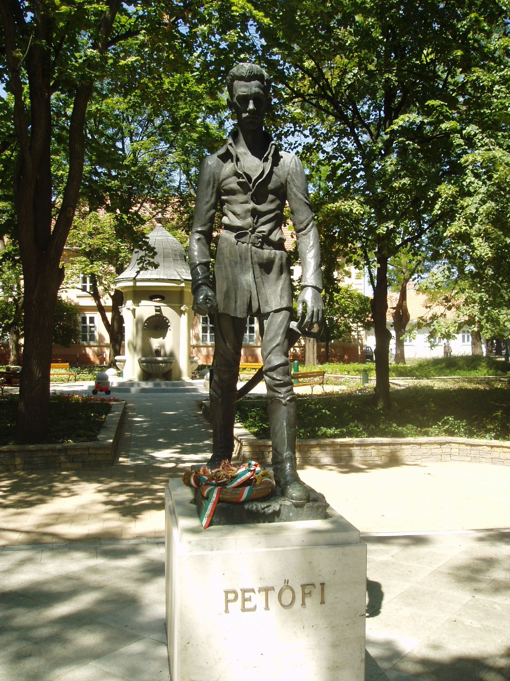 Nyilvános 963 | 2554 | Gyula, Petőfi tér: Petőfi Sándor szobra | A városközponti háromszög alakú hangulatos tér csaknem minden épülete történelmi vagy műemléki érték. A tér közepén Petőfi Sándor egészalakos szobra áll. Leleplezésekor, 1960-ban sokat vitatták az alkotást, mára azonban a legjobb Petőfi-ábrázolások között tartják számon Ferenczy Béni művét. A fénykép 2007 júliusában készült. Felh. irod.: Czeglédi Imre: Gyula útikalauz. 2. jav., bőv. kiad. Gyula, 1995 |