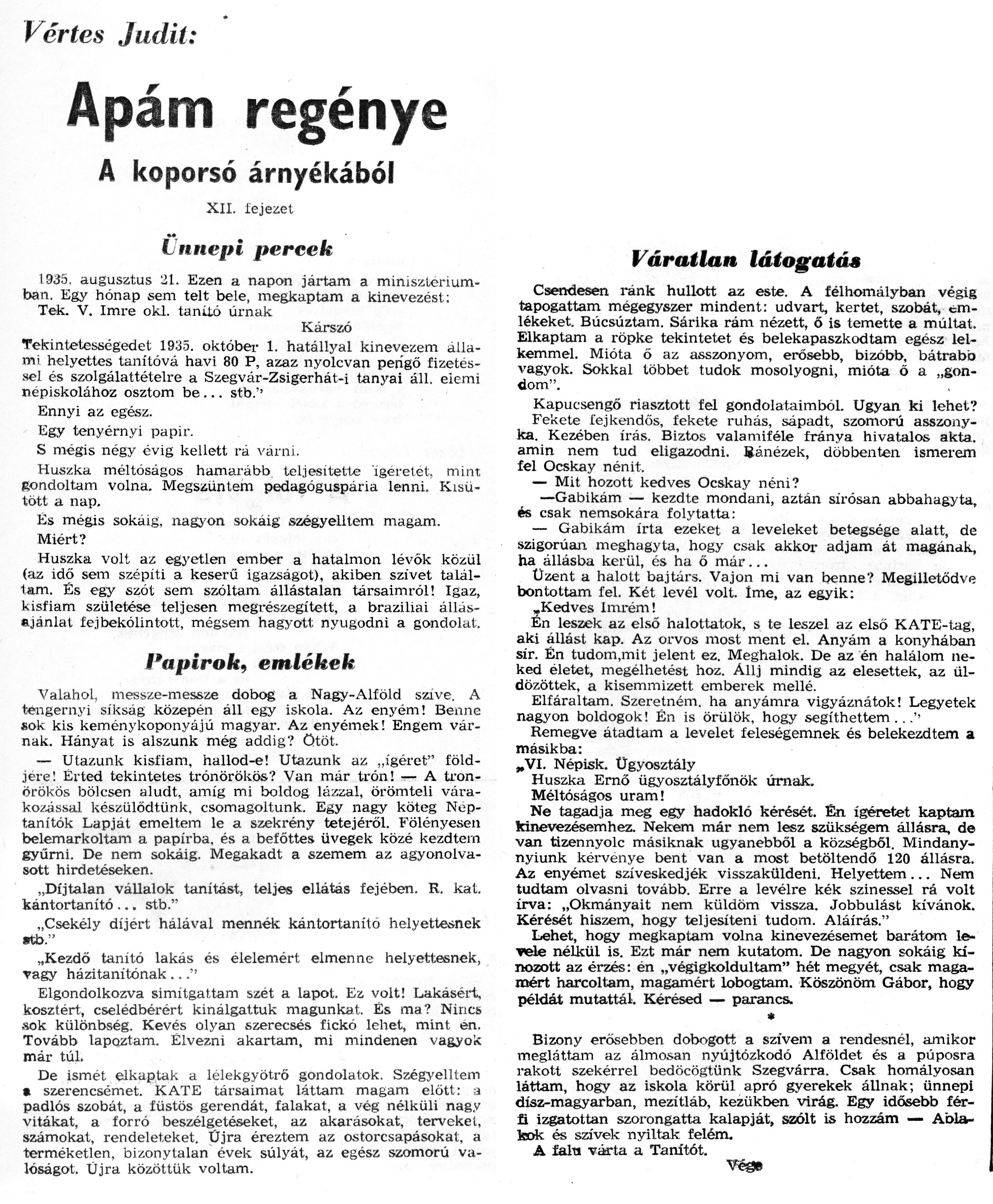Nyilvános 1068 | 2085 | Zalai Hírlap 1971.03.21. 068sz 08old - Apám regénye 12 | A következő szöveg a cikkből keletkezett automata szövegfelismertető segítségével: Vértes Judit: Apám regénye A koporsó árnyékából XII. fejezet Ünnepi percek 1935. augusztus 21. Ezen a napon jártam a minisztériumban. Egy hónap sem telt bele, megkaptam a kinevezést: Tek. V. Imre oki. tanító úrnak Kárszó Tekintetességedet 1935. október 1. hatállyal kinevezem állami, helyettes tanítóvá havi 80 P, azaz nyolcvan pengő fizetéssel és szolgálattételre a Szegvár-Zsigerhát-i tanyai áll. elemi népiskolához osztom be... stb.\'1 Ennyi az egész. . . Egy tenyérnyi papir. S mégis négy évig kellett ra várni. Huszka méltóságos hamarább teljesítette ígéretet, mint gondoltam volna. Megszűntem pedagóguspária lenni. Kisütött a nap. És mégis sokáig, nagyon sokáig szégyelltem magam. Miért? Huszka volt az egyetlen ember a hatalmon lévók közül (az idő sem szépíti a keserű igazságot), akiben szivet találtam. És egy szót sem szóltam, állástalan társaimról! Igaz, kisfiam születése teljesen megrészegített, a braziliai állásajánlat fejbekólintott, mégsem hagyott nyugodni a gondolat. Papírok, emlékek Valahol, messze-messze dobog a Nagy-Alíöld szive. A tengernyi síkság közepén áll egy iskola. Az enyém! Benne sok. kis keménykoponyájú magyar. Az enyémek! Engem várnak. Hányat is alszunk még addig? ötöt. — Utazunk kisfiam, hallod-e! Utazunk az „ígéret" földjére! Érted tekintetes trónörökös? Van már trón! — A trónörökös bölcsen aludt, amíg mi boldog lázzal, örömteli várakozással készülődtünk, csomagoltunk. Egy nagy köteg Néptanítók Lapját emeltem le a szekrény tetejéről. Fölényesen belemarkoltam a papírba, és a beíőttes üvegek közé kezdtem gyűrni. De nem sokáig. Megakadt a szemem az agyonolvasott hirdetéseken. „Díjtalan vállalok tanítást, teljes ellátás fejében. R. kat. kántortanító ... stb." „Csekély díjért hálával mennék kántortanító helyettesnek «ü>." „Kezdő tanító lakás és élelemért elmenne helyettesnek, vagy házitanitónak ..." Elgondolkozva simitgattam szét a lapot. Ez volt! Lakásért, kosztért, cselédbérért kinálgattuk magunkat. És ma? Nincs sok különbség. Kevés olyan szerecsés fickó lehet, mint én. Tovább lapoztam. Élvezni akartam, mi mindenen vagyok már túl. De ismét elkaptak a lélekgyötrő gondolatok. Szégyelltem • szerencsémet. KATE társaimat láttam magam előtt: ;a padlós szobát, a füstös gerendát, falakat, a vég nélküli nagy vitákat, a forró beszélgetéseket, az akarásokat, terveket, számokat, rendeleteket. Üjra éreztem az ostorcsapásokat, a terméketlen, bizonytalan évek súlyát, az egész szomorú valóságot. Üjra közöttük voltam. Váratlan látogatás Csendesen ránk hullott az este. A félhomályban végig tapogattam mégegyszer mindent: udvart, kertet, szobát, emlékeket. Búcsúztam. Sárika rám nézett, ő is temette a múltat. Elkaptam a röpke tekintetet és belekapaszkodtam egész lel-kemmel. Mióta ő az asszonyom, erősebb, bizóbb, bátrabb vagyok. Sokkal többet tudok mosolyogni, mióta ő a „gondom". Kapucsengő riasztott fel gondolataimból. Ugyan ki lehet? Fekete fejkendős, fekete ruhás, sápadt, szomorú asszonyka. Kezében írás. Biztos valamiféle fránya hivatalos akta. amin nem tud eligazodni. Ránézek, döbbenten ismerem fel Ocskay nénit. — Mit hozott kedves Ocskay néni? —Gabikám — kezdte mondani, aztán sirósan abbahagyta, és csak nemsokára folytatta: — Gabikám írta ezeket a leveleket betegsége alatt, de szigorúan meghagyta, hogy csak akkor adjam át magának, ha állásba kerül, és ha ö már... Üzent a halott bajtárs. Vajon mi van benne? Megilletődve bontottam fel. Két levél volt. Íme, az egyik: ,Kedves Imrém! En leszek az első halottatok, s te leszel az első KATE-tag, aki állást kap. Az orvos most ment el. Anyám a konyhában sir. Én tudom.mit jelent ez. Meghalok. De az én halálom neked életet, megélhetést hoz. Állj mindig az elesettek, az üldözöttek, a kisemmizett emberek mellé. Elfáraltam. Szeretném, ha anyámra vigyáznátok! Legyetek nagyon boldogok! Én is örülök, hogy segíthettem .. .\'• Remegve átadtam a levelet feleségemnek és belekezdtem a másikba: „VI. Népisk. Ügyosztály Huszka Ernő ügyosztályfőnök úrnak. Méltóságos uram! Ne tagadja meg egy hadokló kérését. Én ígéretet kaptam kinevezésemhez. Nekem már nem lesz szükségem állásra, de van tizennyolc másiknak ugyanebből a községből. Mindany-nyiunk kérvénye bent van a most betöltendő 120 állásra. Az enyémet szíveskedjék visszaküldeni. Helyettem ... Nem tudtam olvasni tovább. Erre a levélre kék színessel rá volt írva: „Okmányait nem küldöm vissza. Jobbulást kívánok. Kérését hiszem, hogy teljesíteni tudom. Aláírás." Lehet, hogy megkaptam volna kinevezésemet barátom levele nélkül is. Ezt már nem kutatom. De nagyon sokáig kínozott az érzés: én „végigkoldultam" hét megyét, csak magamért harcoltam, magamért lobogtam. Köszönöm Gábor, hogy példát mutattál. Kérésed — parancs. * Bizony erősebben dobogott a szivem a rendesnél, amikor megláttam az álmosan nyújtózkodó Alföldet és a púposra rakott szekérrel bedöcög\'tünk Szegvárra. Csak homályosan láttam, hogy az iskola körül apró gyerekek állnak; ünnepi dísz-magyarban, mezítláb, kezükben virág. Egy idősebb férfi izgatottan szorongatta kalapját, szólt is hozzám — Ablakok és szívek nyíltak felém. A feht várta a Tanítót. |