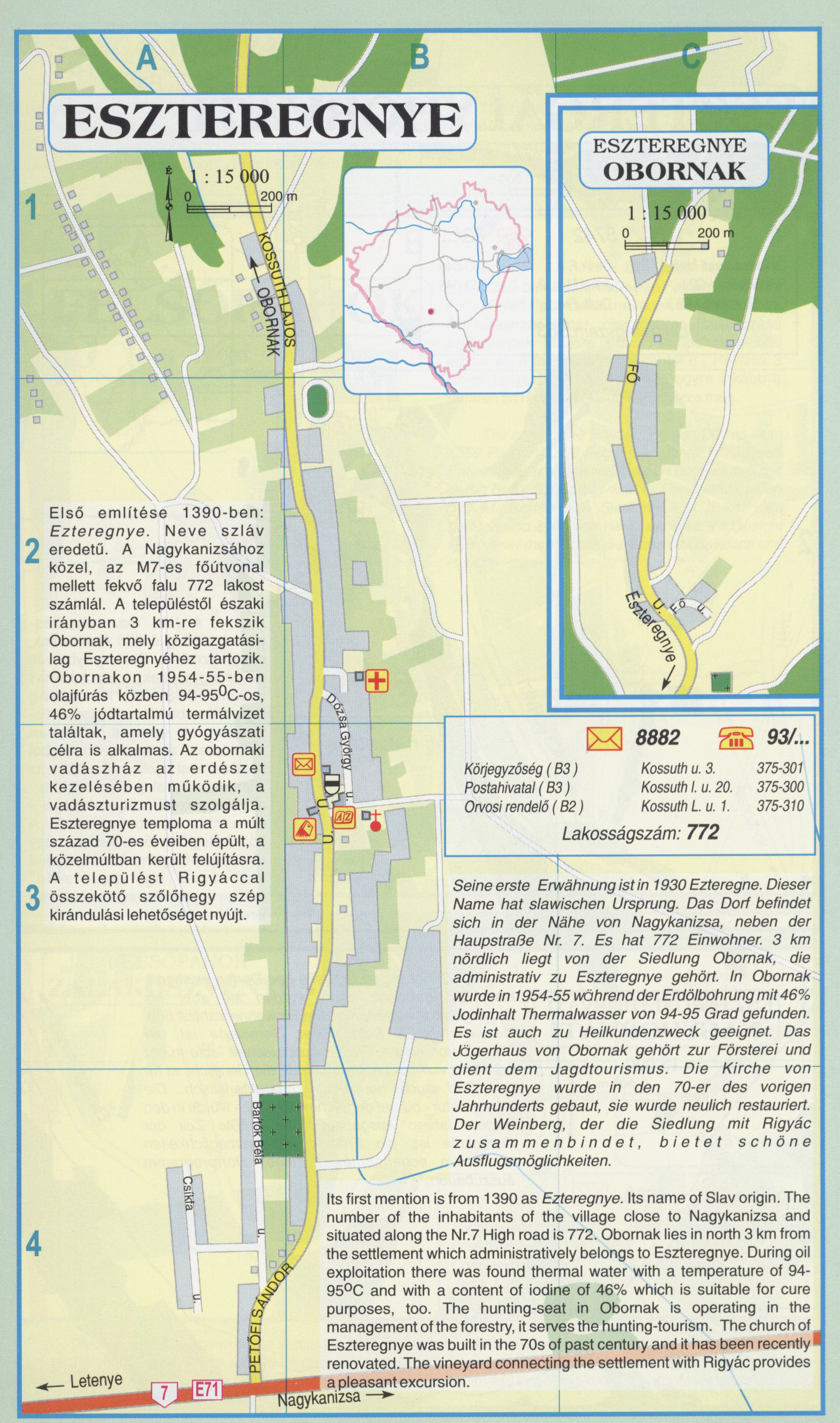 Nyilvános 2406 | 9580 | Eszteregnye | Első említése 1390-ben: Ezteregnye. Neve szláv eredetű. A Nagykanizsához közel, az M7-es főútvonal mellett fekvő falu 772 lakost számlál. A településtől északi irányban 3 km-re fekszik Obornak, mely közigazgatási-lag Eszteregnyéhez tartozik. Obornakon 1954-55-ben olajfúrás közben 94-95°C-os 46% jódtartalmú termálvizet találtak, amely gyógyászati célra is alkalmas. Az obornaki vadászház az erdészet kezelésében működik, a vadászturizmust szolgálja. Eszteregnye temploma a múlt század 70-es éveiben épült, a közelmúltban került felújításra. A települést Rigyáccal összekötő szőlőhegy szép kirándulási lehetőséget nyújt. Seine erste Erwähnung ist in 1930 Ezteregne. Dieser Name hat slawischen Ursprung. Das Dorf befindet sich in der Nähe von Nagykanizsa, neben der Haupstraße Nr. 7. Es hat 772 Einwohner. 3 km nördlich liegt von der Siedlung Obornak, die administrativ zu Eszteregnye gehört. In Obornak wurde in 1954-55 während der Erdölbohrung mit 46% Jodinhalt Thermalwasser von 94-95 Grad gefunden. Es ist auch zu Heilkundenzweck geeignet. Das Jägerhaus von Obornak gehört zur Försterei und dient dem Jagdtourismus. Die Kirche von-Eszteregnye wurde in den 70-er des vorigen Jahrhunderts gebaut, sie wurde neulich restauriert. Der Weinberg, der die Siedlung mit Rigyác zusammenbindet, bietet schöne Ausflugsmöglichkeiten. Its first mention is from 1390 as Ezteregnye. Its name of Slav origin. The number of the inhabitants of the village close to Nagykanizsa and situated along the Nr.7 High road is 772. Obornak lies in north 3 km from the settlement which administratively belongs to Eszteregnye. During oil exploitation there was found thermal water with a temperature of 94-95°C and with a content of iodine of 46% which is suitable for cure purposes, too. The hunting-seat in Obornak is operating in the management of the forestry, it serves the hunting-tourism. The church of. Eszteregnye was built in the 70s of past century and it has been recently\' renovated. The vineyard connecting the settlement with Rigyác provides a pleasant excursion. A részlet a következő kiadványból származik/Die Teile stammen vom volgenden Buch/This text came from the following book: Cím/Titel/Title: Zala megye településeinek atlasza - 257 település részletes térképe/Atlas der Komitat Zala - 257 Detailte Siedlungskarten/Zala county\'s Atlas - 257 settlement maps. Közreműködő/contributor: Lackner László (1943) (fotó) Kiadás/Ausgabe/Publisher: Gyula : HISZI-MAP, 1997 Sorozat/Serie/Series: Indulástól - megérkezésig... ETO: 912(439.121-2) ; 908.439.121 Cutter: Z 19 ISBN: 963-610-025-4 Oldalszám/Seiten/Pages: 323, 81 p. Megjegyzés/Note: Lezárva/Abgeschlossen am/Closed am: 1997. máj. 30. |