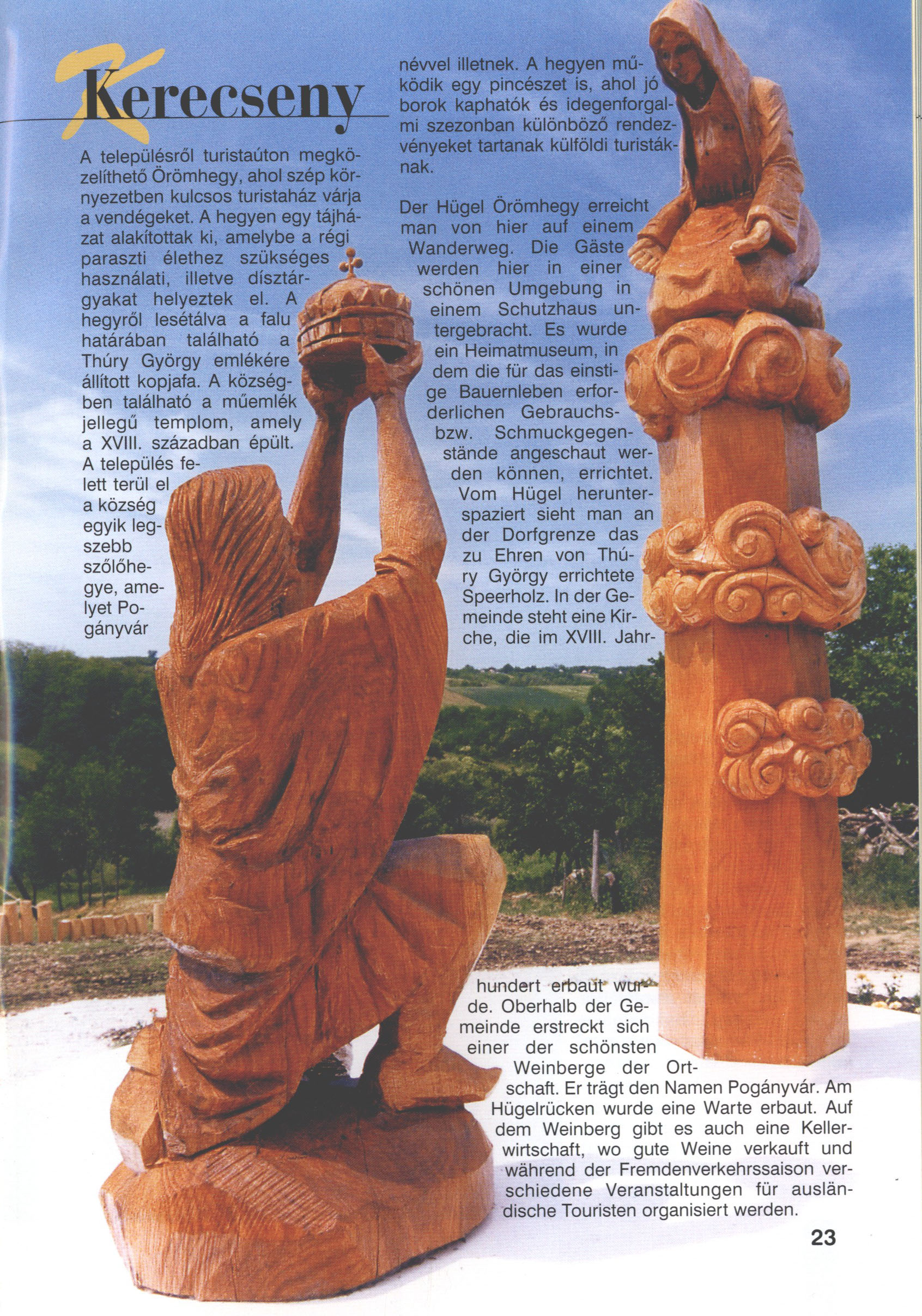 Nyilvános 2132 | 5840 | Kerecseny | Der Hügel Örömhegy erreicht man von hier auf einem Wanderweg. Die Gäste werden hier in einer schönen Umgebung in einem Schutzhaus untergebracht. Es wurde ein Heimatmuseum, in dem die für das einstige Bauernleben erforderlichen Gebrauchs bzw. Schmuckgegenstände angeschaut werden können, errichtet. Vom Hügel herunterspaziert sieht man an der Dorfgrenze das zu Ehren von Thúry György errichtete Speerholz. In der Gemeinde steht eine Kirche, die im XVIII. Jahrhundert erbaut wurde. Oberhalb der Gemeinde erstreckt sich einer der schönsten Weinberge der Ortschaft. Er trägt den Namen Pogányvár. Am Hügelrücken wurde eine Warte erbaut. Auf dem Weinberg gibt es auch eine Kellerwirtschaft, wo gute Weine verkauft und während der Fremdenverkehrssaison verschiedene Veranstaltungen für ausländische Touristen organisiert werden. Dieses Text stammt von: Titel: Hívogató a Régiók Kapujában - Útikönyv Látnivalók Nagykanizsán és Térségében (Einladend in dem Tor des Gebiets - Reisebuch - Sehenswürdigkeiten in Nagykanizsa und Umgebung) Herausgegeben von: Nagykanizsa és a Környező Települések Területfejlesztési Társulása (Verein für Gebietsentwicklung in Nagykanizsa und in ihrer Umgebung) 8800 Nagykanizsa, Petőfi Sándor út 5. Tel.: 06 93/536-453 • 06 93/536-454 Tel ./Fax: 06 93/326-323 E-mail: terstars@axelero.hu www.kanizsaterseg.celodin.hu |