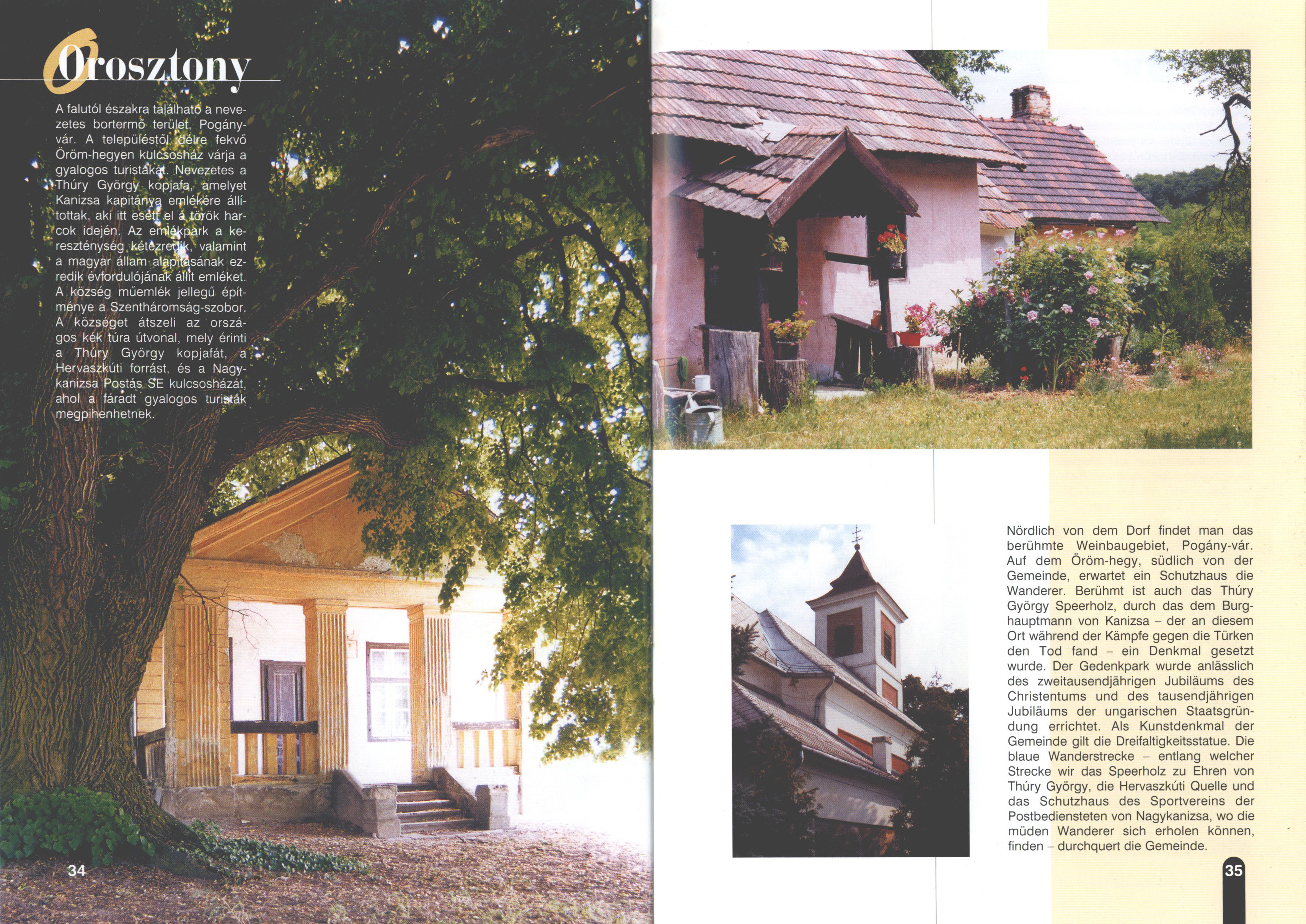 Nyilvános 2316 | 7893 | Orosztony | Nördlich von dem Dorf findet man das berühmte Weinbaugebiet, Pogány-vár. Auf dem Öröm-hegy, südlich von der Gemeinde, erwartet ein Schutzhaus die Wanderer. Berühmt ist auch das Thúry György Speerholz, durch das dem Burghauptmann von Kanizsa - der an diesem Ort während der Kämpfe gegen die Türken den Tod fand - ein Denkmal gesetzt wurde. Der Gedenkpark wurde anlässlich des zweitausendjährigen Jubiläums des Christentums und des tausendjährigen Jubiläums der ungarischen Staatsgründung errichtet. Als Kunstdenkmal der Gemeinde gilt die Dreifaltigkeitsstatue. Die blaue Wanderstrecke - entlang welcher Strecke wir das Speerholz zu Ehren von Thúry György, die Hervaszkúti Quelle und das Schutzhaus des Sportvereins der Postbediensteten von Nagykanizsa, wo die müden Wanderer sich erholen können, finden - durchquert die Gemeinde. Dieses Text stammt von: Titel: Hívogató a Régiók Kapujában - Útikönyv Látnivalók Nagykanizsán és Térségében (Einladend in dem Tor des Gebiets - Reisebuch - Sehenswürdigkeiten in Nagykanizsa und Umgebung) Herausgegeben von: Nagykanizsa és a Környező Települések Területfejlesztési Társulása (Verein für Gebietsentwicklung in Nagykanizsa und in ihrer Umgebung) 8800 Nagykanizsa, Petőfi Sándor út 5. Tel.: 06 93/536-453 • 06 93/536-454 Tel ./Fax: 06 93/326-323 E-mail: terstars@axelero.hu www.kanizsaterseg.celodin.hu |