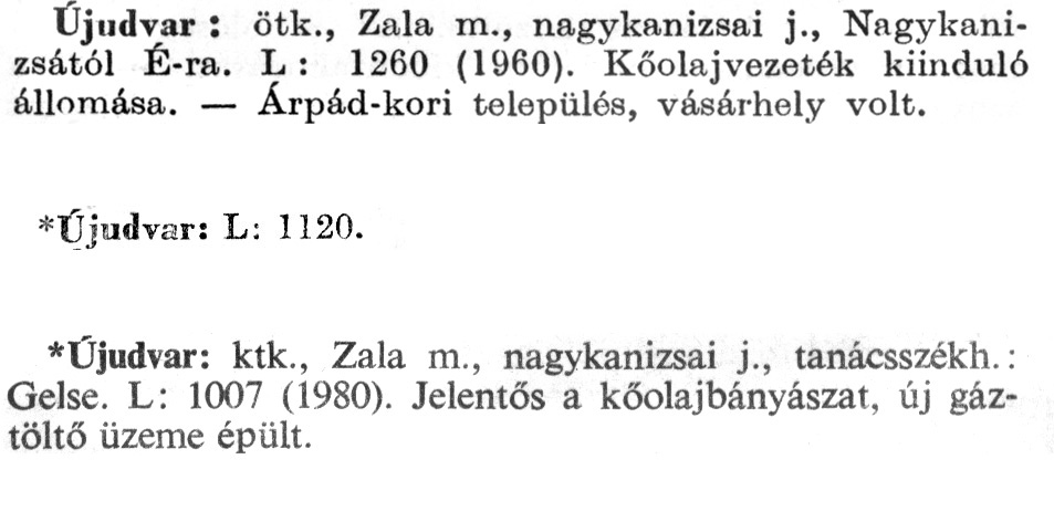 Nyilvános 2237 | 6014 | A szócikkek felismertetett szövege: | (Az első csillag után az 1972-es, a második csillag után az 1981-es kiadású kiegészítő kötetből származó szöveg következik) Újudvar: ötk., Zala m., nagykanizsai j., Nagykanizsától É-ra. L: 1260 (1960). Kőolajvezeték kiinduló állomása. – Árpád-kori település, vásárhely volt. *Újudvar: L: 1120. *Újudvar: ktk., Zala m., nagykanizsai j., tanácsszékh.: Gelse. L: 1007 (1980). Jelentős a kőolajbányászat, új gáztöltő üzeme épült. A szócikkek a következő lexikonból származnak: Cím: Új magyar lexikon Közreműködő: Berei Andor (1900-1979) (szerk.) Szerz. közl.: [szerk. Berei Andor et al.] Kiadás jelzés: 2. lny. Kiadás: Budapest : Akad. K., 1961-1962 Kötetei: 1., A - C 2., D - F 3., G - J 4., K - Me 5., Mf - R 6., S - Z 7. köt., A-Z Kiegészítő kötet (1972) Kiegészítő kötet, 1962÷1980 (1981) ETO jelzet: 03=945.11 Szakjelzet: 030 Cutter: U 28 Nyelv: magyar Megjegyzés: Bibliogr. a címszavak egy részének végén |