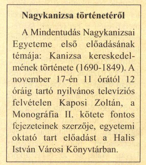 Nyilvános 2272 | 4363 | Kanizsa 2008. november 13. 38. szám 16. oldal - Nagykanizsa történetéről | Előzetes a november 17-i előadáshoz Cím: Kanizsa Alcím: Dél-Zalai Hetilap Megjelenés: Hetenként: 1989-től ISSN: 0865-3879 A cikk szövege: Nagykanizsa történetéről A Mindentudás Nagykanizsai Egyeteme első előadásának témája: Kanizsa kereskedelmének története (1690-1849). A november 17-én 11 órától 12 óráig tartó nyilvános televíziós felvételen Kaposi Zoltán, a Monográfia II. kötete fontos fejezeteinek szerzője, egyetemi oktató tart előadást a Halis István Városi Könyvtárban. |