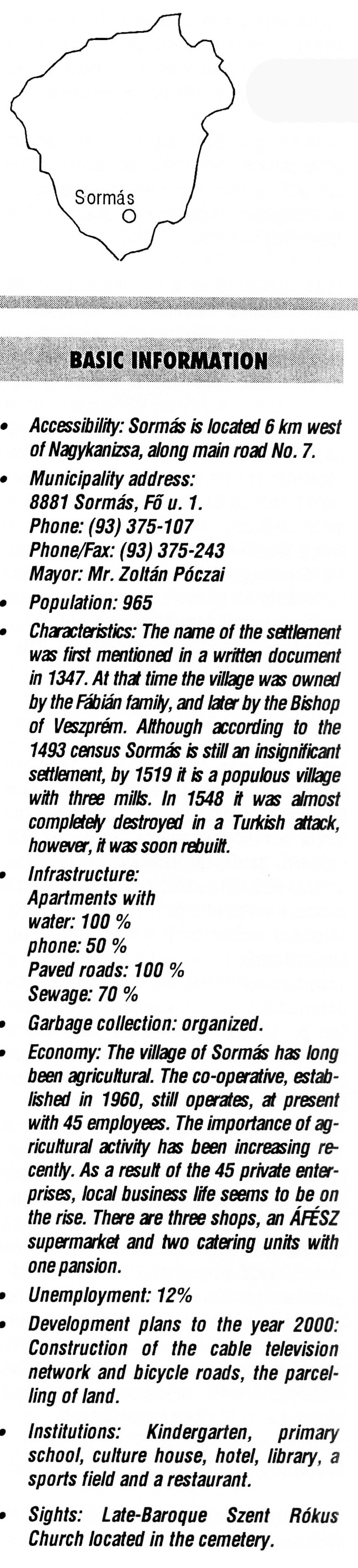 Nyilvános 2189 | 7834 | Sormás | BASIC INFORMATION Accessibility: Sormás is located 6 km west of Nagykanizsa, along main road No. 7. Municipality address: 8881 Sormás, Fő u. 1. Phone: (93) 375-107 Phone/Fax: (93) 375-243 Mayor: Mr. Zoltán Póczai Population: 965 Characteristics: The name of the settlement was first mentioned in a written document in 1347. At that time the village was owned by the Fábián family, and later by the Bishop of Veszprém. Although according to the 1493 census Sormás is still an insignificant settlement, by 1519 it is a populous village with three mills. In 1548 it was almost completely destroyed in a Turkish attack, however, it was soon rebuilt. Infrastructure: Apartments with water: 100 % phone: 50 % Paved roads: 100 % Sewage: 70 % Garbage collection: organized. Economy: The village of Sormás has long been agricultural. The co-operative, established in 1960, still operates, at present with 45 employees. The importance of agricultural activity has been increasing recently. As a result of the 45 private enterprises, local business life seems to be on the rise. There are three shops, an ÁFÉSZ supermarket and two catering units with one pansion. Unemployment: 12% Development plans to the year 2000: Construction of the cable television network and bicycle roads, the parcelling of land. Institutions: Kindergarten, primary school, culture house, hotel, library, a sports field and a restaurant. Sights: Late-Baroque Szent Rókus Church located in the cemetery. This text came from the following book: Title: Handbook of Zala county (Zala megye kézikönyve) Series: County handbooks of Hungary (Magyarország megyei kézikönyvei) Chief editor: Hóbor József Publisher: (Hatvan), CEBA-Hungary Ltd, 1998 ETO: 908.439.121(035) ; 050.8(439.121) ISBN: 963-9089-18-2 Pages: 488-1040 p. Remark: Closed on: 1998. márc. 31. |