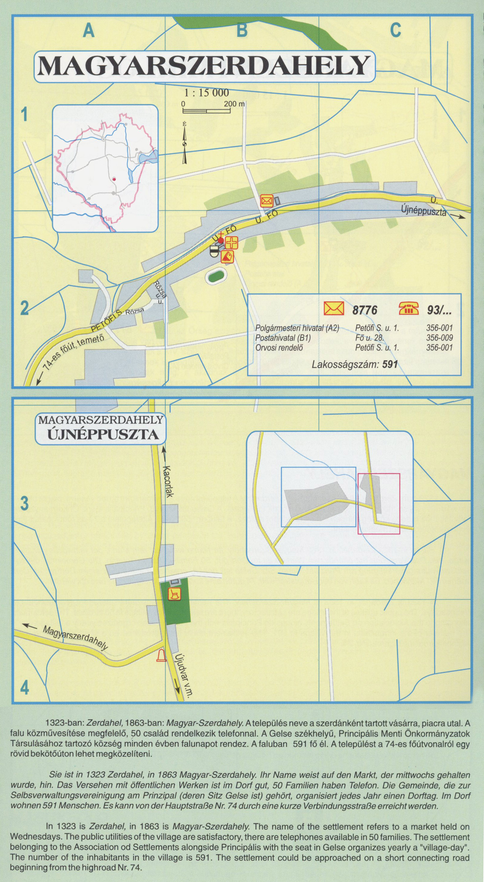 Nyilvános 2430 | 9436 | MAGYARSZERDAHELY | 1323-ban: Zerdahel, 1863-ban: Magyar-Szerdahely. A település neve a szerdánként tartott vásárra, piacra utal. A falu közművesítése megfelelő, 50 család rendelkezik telefonnal. A Gelse székhelyű, Principális Menti Önkormányzatok Társulásához tartozó község minden évben falunapot rendez. A faluban 591 fő él. A települést a 74-es főútvonalról egy rövid bekötőúton lehet megközelíteni. Sie ist in 1323 Zerdahel, in 1863 Magyar-Szerdahely. Ihr Name weist auf den Markt, der mittwochs gehalten wurde, hin. Das Versehen mit öffentlichen Werken ist im Dorf gut, 50 Familien haben Telefon. Die Gemeinde, die zur Selbsverwaltungsvereinigung am Prinzipal (deren Sitz Gelse ist) gehört, organisiert jedes Jahr einen Dorftag. Im Dorf wohnen 591 Menschen. Es kann von der Hauptstraße Nr. 74 durch eine kurze Verbindungsstraße erreicht werden. In 1323 is Zerdahel, in 1863 is Magyar-Szerdahely. The name of the settlement refers to a market held on Wednesdays. The public utilities of the village are satisfactory, there are telephones available in 50 families. The settlement belonging to the Association od Settlements alongside Principális with the seat in Gelse organizes yearly a "village-day". The number of the inhabitants in the village is 591. The settlement could be approached on a short connecting road beginning from the highroad Nr. 74. |
