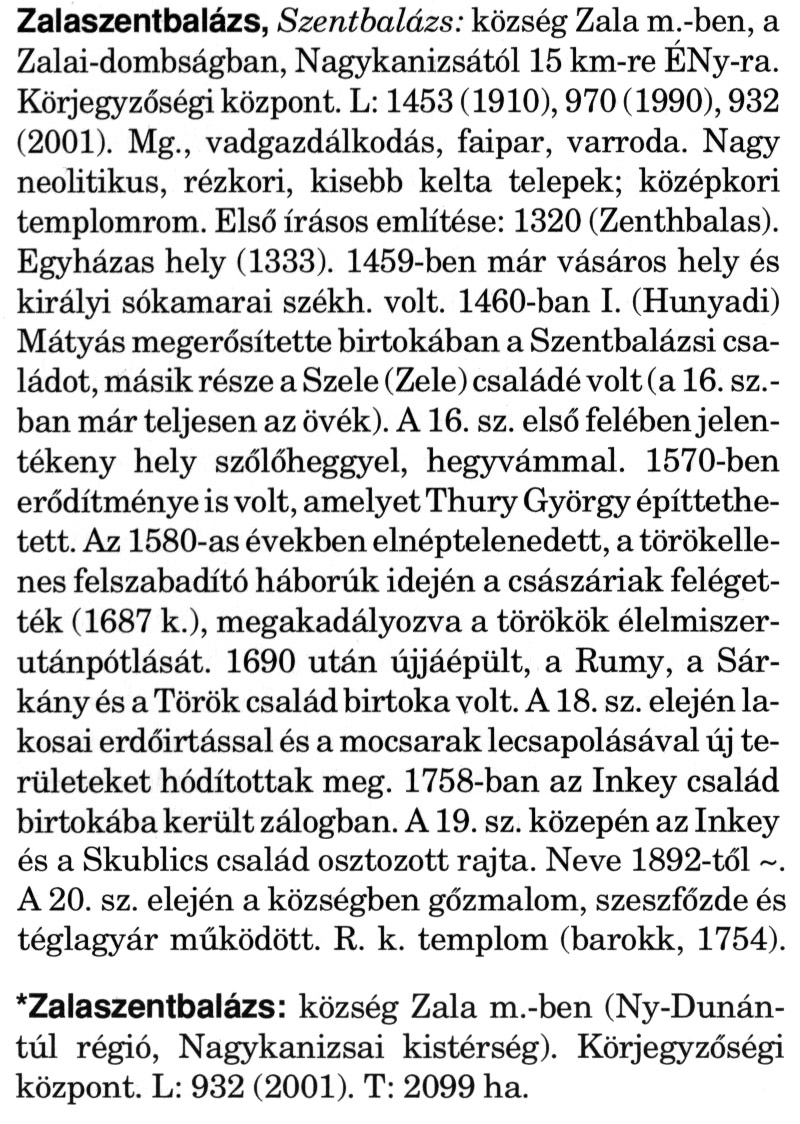 Nyilvános 1920 | 5682 | A szócikkek felismertetett szövege: | (A csillag után a kiegészítő kötetből származó szöveg következik) Zalaszentbalázs, Szentbalázs: község Zala m.-ben, a Zalai-dombságban, Nagykanizsától 15 km-re ÉNy-ra. Körjegyzőségi központ. L: 1453 (1910), 970 (1990), 932 (2001). Mg., vadgazdálkodás, faipar, varroda. Nagy neolitikus, rézkori, kisebb kelta telepek; középkori templomrom. Első írásos említése: 1320 (Zenthbalas). Egyházas hely (1333). 1459-ben már vásáros hely és királyi sókamarai székh. volt. 1460-ban I. (Hunyadi) Mátyás megerősítette birtokában a Szentbalázsi családot, másik része a Szele (Zele) családé volt (a 16. sz.-ban már teljesen az övék). A 16. sz. első felében jelentékeny hely szőlőheggyel, hegyvámmal. 1570-ben erődítménye is volt, amelyet Thury György építtethetett. Az 1580-as években elnéptelenedett, a törökellenes felszabadító háborúk idején a császáriak felégették (1687 k.), megakadályozva a törökök élelmiszerutánpótlását. 1690 után újjáépült, a Rumy, a Sárkány és a Török család birtoka volt. A 18. sz. elején lakosai erdőirtással és a mocsarak lecsapolásával új területeket hódítottak meg. 1758-ban az Inkey család birtokába került zálogban. A 19. sz. közepén az Inkey és a Skublics család osztozott rajta. Neve 1892-től ~. A 20. sz. elején a községben gőzmalom, szeszfőzde és téglagyár működött. R. k. templom (barokk, 1754). *Zalaszentbalázs: község Zala m.-ben (Ny-Dunán-túl régió, Nagykanizsai kistérség). Körjegyzőségi központ. L: 932 (2001). T: 2099 ha. A szócikkek a következő lexikonból származnak: Cím: Magyar nagylexikon Közreműködő: Élesztős László (1949) (szerk.) ; Barabás Éva (1943) (szerk.) ; Berényi Gábor (1946) (szerk.) ; Bárány Lászlóné (szerk.) ; Adelmann-né Kertész Judit (1945) (közrem.) ; Froemel Károlyné Jáky Éva (1936) (közrem.) ; Akadémiai Kiadó és Nyomda Vállala Szerz. közl.: [... Élesztős László főszerk.] ; [szerk. Barabás Éva et al.] ; [bibliogr. Adelmanné Kertész Judit] ; [kész. az Akadémiai Kiadó Magyar Nagylexikon Szerkesztőségében] Kiadás: Budapest : Akad. K., 1993- Kötetei: 1. köt., A - Anc 2. köt., And - Bag 3. köt., Bah - Bij 4. köt., Bik - Bz 5. köt., C - Csem 6. köt., Csen - Ec 7. köt., Ed - Fe 8. köt., Ff - Gyep 9. köt., Gyer - Iq 10. köt., Ir - Kip 11. köt., Kir - Lem 12. köt., Len - Mep 13. köt., Mer - Nyk 14. köt., Nyl - Pom 15. köt., Pon - Sek 16. köt., Sel - Szö 17. köt., Szp - Ung 18. köt., Unh - Z 19. köt., Kiegészítő kötet, A - Z ETO jelzet: 030=945.11 Szakjelzet: 030 Cutter: M 14 ISBN: 963-05-6611-7 [!ISBN 963-05-6615-X] Nyelv: magyar Megjegyzés: Az 5. kötettől kiad. a Magyar Nagylexikon Kiadó ; A 6. kötettől főszerk. Berényi Gábor ; A 6. kötettől szakszerk. Bárány Lászlóné et al. ; A 6. kötettől bibliogr. Froemel Károlyné ; Bibliogr. a szócikkek végén |