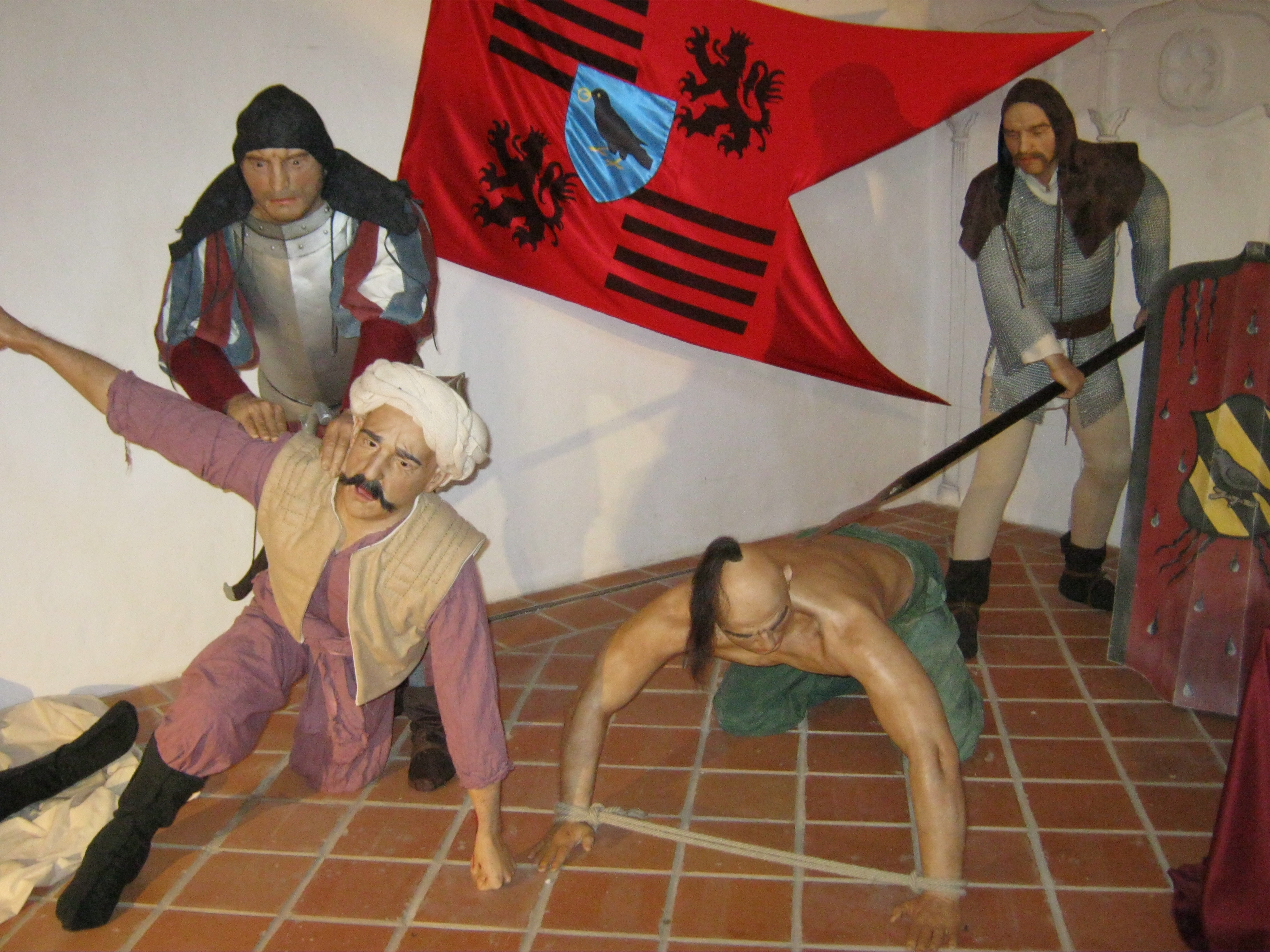 Nyilvános 921 | 1304 | Nyírbátor, Vár utca 1. Báthori várkastély | A Báthoriak várkastélyának többször átalakított egyetlen megmaradt épületét a közelmúltban állították helyre. Pincéjében reneszánsz étterem látogatható, földszintjén és emeletén a Báthori Panoptikum 45 élethű és korhű viaszfigurában mutatja be érzékletesen a jeles nemesi család és Nyírbátor történetét. A figurák tervezője és készítője Megyeri János szobrászművész. A megtekintést olvasható és hallgatható kalauzolás kíséri. A kiállítást a kenyérmezei csata 530. évfordulóján, 2009.október 13-án adták át. Az 1479-ben a törökkel vívott csata egyik hőse Báthori István volt. A képen a kenyérmezei csata egy jelenete látható. Felh. irod.: Látnivalók Szabolcs-Szatmár-Bereg megyében. Miskolc, Well-PRess, 1999 www.bathorivarkastely.hu A fénykép 2010 augusztus elején készült. |