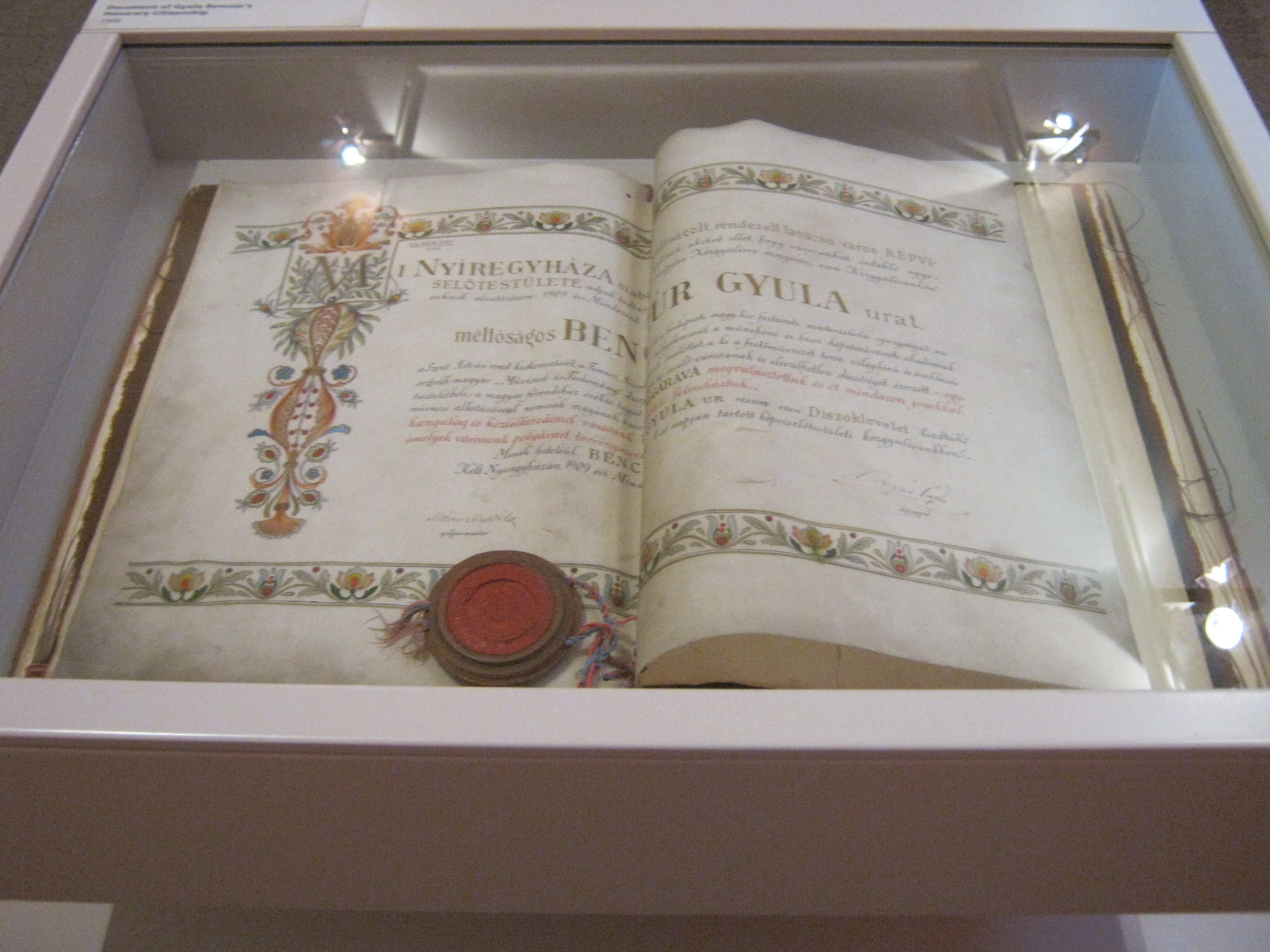Nyilvános 950 | 1426 | Nyíregyháza, Benczúr tér 21. Jósa András Múzeum | Magyarország egyik legrégibb múzeumát Dr. Jósa András alapította 1868-ban, akinek ma nevét viseli. A képen Benczúr Gyula emlékszobájának részlete. A nagy magyar festőművész 1844-ben Nyíregyházán született (lásd: Nyíregyháza, Kossuth tér 8.), apja gyógyszerész volt. A Benczúr-emlékszobában alkotásai mellett eredeti bútorok, s a festőművész több használati tárgya is megtekinthető. A képen Benczúr 1909-ből származó díszpolgári oklevele. Felh. irod.: Látnivalók Szabolcs-Szatmár-Bereg megyében. Miskolc, Well-PRess, 1999 http://jam.nyirbone.hu A fénykép 2010 augusztus elején készült. |