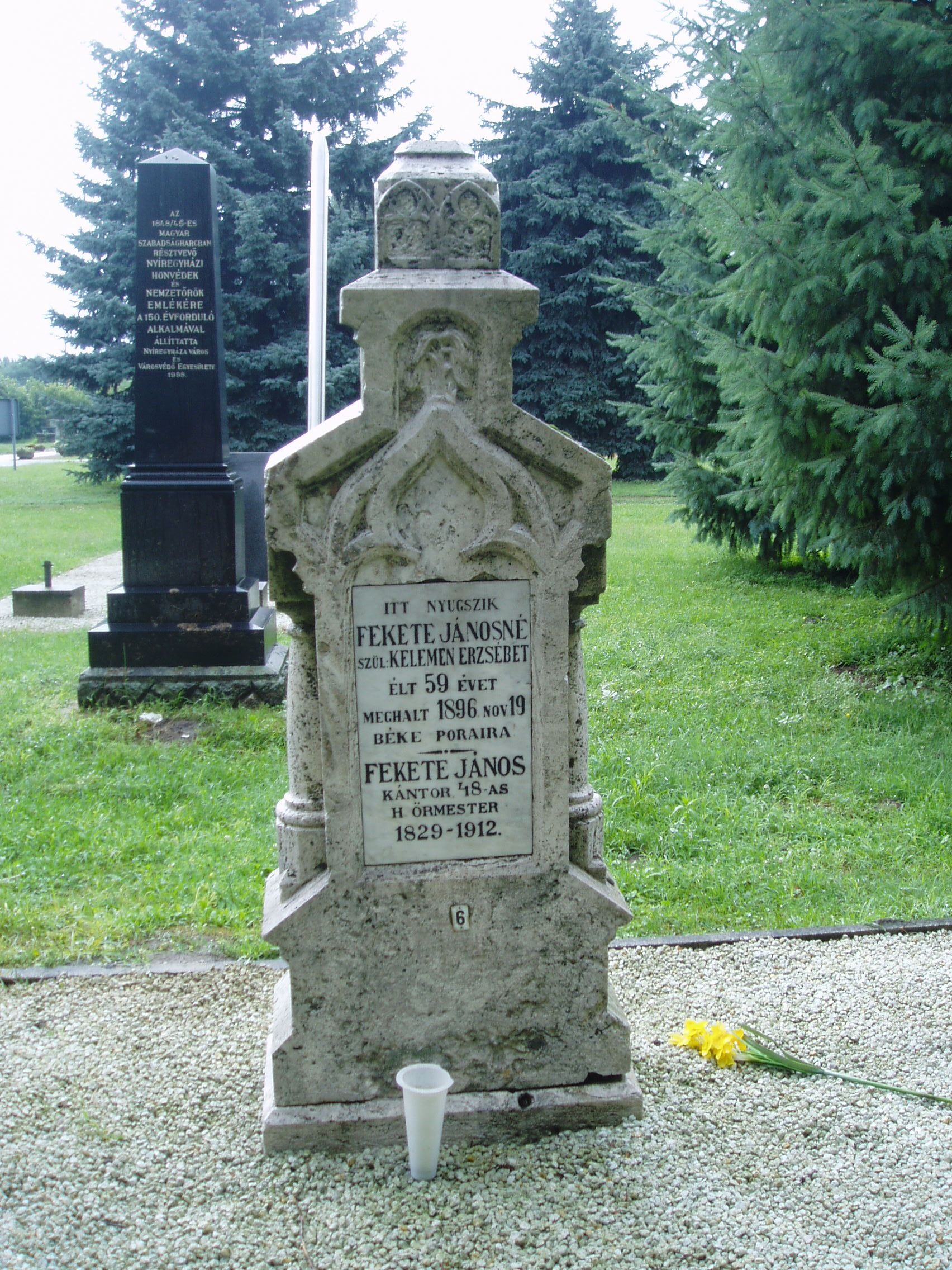 Nyilvános 993 | 1608 | Nyíregyháza, Pazonyi tér, Északi temető: Fekete János | A Dózsa György út vezet Nyíregyháza Északi temetőjébe. A ravatalozó közelében, a díszsírhelyek között találjuk Fekete János (1829-1912) kántor, 1848-as honvéd őrmester sírkövét. Felh. irod.: Fazekas Árpád - Szekrényes András: Nyíregyháza temetői. Nyíregyháza, 1990 A fénykép 2010 augusztus elején készült |