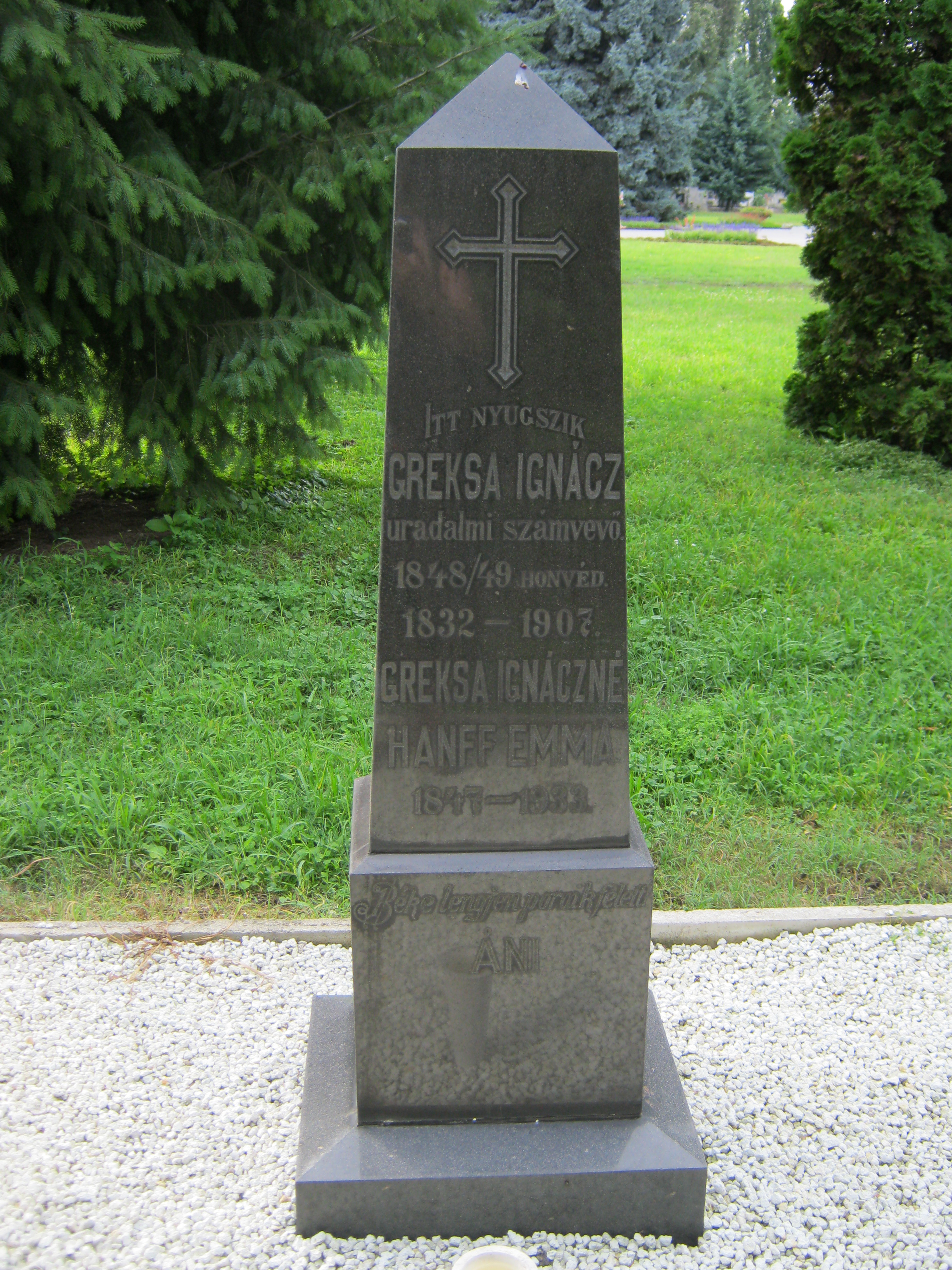 Nyilvános 962 | 1455 | Nyíregyháza, Pazonyi tér, Északi temető: Greksa Ignác | A Dózsa György út vezet Nyíregyháza Északi temetőjébe. A díszsírhelyek sorában itt találjuk Greksa Ignác (1832-1907) uradalmi számvevő, 1848-as honvéd sírkövét. Felh. irod.: Fazekas Árpád - Szekrényes András: Nyíregyháza temetői. Nyíregyháza, 1990 A fénykép 2010 augusztus elején készült |