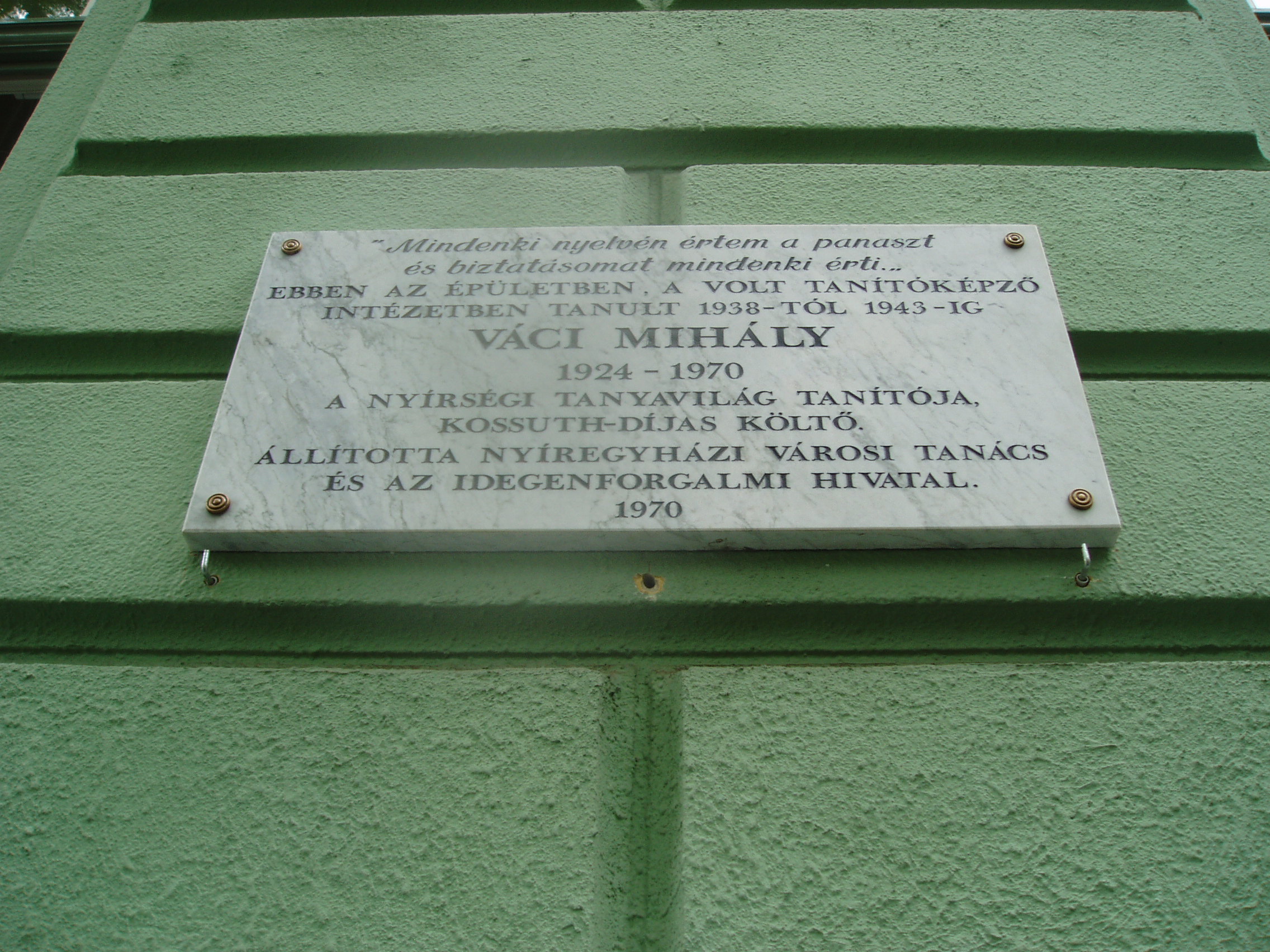 Nyilvános 904 | 1273 | Nyíregyháza, Széchenyi utca 6. Kölcsey Ferenc Gimnázium | Épületét 1901-ben, Barzó Mihály tervei alapján, pénzügyigazgatósági székháznak emelték. 1925-től, 1957-ben történt megszűnéséig középfokú tanítóképző intézetként működött. Azóta a Kölcsey gimnázium otthona. Az első gimnáziumi osztály 1954/55-ben még egy korábbi épületben kezdte meg a tanulást, de már itt érettségizett 1959-ben. Az iskolaépület homlokzatán több emléktábla idézi az egykori tanítóképző, majd gimnázium neves tanárainak és diákjainak alakját. Váci Mihály (1924-1971) költő 1938 és 1943 között volt ebben az épületben a tanítóképző intézet diákja. Felh. irod.: www.kolcsey-nyh.sulinet.hu A fénykép 2010 augusztus elején készült |
