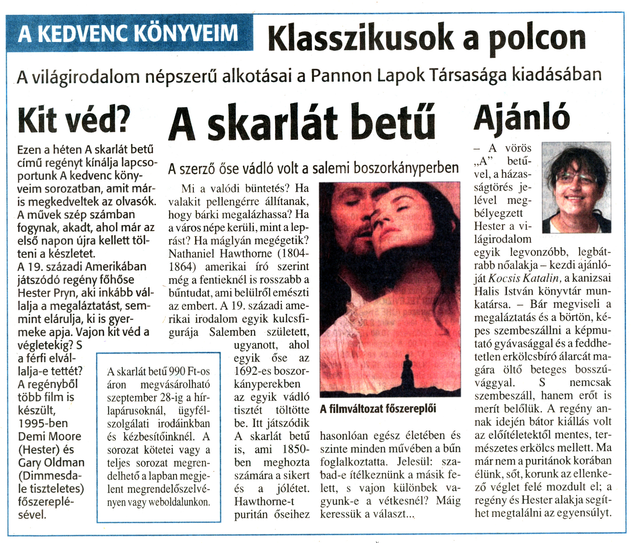 Nyilvános 1135 | 1537 | Zalai Hírlap 2010. szeptember 22. 221. szám 7. oldal - A Klasszikusok a polcon sorozat újabb regényét ajánlja Kocsis Katalin, a Halis István Városi Könyvtár munkatársa | A cikk szövege: A KEDVENC KÖNYVEIM Klasszikusok a polcon A világirodalom népszerű alkotásai a Pannon Lapok Társasága kiadásában Kit véd? Ezen a héten A skarlát betű című regényt kínálja lapcsoportunk A kedvenc könyveim sorozatban, amit máris megkedveltek az olvasók. A művek szép számban fogynak, akadt, ahol már az első napon újra kellett tölteni a készletet. A 19. századi Amerikában játszódó regény főhőse Hester Pryn, aki inkább vállalja a megaláztatást, semmint elárulja, ki is gyermeke apja. Vajon kit véd a végletekig? S a férfi elvállalja-e tettét? A regényből több film is készült, 1995-ben Demi Moore (Hester) és Gary Oldman (Dimmesdale tiszteletes) főszereplésével. A skarlát betű A szerző őse vádló volt a salemi boszorkányperben Mi a valódi büntetés? Ha valakit pellengérre állítanak, hogy bárki megalázhassa? Ha a város népe kerüli, mint a leprást? Ha máglyán megégetik? Nathaniel Hawthorne (1804-1864) amerikai író szerint még a fentieknél is rosszabb a bűntudat, ami belülről emészti az embert. A 19. századi amerikai irodalom egyik kulcsfigurája Salemben született, ugyanott, ahol egyik őse az 1692-es boszorkányperekben az egyik vádló tisztét töltötte be. Itt játszódik A skarlát betű is, ami 1850-ben meghozta számára a sikert és a jólétet. Hawthorne-t puritán őseihez A filmváltozat főszereplői hasonlóan egész életében és szinte minden művében a bűn foglalkoztatta. Jelesül: szabad-e ítélkeznünk a másik felett, s vajon különbek vagyunk-e a vétkesnél? Máig keressük a választ... A skarlát betű 990 Ft-os áron megvásárolható szeptember 28-ig a hírlapárusoknál, ügyfélszolgálati irodáinkban és kézbesítőinknél. A sorozat kötetei vagy a teljes sorozat megrendelhető a lapban megjelent megrendelőszelvényen vagy weboldalunkon. Ajánló - A vörös „A" betűvel, a házasságtörés jelével megbélyegzett Hester a világirodalom egyik legvonzóbb, legbátrabb nőalakja - kezdi ajánlóját Kocsis Katalin, a kanizsai Halis István könyvtár munkatársa. - Bár megviseli a megaláztatás és a börtön, képes szembeszállni a képmutató gyávasággal és a feddhetetlen erkölcsbíró álarcát magára öltő beteges bosszúvággyal. S nemcsak szembeszáll, hanem erőt is merít belőlük. A regény annak idején bátor kiállás volt az előítéletektől mentes, természetes erkölcs mellett. Ma már nem a puritánok korában élünk, sőt, korunk az ellenkező véglet felé mozdult el; a regény és Hester alakja segíthet megtalálni az egyensúlyt. |