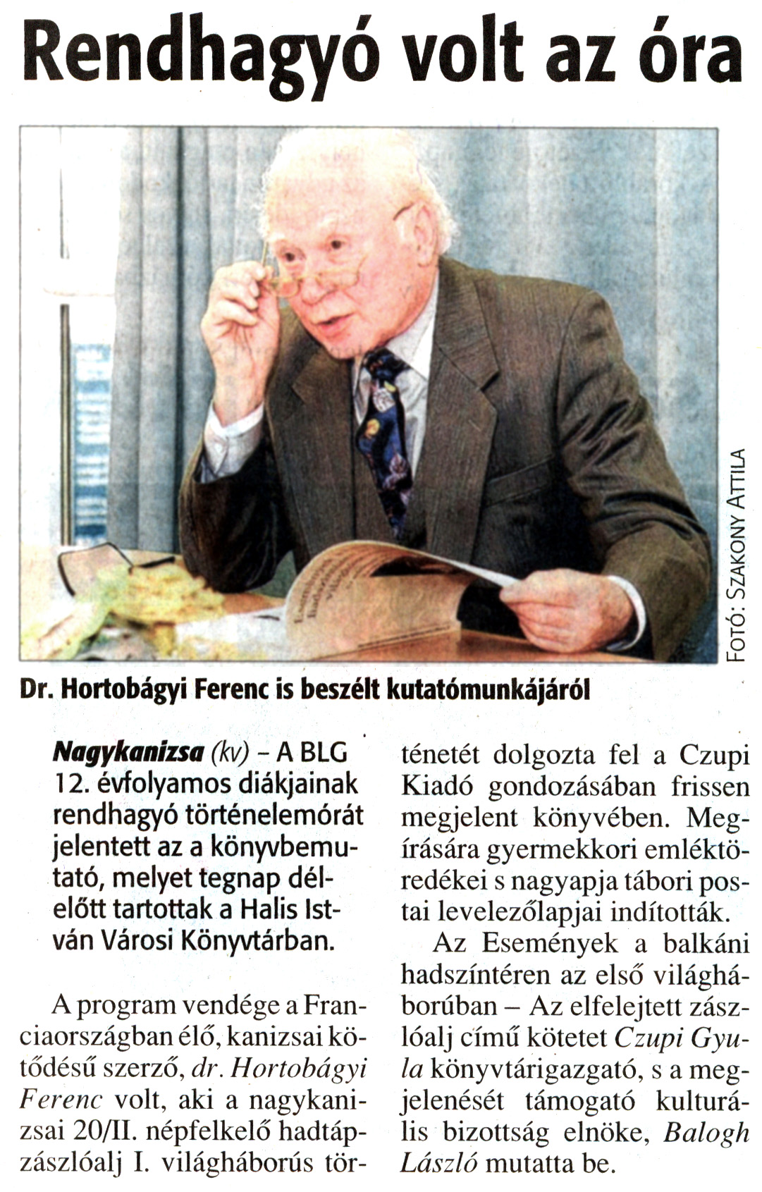 Nyilvános 1818 | 5151 | Zalai Hírlap 2011. március 23. 68. szám 3. oldal - Rendhagyó volt az óra | A cikk szövege: Rendhagyó volt az óra Dr. Hortobágyi Ferenc is beszélt kutatómunkájáról Nagykanizsa (kv) - A BLG 12. évfolyamos diákjainak rendhagyó történelemórát jelentett az a könyvbemutató, melyet tegnap délelőtt tartottak a Halis István Városi Könyvtárban. A program vendége a Franciaországban élő, kanizsai kötődésű szerző, dr. Hortobágyi Ferenc volt, aki a nagykanizsai 20/II. népfelkelő hadtápzászlóalj I. világháborús történetét dolgozta fel a Czupi Kiadó gondozásában frissen megjelent könyvében. Megírására gyermekkori emléktöredékei s nagyapja tábori postai levelezőlapjai indították. Az Események a balkáni hadszíntéren az első világháborúban - Az elfelejtett zászlóalj című kötetet Czupi Gyula könyvtárigazgató, s a megjelenését támogató kulturális bizottság elnöke, Balogh László mutatta be. Fotó: Szakony Attila |