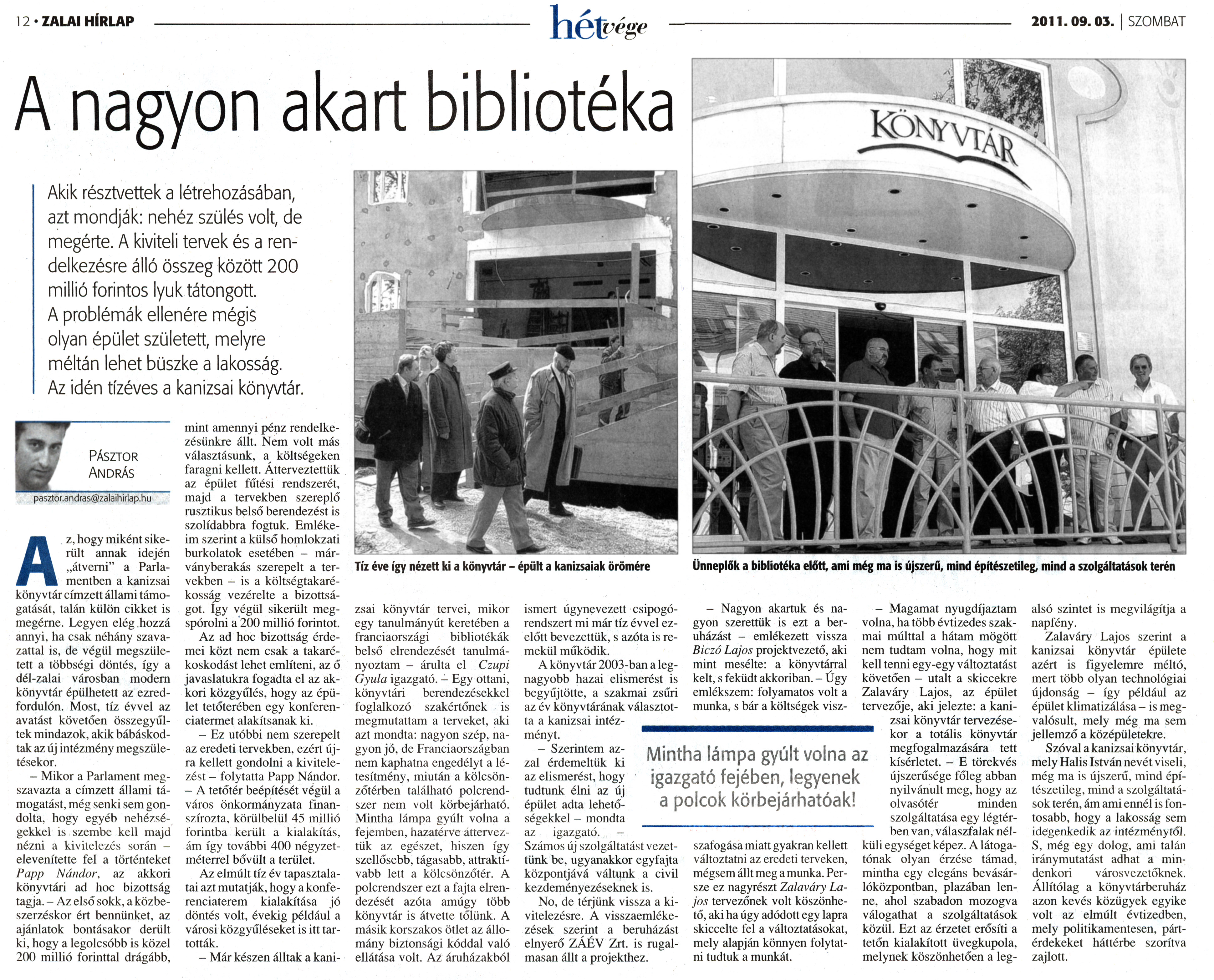 Nyilvános 2118 | 6835 | Zalai Hírlap 2011. szeptember 3. 206. szám 12. oldal - A nagyon akart bibliotéka | 12 ZALAI HÍRLAP 2011.09.03. SZOMBAT A nagyon akart bibliotéka Akik résztvettek a létrehozásában, azt mondják: nehéz szülés volt, de megérte. A kiviteli tervek és a rendelkezésre álló összeg között 200 millió forintos lyuk tátongott. A problémák ellenére mégis olyan épület született, melyre méltán lehet büszke a lakosság. Az idén tízéves a kanizsai könyvtár. Az, hogy miként sikerült annak idején „átverni" a Parlamentben a kanizsai könyvtár címzett állami támogatását, talán külön cikket is megérne. Legyen elég hozzá annyi, ha csak néhány szavazattal is, de végül megszületett a többségi döntés, így a dél-zalai városban modern könyvtár épülhetett az ezredfordulón. Most, tíz évvel az avatást követően összegyűltek mindazok, akik bábáskodtak az új intézmény megszületésekor. - Mikor a Parlament megszavazta a címzett állami támogatást, még senki sem gondolta, hogy egyéb nehézségekkel is szembe kell majd nézni a kivitelezés során - elevenítette fel a történteket Papp Nándor, az akkori könyvtári ad hoc bizottság tagja. - Az első sokk, a közbeszerzéskor ért bennünket, az ajánlatok bontásakor derült ki, hogy a legolcsóbb is közel 200 millió forinttal drágább, mint amennyi pénz rendelkezésünkre állt. Nem volt más választásunk, a költségeken faragni kellett. Átterveztettük az épület fűtési rendszerét, majd a tervekben szereplő rusztikus belső berendezést is szolidabbra fogtuk. Emlékeim szerint a külső homlokzati burkolatok esetében - márványberakás szerepelt a tervekben - is a költségtakarékosság vezérelte a bizottságot, így végül sikerült megspórolni a 200 millió forintot. Az ad hoc bizottság érdemei közt nem csak a takarékoskodást lehet említeni, az ő javaslatukra fogadta el az akkori közgyűlés, hogy az épület tetőterében egy konferenciatermet alakítsanak ki. - Ez utóbbi nem szerepelt az eredeti tervekben, ezért újra kellett gondolni a kivitelezést - folytatta Papp Nándor. - A tetőtér beépítését végül a város önkormányzata finanszírozta, körülbelül 45 millió forintba került a kialakítás, ám így további 400 négyzetméterrel bővült a terület. Az elmúlt tíz év tapasztalatai azt mutatják, hogy a konferenciaterem kialakítása jó döntés volt, évekig például a városi közgyűléseket is itt tartották. - Már készen álltak a kanizsai könyvtár tervei, mikor egy tanulmányút keretében a franciaországi bibliotékák belső elrendezését tanulmányoztam - árulta el Czupi Gyula igazgató. - Egy ottani, könyvtári berendezésekkel foglalkozó szakértőnek is megmutattam a terveket, aki azt mondta: nagyon szép, nagyon jó, de Franciaországban nem kaphatna engedélyt a létesítmény, miután a kölcsönzőtérben található polcrendszer nem volt körbejárható. Mintha lámpa gyúlt volna a fejemben, hazatérve átterveztük az egészet, hiszen így szellősebb, tágasabb, attraktívabb lett a kölcsönzőtér. A polcrendszer ezt a fajta elrendezését azóta amúgy több könyvtár is átvette tőlünk. A másik korszakos ötlet az állomány biztonsági kóddal való ellátása volt. Az áruházakból ismert úgynevezett csipogórendszert mi már tíz évvel ezelőtt bevezettük, s azóta is remekül működik. A könyvtár 2003-ban a legnagyobb hazai elismerést is begyűjtötte, a szakmai zsűri az év könyvtárának választotta a kanizsai intézményt. - Szerintem azzal érdemeltük ki az elismerést, hogy tudtunk élni az új épület adta lehetőségekkel - mondta az igazgató. -Számos új szolgáltatást vezettünk be, ugyanakkor egyfajta központjává váltunk a civil kezdeményezéseknek is. No, de térjünk vissza a kivitelezésre. A visszaemlékezések szerint a beruházást elnyerő ZAÉV Zrt. is rugalmasan állt a projekthez. - Nagyon akartuk és nagyon szerettük is ezt a beruházást - emlékezett vissza Biczó Lajos projektvezető, aki mint mesélte: a könyvtárral kelt, s feküdt akkoriban. - Úgy emlékszem: folyamatos volt a munka, s bár a költségek visszafogása miatt gyakran kellett változtatni az eredeti terveken, mégsem állt meg a munka. Persze ez nagyrészt Zalaváry Lajos tervezőnek volt köszönhető, aki ha úgy adódott egy lapra skiccelte fel a változtatásokat, mely alapján könnyen folytatni tudtuk a munkát. - Magamat nyugdíjaztam volna, ha több évtizedes szakmai múlttal a hátam mögött nem tudtam volna, hogy mit kell tenni egy-egy változtatást követően - utalt a skiccekre Zalaváry Lajos, az épület tervezője, aki jelezte: a kanizsai könyvtár tervezésekor a totális könyvtár megfogalmazására tett kísérletet. - E törekvés újszerűsége főleg abban nyilvánult meg, hogy az olvasótér minden szolgáltatása egy légtérben van, válaszfalak nélküli egységet képez. A látogatónak olyan érzése támad, mintha egy elegáns bevásárlóközpontban, plazában lenne, ahol szabadon mozogva válogathat a szolgáltatások közül. Ezt az érzetet erősíti a tetőn kialakított üvegkupola, melynek köszönhetően a legalsó szintet is megvilágítja a napfény. Zalaváry Lajos szerint a kanizsai könyvtár épülete azért is figyelemre méltó, mert több olyan technológiai újdonság - így például az épület klimatizálása - is megvalósult, mely még ma sem jellemző a középületekre. Szóval a kanizsai könyvtár, mely Halis István nevét viseli, még ma is újszerű, mind építészetileg, mind a szolgáltatások terén, ám ami ennél is fontosabb, hogy a lakosság sem idegenkedik az intézménytől. S, még egy dolog, ami talán iránymutatást adhat a mindenkori városvezetőknek. Állítólag a könyvtárberuház azon kevés közügyek egyike volt az elmúlt évtizedben, mely politikamentesen, pá