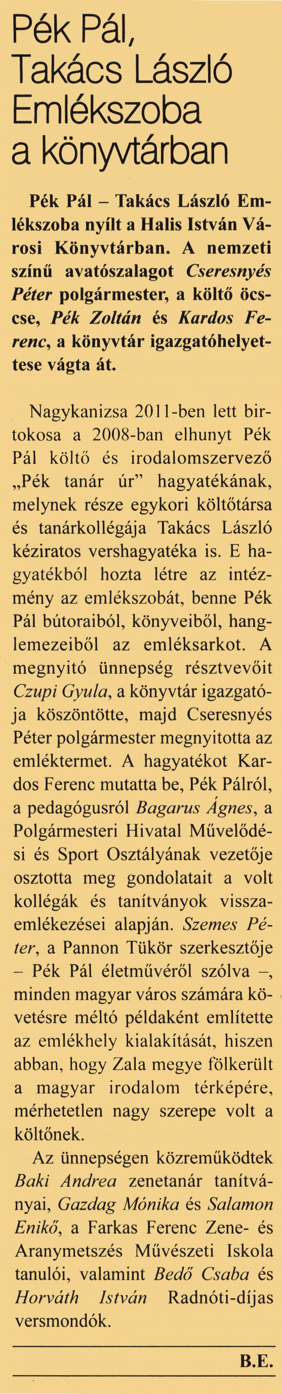 Nyilvános 2119 | 6617 | Kanizsa 2012. április 19. 15. szám 1. oldal - Pék Pál, Takács László Emlékszoba | Pék Pál, Takács László Emlékszoba a könyvtárban Pék Pál - Takács László Emlékszoba nyílt a Halis István Városi Könyvtárban. A nemzeti színű avatószalagot Cseresnyés Péter polgármester, a költő öccse, Pék Zoltán és Kardos Ferenc, a könyvtár igazgatóhelyettese vágta át. Nagykanizsa 2011-ben lett birtokosa a 2008-ban elhunyt Pék Pál költő és irodalomszervező „Pék tanár úr" hagyatékának, melynek része egykori költőtársa és tanárkollégája Takács László kéziratos vershagyatéka is. E hagyatékból hozta létre az intézmény az emlékszobát, benne Pék Pál bútoraiból, könyveiből, hanglemezeiből az emléksarkot. A megnyitó ünnepség résztvevőit Czupi Gyula, a könyvtár igazgatója köszöntötte, majd Cseresnyés Péter polgármester megnyitotta az emléktermet. A hagyatékot Kardos Ferenc mutatta be. Pék Pálról, a pedagógusról Bagarus Ágnes, a Polgármesteri Hivatal Művelődési és Sport Osztályának vezetője osztotta meg gondolatait a volt kollégák és tanítványok visszaemlékezései alapján. Szemes Péter, a Pannon Tükör szerkesztője - Pék Pál életművéről szólva -, minden magyar város számára követésre méltó példaként említette az emlékhely kialakítását, hiszen abban, hogy Zala megye fölkerült a magyar irodalom térképére, mérhetetlen nagy szerepe volt a költőnek. Az ünnepségen közreműködtek Baki Andrea zenetanár tanítványai, Gazdag Mónika és Salamon Enikő, a Farkas Ferenc Zene- és Aranymetszés Művészeti Iskola tanulói, valamint Bedő Csaba és Horváth István Radnóti-díjas versmondók. B.E. |
