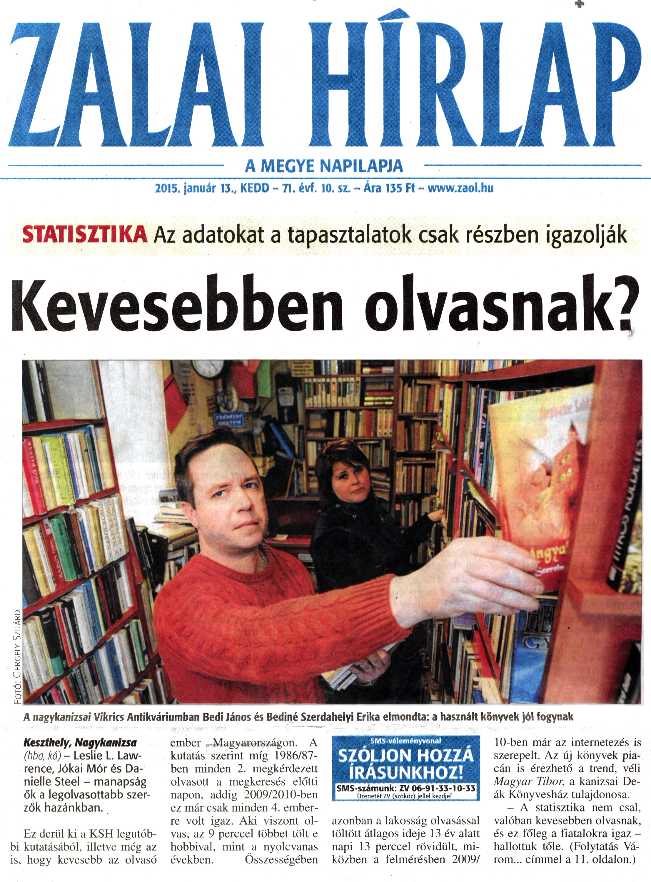 Nyilvános 1637 | 3370 | Zalai Hírlap 2015. január 13. 10. szám 1. oldal - Kevesebben olvasnak | HÍRLAP A MEGYE NAPILAPJA 2015. január 13., KEDD - 71. évf. 10. sz. - Ara 135 Ft - www.zaol.hu STATISZTIKA Az adatokat a tapasztalatok csak részben igazolják Kevesebben olvasnak? A nagykanizsai Vikrics Antikváriumban Bedi János és Bediné Szerdahelyi Erika elmondta: a használt könyvek jól fogynak Keszthely, Nagykanizsa (hba, ka) - Leslie L. Lawrence, Jókai Mór és Danielle Steel - manapság ők a legolvasottabb szerzők hazánkban. Ez derül ki a KSH legutóbbi kutatásából, illetve még az is, hogy kevesebb az olvasó ember Magyarországon. A kutatás szerint míg 1986/87-ben minden 2. megkérdezett olvasott a megkeresés előtti napon, addig 2009/2010-ben ez már csak minden 4. emberre volt igaz. Aki viszont olvas, az 9 perccel többet tölt e hobbival, mint a nyolcvanas években. Összességében azonban a lakosság olvasással töltött átlagos ideje 13 év alatt napi 13 perccel rövidült, miközben a felmérésben 2009/ 10-ben már az internetezés is szerepelt. Az új könyvek piacán is érezhető a trend, véli Magyar Tibor, a kanizsai Deák Könyvesház tulajdonosa. - A statisztika nem csal, valóban kevesebben olvasnak, és ez főleg a fiatalokra igaz - hallottuk tőle. (Folytatás Várom... címmel a 11. oldalon.) |
