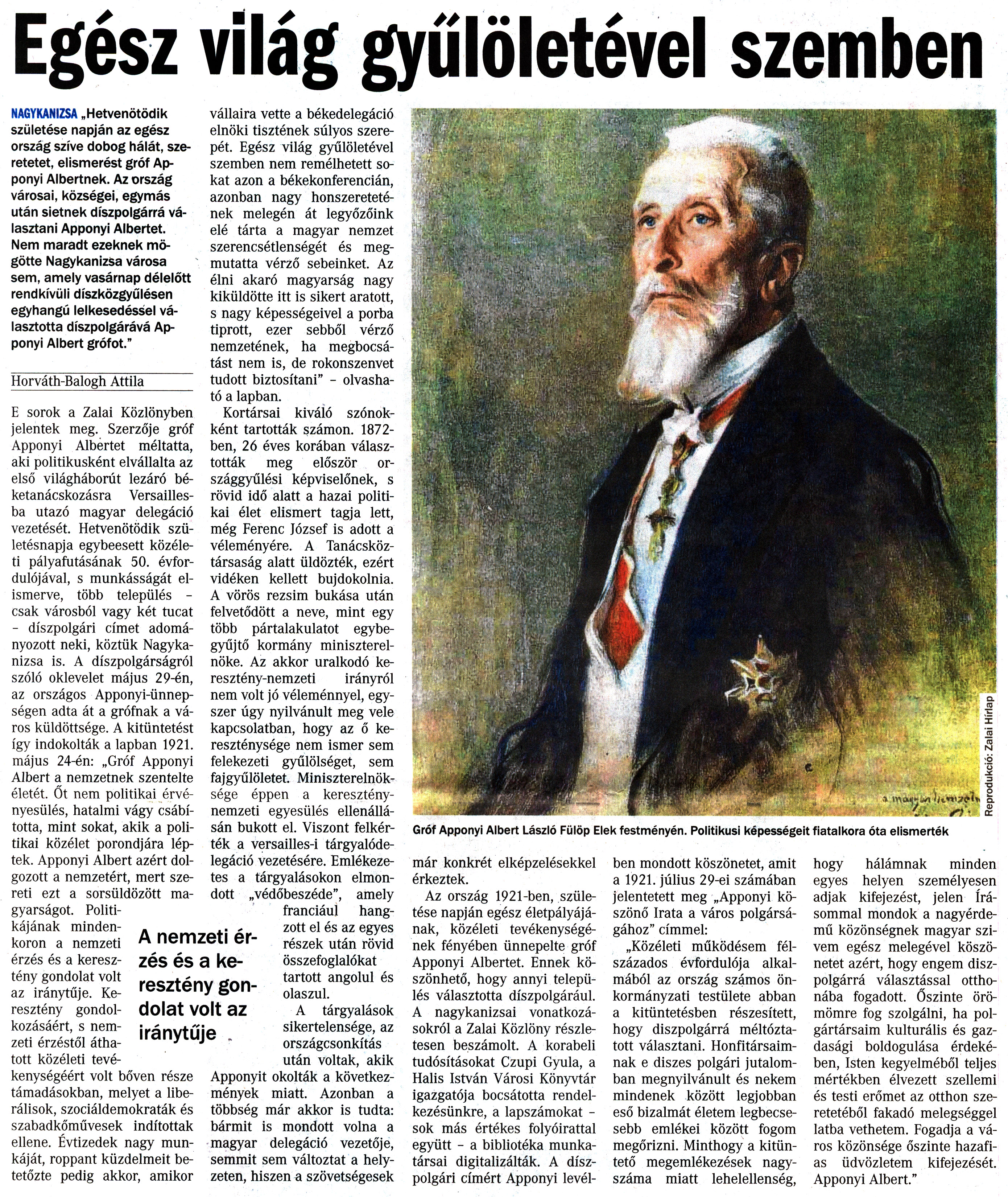 Nyilvános 1601 | 3051 | Vasárnapi Zalai Hírlap 2018. június 23. 25. szám 5. oldal | Egész világ gyűlöletével szemben Gróf Apponyi Albert László Fülöp Elek festményén. Politikusi képességeit fiatalkora óta elismerték NAGYKANIZSA „Hetvenötödik születése napján az egész ország szíve dobog hálát, szeretetet, elismerést gróf Apponyi Albertnek. Az ország városai, községei, egymás után sietnek díszpolgárrá választani Apponyi Albertet. Nem maradt ezeknek mögötte Nagykanizsa városa sem, amely vasárnap délelőtt rendkívüli díszközgyűlésen egyhangú lelkesedéssel választotta díszpolgárává Apponyi Albert grófot." Horváth-Balogh Attila_ E sorok a Zalai Közlönyben jelentek meg. Szerzője gróf Apponyi Albertet méltatta, aki politikusként elvállalta az első világháborút lezáró béketanácskozásra Versailles-ba utazó magyar delegáció vezetését. Hetvenötödik születésnapja egybeesett közéleti pályafutásának 50. évfordulójával, s munkásságát elismerve, több település -csak városból vagy két tucat - díszpolgári címet adományozott neki, köztük Nagykanizsa is. A díszpolgárságról szóló oklevelet május 29-én, az országos Apponyi-ünnep-ségen adta át a grófnak a város küldöttsége. A kitüntetést így indokolták a lapban 1921. május 24-én: „Gróf Apponyi Albert a nemzetnek szentelte életét. Őt nem politikai érvényesülés, hatalmi vágy csábította, mint sokat, akik a politikai közélet porondjára léptek. Apponyi Albert azért dolgozott a nemzetért, mert szereti ezt a sorsüldözött magyarságot. Politikájának mindenkoron a nemzeti érzés és a keresztény gondolat volt az iránytűje. Keresztény gondolkozásáért, s nemzeti érzéstől áthatott közéleti tevékenységéért volt bőven része támadásokban, melyet a liberálisok, szociáldemokraták és szabadkőművesek indítottak ellene. Évtizedek nagy munkáját, roppant küzdelmeit betetőzte pedig akkor, amikor vállaira vette a békedelegáció elnöki tisztének súlyos szerepét. Egész világ gyűlöletével szemben nem remélhetett sokat azon a békekonferencián, azonban nagy honszeretetének melegén át legyőzőink elé tárta a magyar nemzet szerencsétlenségét és megmutatta vérző sebeinket. Az élni akaró magyarság nagy kiküldötte itt is sikert aratott, s nagy képességeivel a porba tiprott, ezer sebből vérző nemzetének, ha megbocsátást nem is, de rokonszenvet tudott biztosítani" - olvasható a lapban. Kortársai kiváló szónokként tartották számon. 1872-ben, 26 éves korában választották meg először országgyűlési képviselőnek, s rövid idő alatt a hazai politikai élet elismert tagja lett, még Ferenc József is adott a véleményére. A Tanácsköztársaság alatt üldözték, ezért vidéken kellett bujdokolnia. A vörös rezsim bukása után felvetődött a neve, mint egy több pártalakulatot egybe-gyűjtő kormány miniszterelnöke. Az akkor uralkodó keresztény-nemzeti irányról nem volt jó véleménnyel, egyszer úgy nyilvánult meg vele kapcsolatban, hogy az ő kereszténysége nem ismer sem felekezeti gyűlölséget, sem fajgyűlöletet. Miniszterelnöksége éppen a kereszténynemzeti egyesülés ellenállásán bukott el. Viszont felkérték a versailles-i tárgyalódelegáció vezetésére. Emlékezetes a tárgyalásokon elmondott „védőbeszéde", amely franciául hangzott el és az egyes részek után rövid összefoglalókat tartott angolul és olaszul. A tárgyalások sikertelensége, az országcsonkítás után voltak, akik Apponyit okolták a következmények miatt. Azonban a többség már akkor is tudta: bármit is mondott volna a magyar delegáció vezetője, semmit sem változtat a helyzeten, hiszen a szövetségesek már konkrét elképzelésekkel érkeztek. Az ország 1921-ben, születése napján egész életpályájának, közéleti tevékenységének fényében ünnepelte gróf Apponyi Albertet. Ennek köszönhető, hogy annyi település választotta díszpolgárául. A nagykanizsai vonatkozásokról a Zalai Közlöny részletesen beszámolt. A korabeli tudósításokat Czupi Gyula, a Halis István Városi Könyvtár igazgatója bocsátotta rendelkezésünkre, a lapszámokat -sok más értékes folyóirattal együtt - a bibliotéka munkatársai digitalizálták. A díszpolgári címért Apponyi levél- ben mondott köszönetet, amit a 1921. július 29-ei számában jelentetett meg „Apponyi köszönő Irata a város polgárságához" címmel: „Közéleti működésem félszázados évfordulója alkalmából az ország számos önkormányzati testülete abban a kitüntetésben részesített, hogy díszpolgárrá méltóztatott választani. Honfitársaimnak e diszes polgári jutalomban megnyilvánult és nekem mindenek között legjobban eső bizalmát életem legbecsesebb emlékei között fogom megőrizni. Minthogy a kitüntető megemlékezések nagyszáma miatt lehelellenség, hogy hálámnak minden egyes helyen személyesen adjak kifejezést, jelen írásommal mondok a nagyérdemű közönségnek magyar szivem egész melegével köszönetet azért, hogy engem díszpolgárrá választással otthonába fogadott. Őszinte örömömre fog szolgálni, ha polgártársaim kulturális és gazdasági boldogulása érdekében, Isten kegyelméből teljes mértékben élvezett szellemi és testi erőmet az otthon szeretetéből fakadó melegséggel latba vethetem. Fogadja a város közönsége őszinte hazafias üdvözletem kifejezését. Apponyi Albert." A nemzeti érzés és a keresztény gondolat volt az iránytűje . |