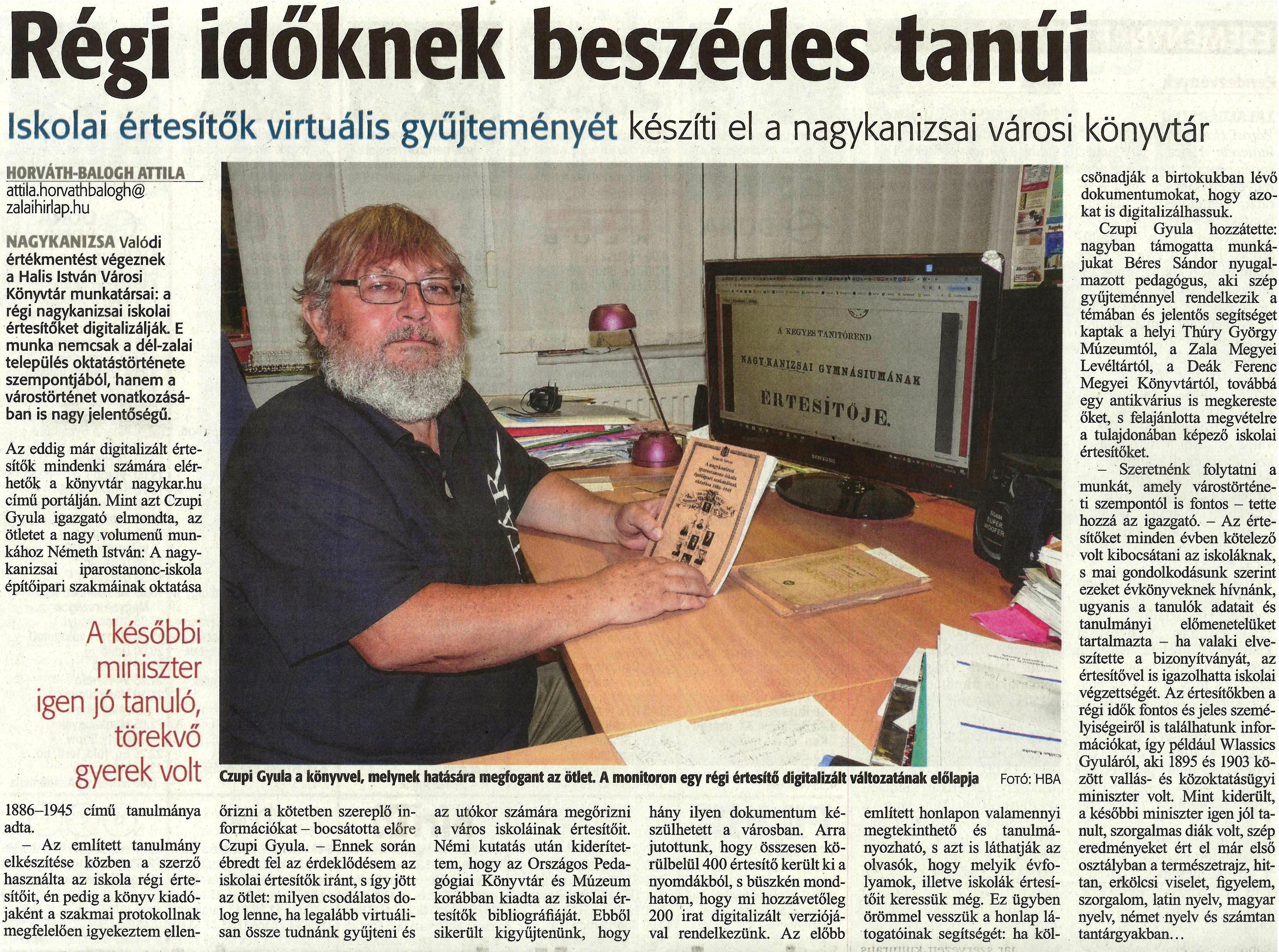 Nyilvános 1213 | 2220 | Régi időknek beszédes tanúi | Iskolai értesítők virtuális gyűjteményét készíti el a nagykanizsai városi könyvtár HORVÁTH-BALOGH ATTILA attila.horvathbalogh@zalaihirlap.hu NAGYKANIZSA Valódi értékmentést végeznek a Halis István Városi Könyvtár munkatársai: a régi nagykanizsai iskolai értesítőket digitalizálják. E munka nemcsak a dél-zalai település oktatástörténete szempontjából, hanem a várostörténet vonatkozásában is nagy jelentőségű. Az eddig már digitalizált értesítők mindenki számára elérhetők a könyvtár nagykar.hu című portálján. Mint azt Czupi Gyula igazgató elmondta, az ötletet a nagy volumenű munkához Németh István: A nagykanizsai iparostanonc-iskola építőipari szakmáinak oktatása - A későbbi miniszter igen jó tanuló, törekvő gyerek volt - 1886-1945 című tanulmánya adta. -Az említett tanulmány elkészítése közben a szerző használta az iskola régi értesítőit, én pedig a könyv kiadójaként a szakmai protokollnak megfelelően igyekeztem ellenőrizni a kötetben szereplő információkat - bocsátotta előre Czupi Gyula. - Ennek során ébredt fel az érdeklődésem az iskolai értesítők iránt, s így jött az ötlet: milyen csodálatos dolog lenne, ha legalább virtuálisan össze tudnánk gyűjteni és az utókor számára megőrizni a város iskoláinak értesítőit. Némi kutatás után kiderítettem, hogy az Országos Pedagógiai Könyvtár és Múzeum korábban kiadta az iskolai értesítők bibliográfiáját. Ebből sikerült kigyűjtenünk, hogy hány ilyen dokumentum készülhetett a városban. Arra jutottunk, hogy összesen körülbelül 400 értesítő került ki a nyomdákból, s büszkén mondhatom, hogy mi hozzávetőleg 200 irat digitalizált verziójával rendelkezünk. Az előbb említett honlapon valamennyi megtekinthető és tanulmányozható, s azt is láthatják az olvasók, hogy melyik évfolyamok, illetve iskolák értesítőit keressük még. Ez ügyben örömmel vesszük a honlap látogatóinak segítségét: ha kölcsönadják a birtokukban lévő dokumentumokat, hogy azokat is digitalizálhassuk. Czupi Gyula hozzátette: nagyban támogatta munkájukat Béres Sándor nyugalmazott pedagógus, aki szép gyűjteménnyel rendelkezik a témában és jelentős segítséget kaptak a helyi Thúry György Múzeumtól, a Zala Megyei Levéltártól, a Deák Ferenc Megyei Könyvtártól, továbbá egy antikvárius is megkereste őket, s felajánlotta megvételre a tulajdonában képező iskolai értesítőket. - Szeretnénk folytatni a munkát, amely várostörténeti szempontéi is fontos - tette hozzá az igazgató. - Az értesítőket minden évben kötelező volt kibocsátani az iskoláknak, s mai gondolkodásunk szerint ezeket évkönyveknek hívnánk, ugyanis a tanulók adatait és tanulmányi előmenetelüket tartalmazta - ha valaki elveszítette a bizonyítványát, az értesítővel is igazolhatta iskolai végzettségét. Az értesítőkben a régi idők fontos és jeles személyiségeiről is találhatunk információkat, így például Wlassics Gyuláról, aki 1895 és 1903 között vallás- és közoktatásügyi miniszter volt. Mint kiderült, a későbbi miniszter igen jól tanult, szorgalmas diák volt, szép eredményeket ért el már első osztályban a természetrajz, hittan, erkölcsi viselet, figyelem, szorgalom, latin nyelv, magyar nyelv, német nyelv és számtan tantárgyakban... Czupi Gyula a könyvvel, melynek hatására megfogant az ötlet. A monitoron egy régi értesítő digitalizált változatának előlapja Fotó: HBA |
